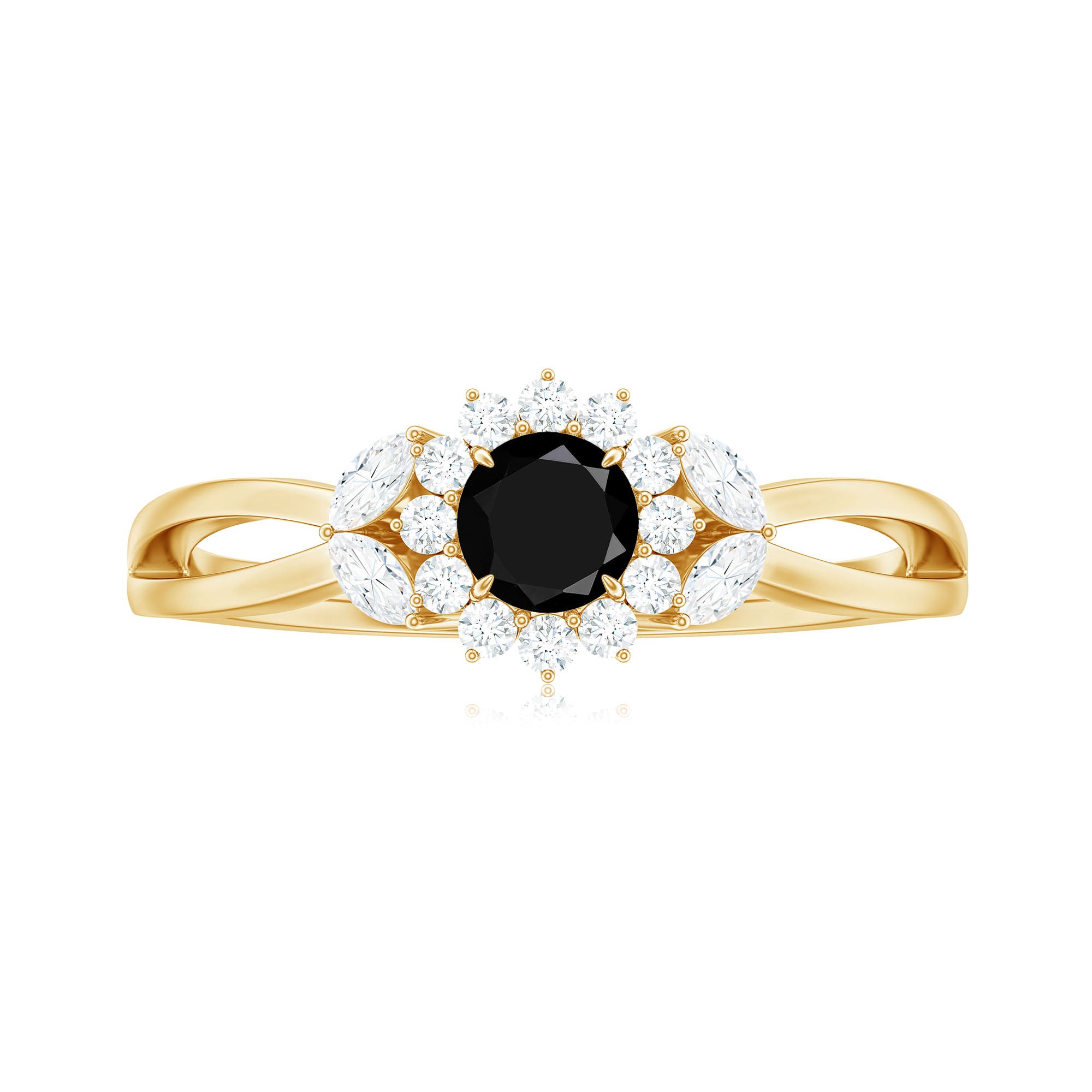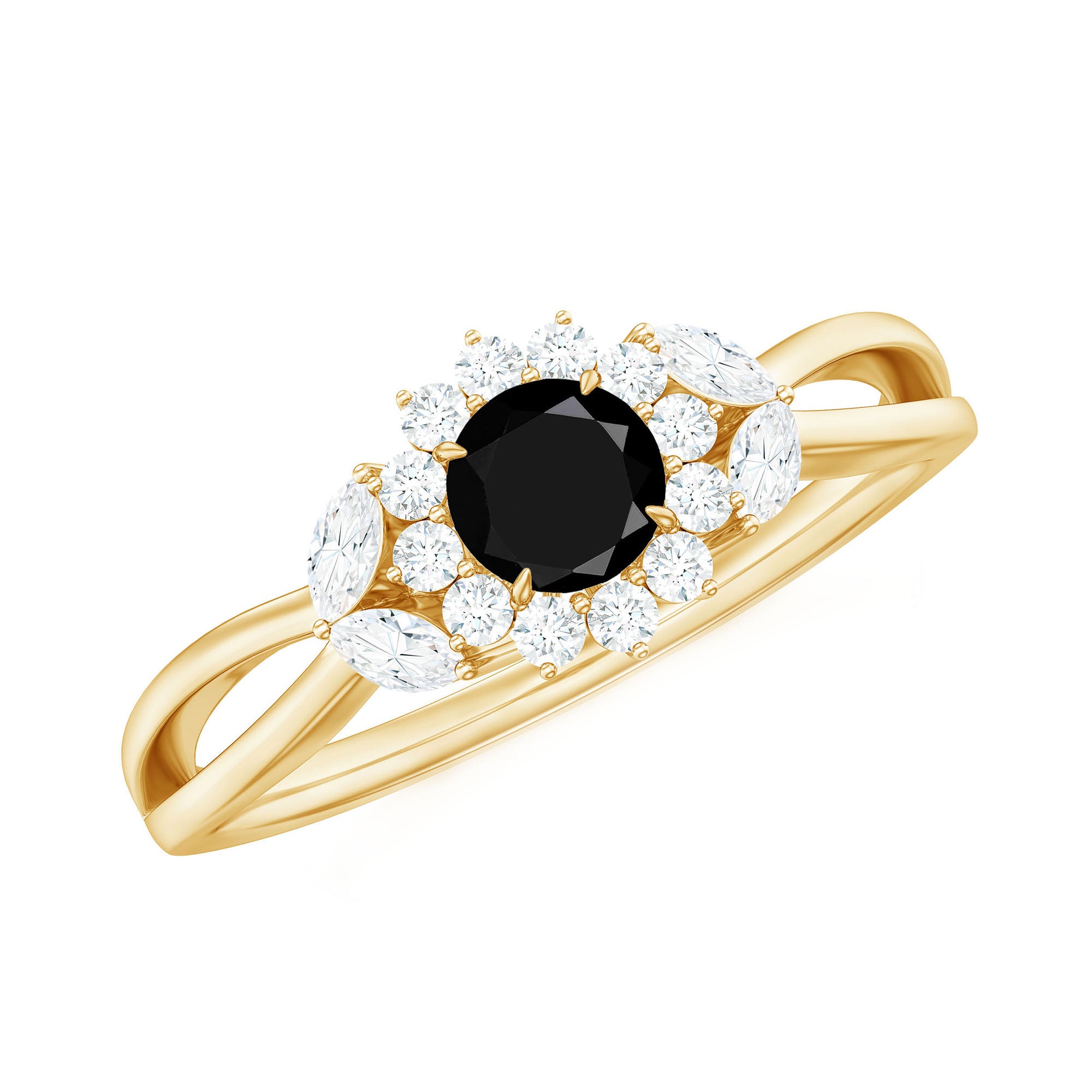 The split structure also frames the center design, allowing the gemstone arrangement to appear more prominent within the ring.