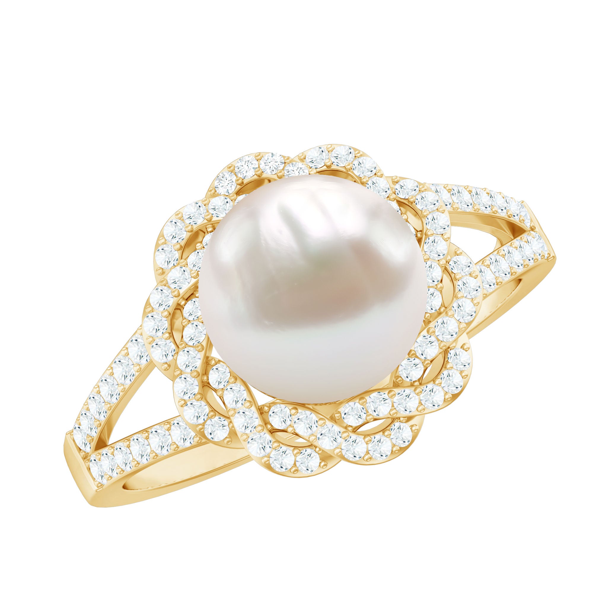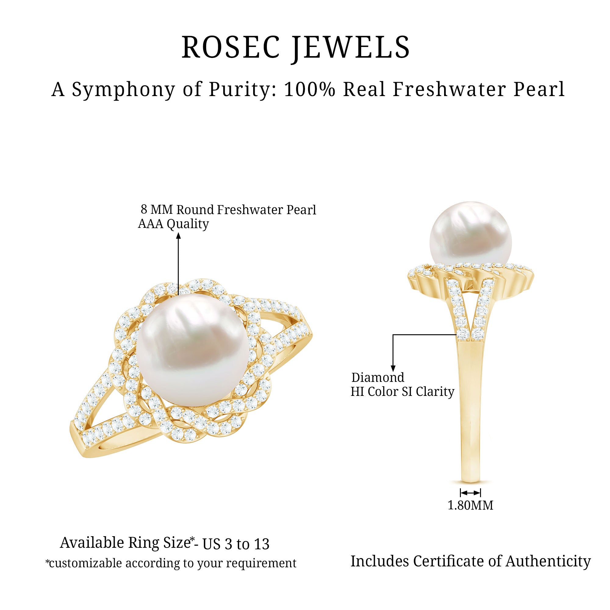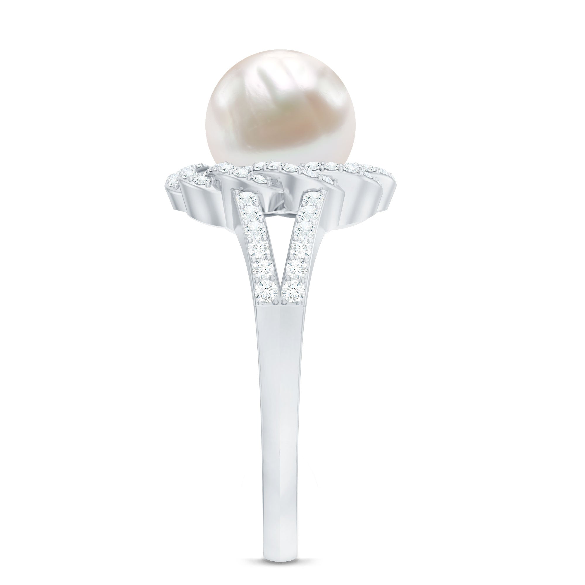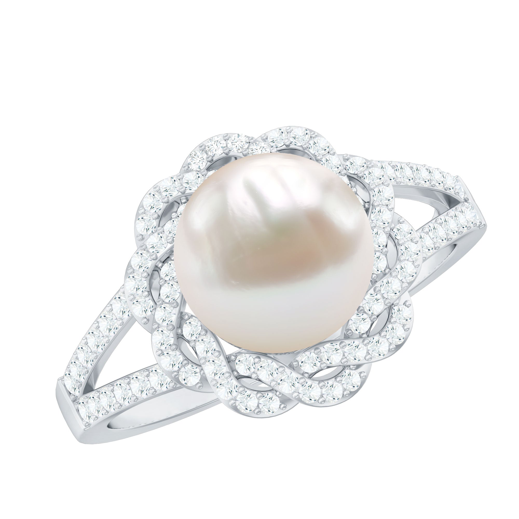 Enchanting braided ring is featuring Freshwater Pearl and Diamond, makes for an amazing Statement Ring. Freshwater Pearl exhibits AAA Quality and possess subtle color. Semi Precious June Birthstone summons faith and innocence. It is Natural and Certified, helps in enhancing personal integrity and grow sincerity of the wearer. The extremely durable nature and luster makes it a captivating and desirable gem. Diamond - HI-SI Quality exhibited by Brilliant Cut Diamond give justice to its incredible value. Diamond summons beauty, attractiveness and unbreakable love. It is Certified and helps in bringing success and luxury to the wearer. Its Durability and Luster is enhanced by Lab Created Treatment, to further make it a captivating and desirable gem.