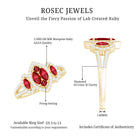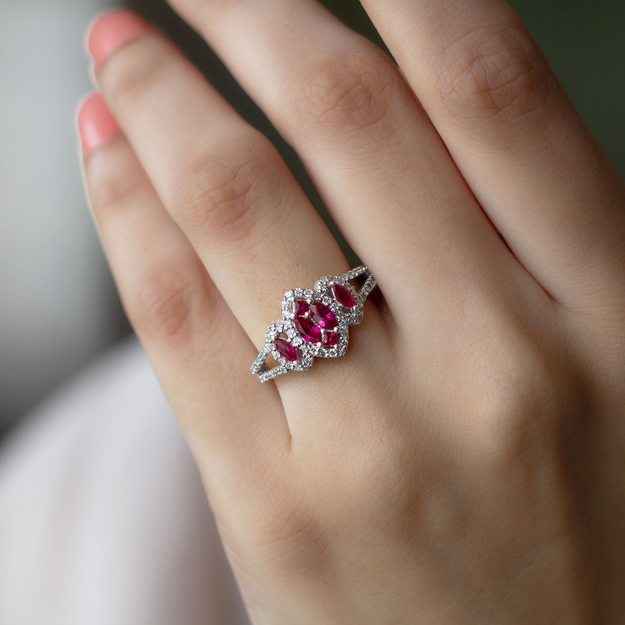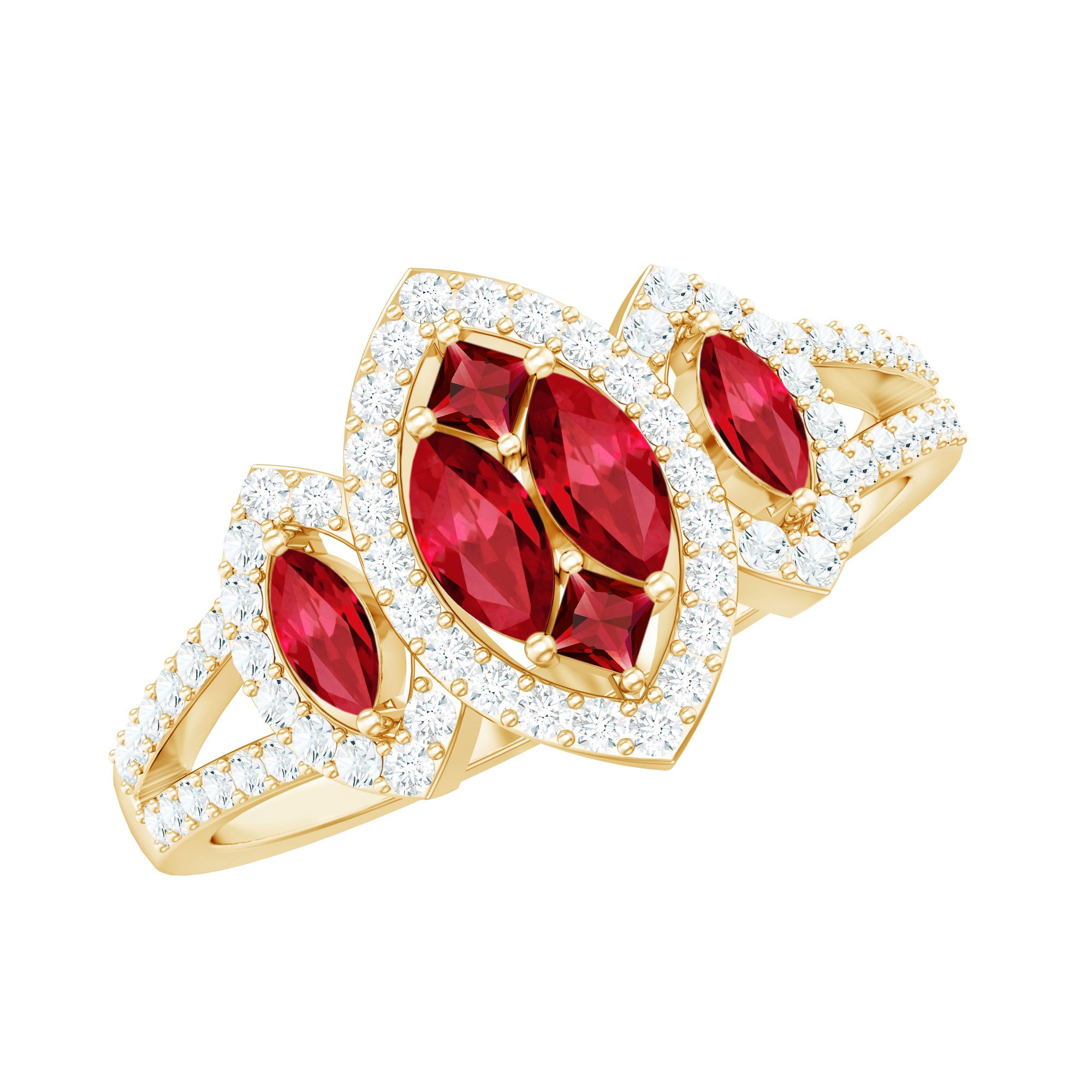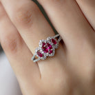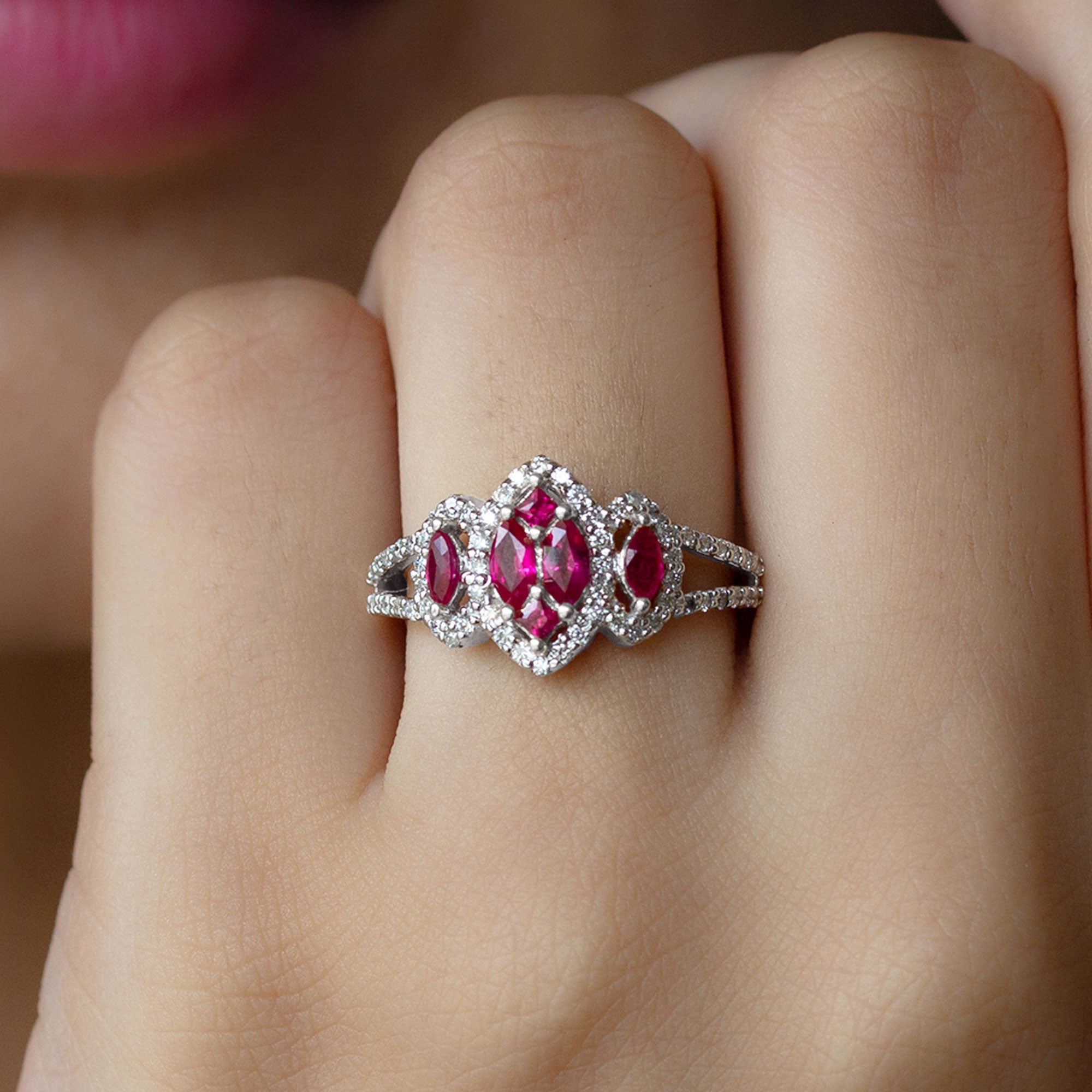 Presents an elegant ring showcasing a central cluster design embellished with Marquise and Princess-cut created ruby gemstones on a split shank that gracefully extends along the band. The center stone is accentuated by dazzling round-cut Diamond stones, creating an enchanting and memorable appearance.