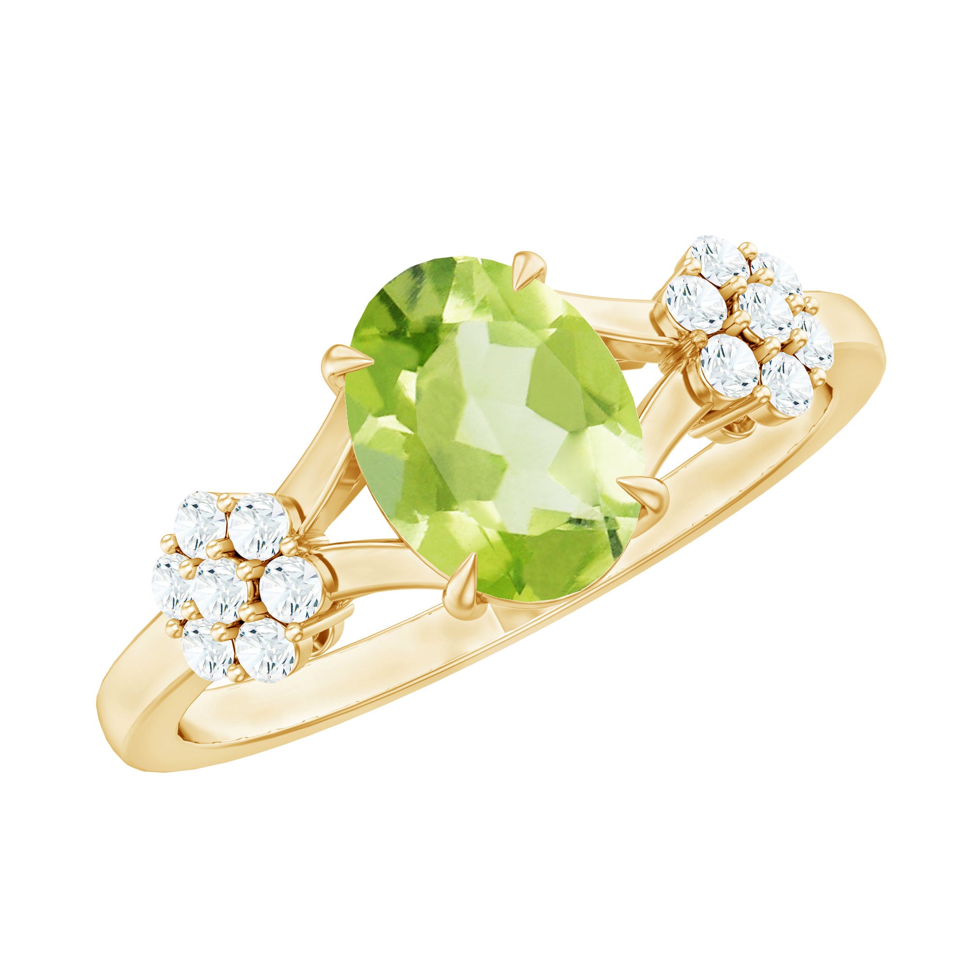 Draw attention to your style with this Cocktail Ring adorned with Oval Cut Peridot in Claw Setting with Round Moissanite Stones set in flower pattern on either side. The Flower Ring is molded in Gold metal and has a unique and luxurious design that is perfect for special occasions. This Split Shank Ring is a perfect statement piece that adds a touch of sophistication and glamour to any outfit.