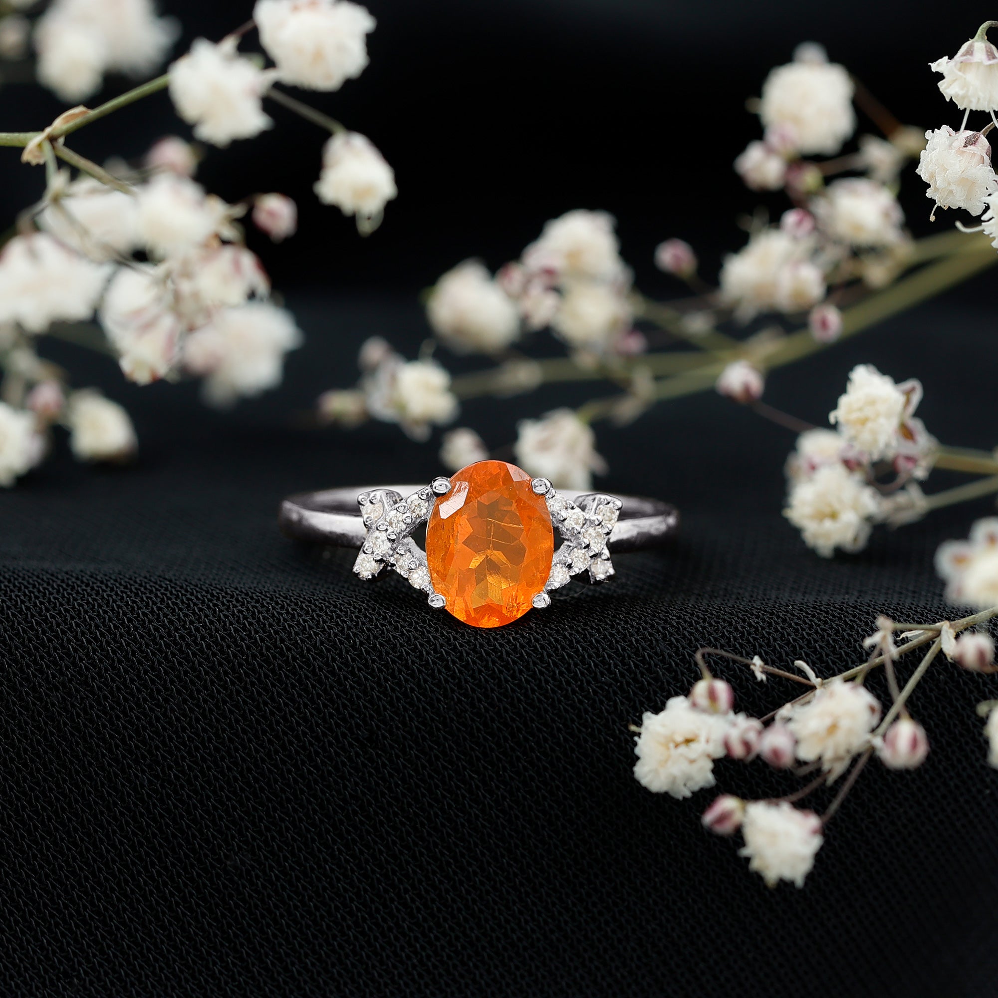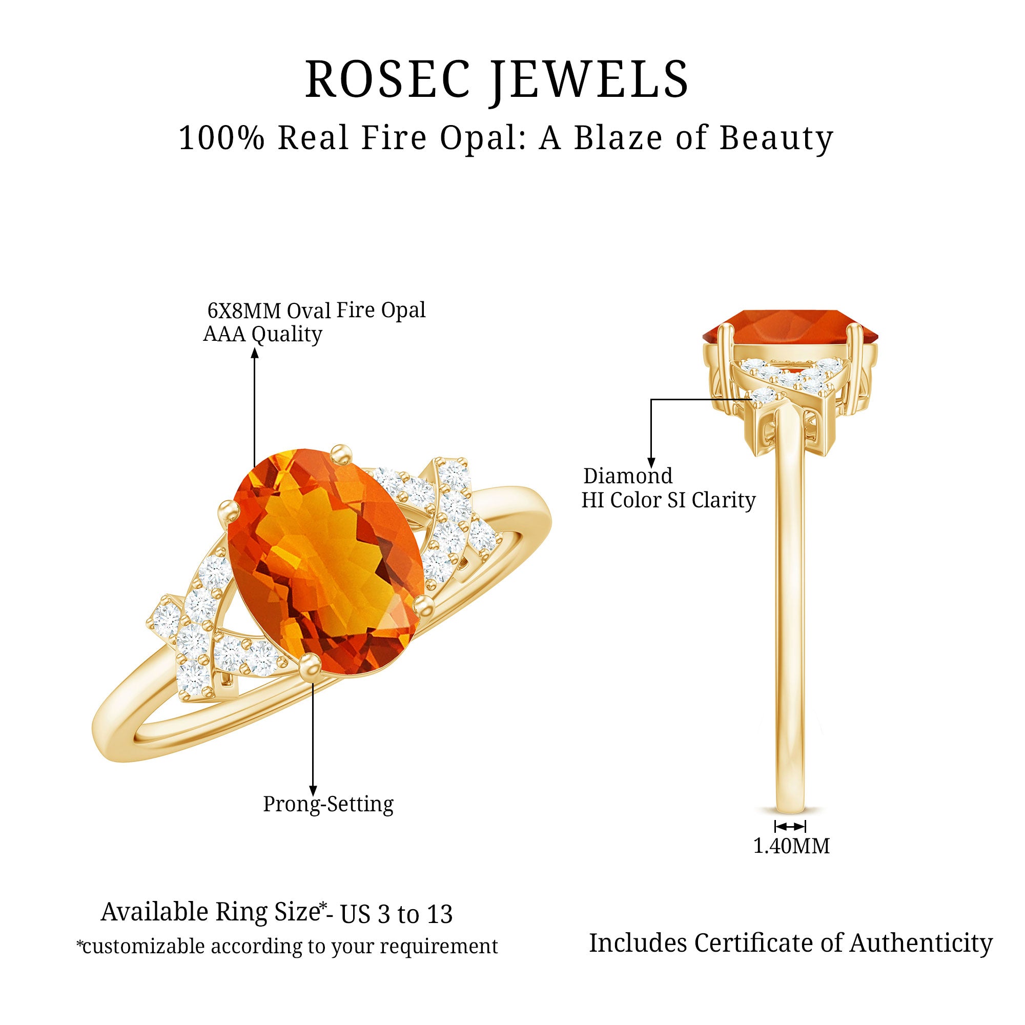 Propose with this stunning Fire Opal Engagement Ring and be ready for a flood of compliments. The 6X8 MM oval cut fire opal in a prong setting, paired with round Diamond accent on the solitaire engagement ring, symbolizes your commitment for a lifetime. This unique oval fire opal solitaire ring will steal her heart. The ring has a total weight of 1.25 carats and boasts a HI color and SI clarity, ensuring the highest quality. All of our gemstones are certified and undergo rigorous quality checks.