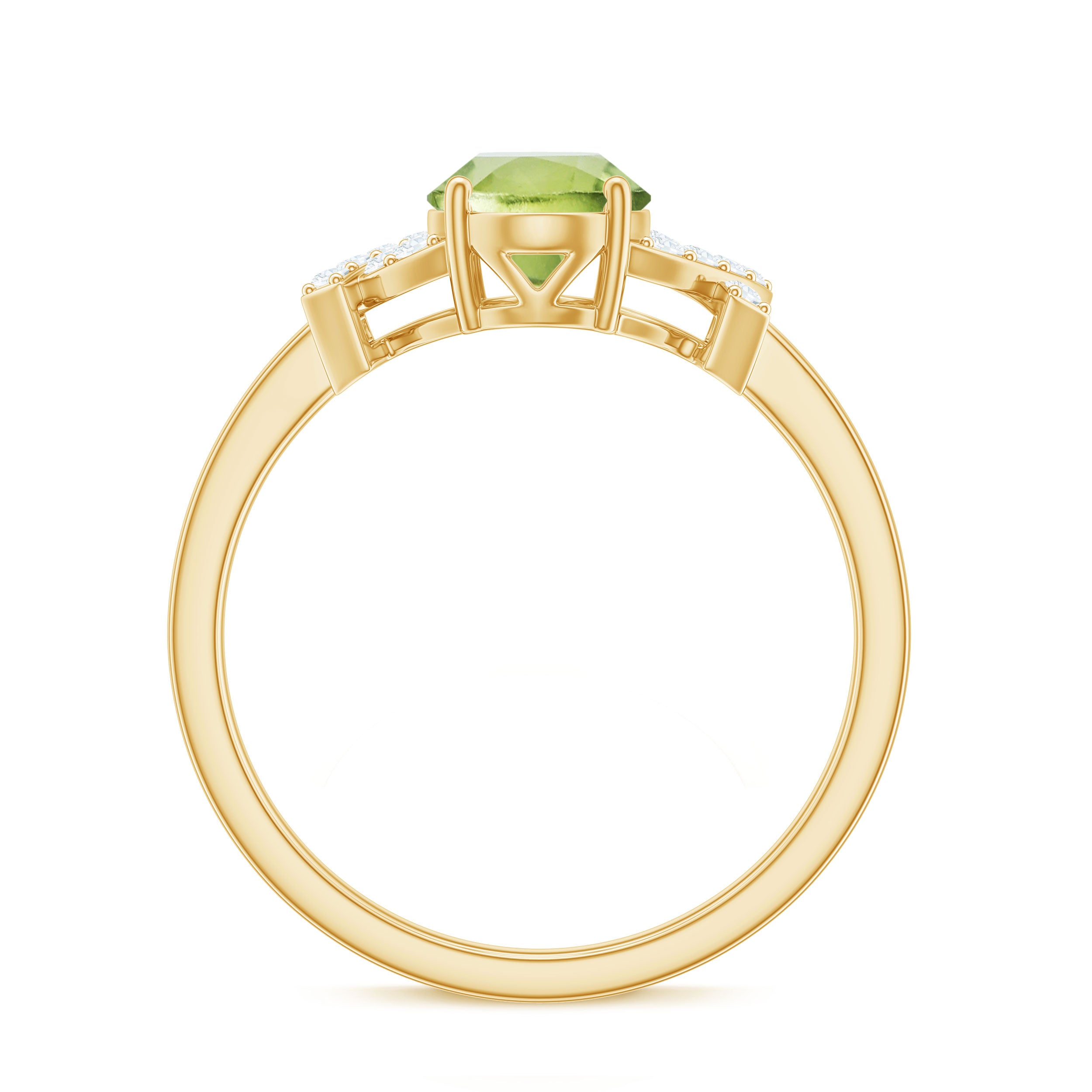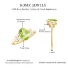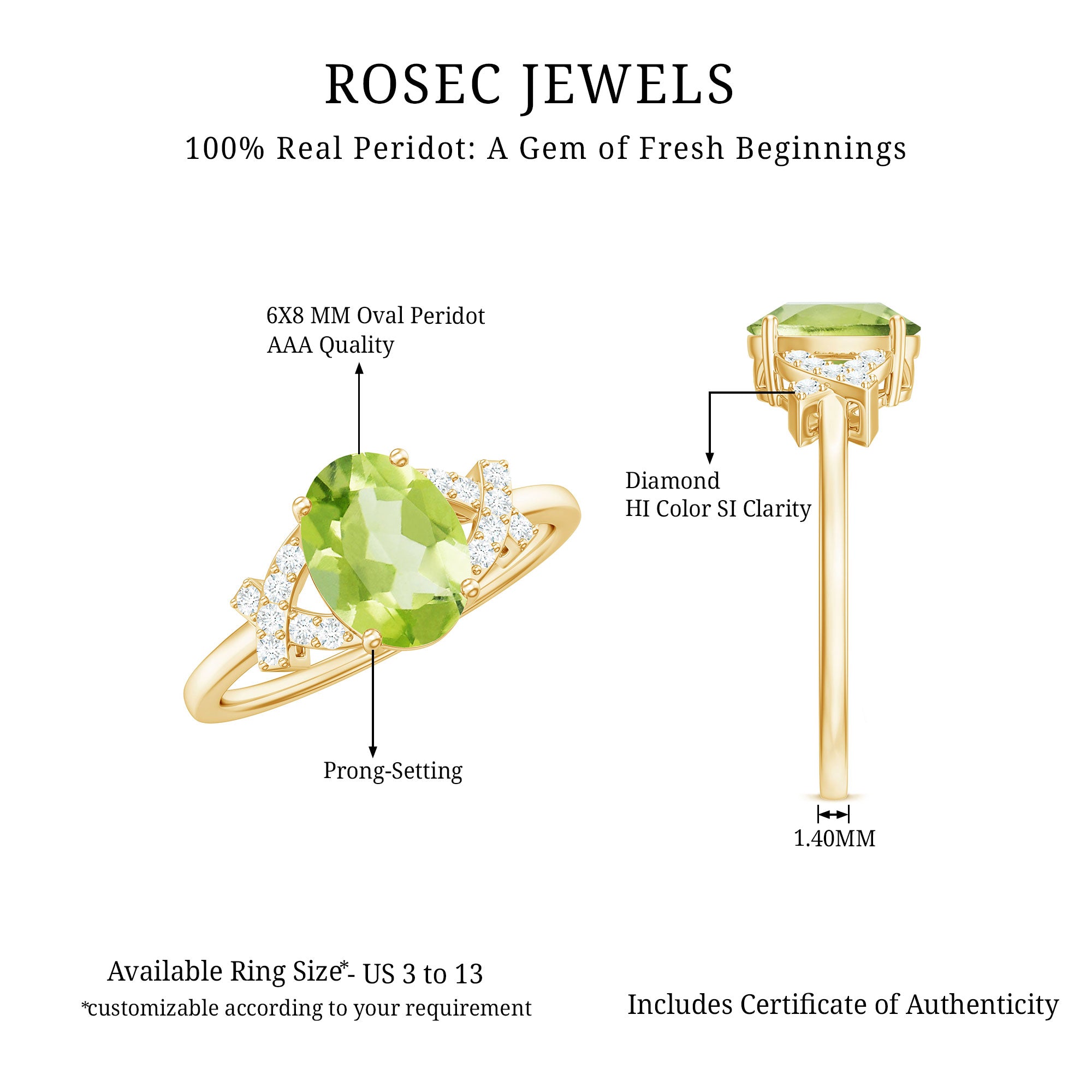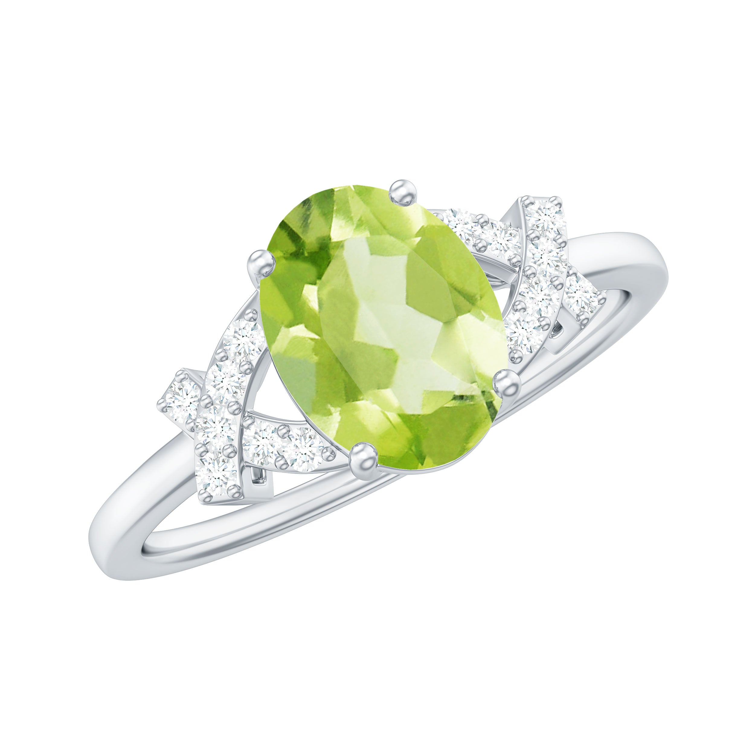 Present her this stunning Peridot Engagement Ring and be ready for a flood of compliments. The 6X8 MM oval cut Peridot in a prong setting, paired with round Diamond accent on the solitaire engagement ring with Split Shank, symbolizes your commitment for a lifetime. This unique solitaire ring will steal her heart. The ring has a total weight of 1.25 carats and boasts AAA quality, ensuring the highest quality. All of our gemstones are certified and undergo rigorous quality checks.