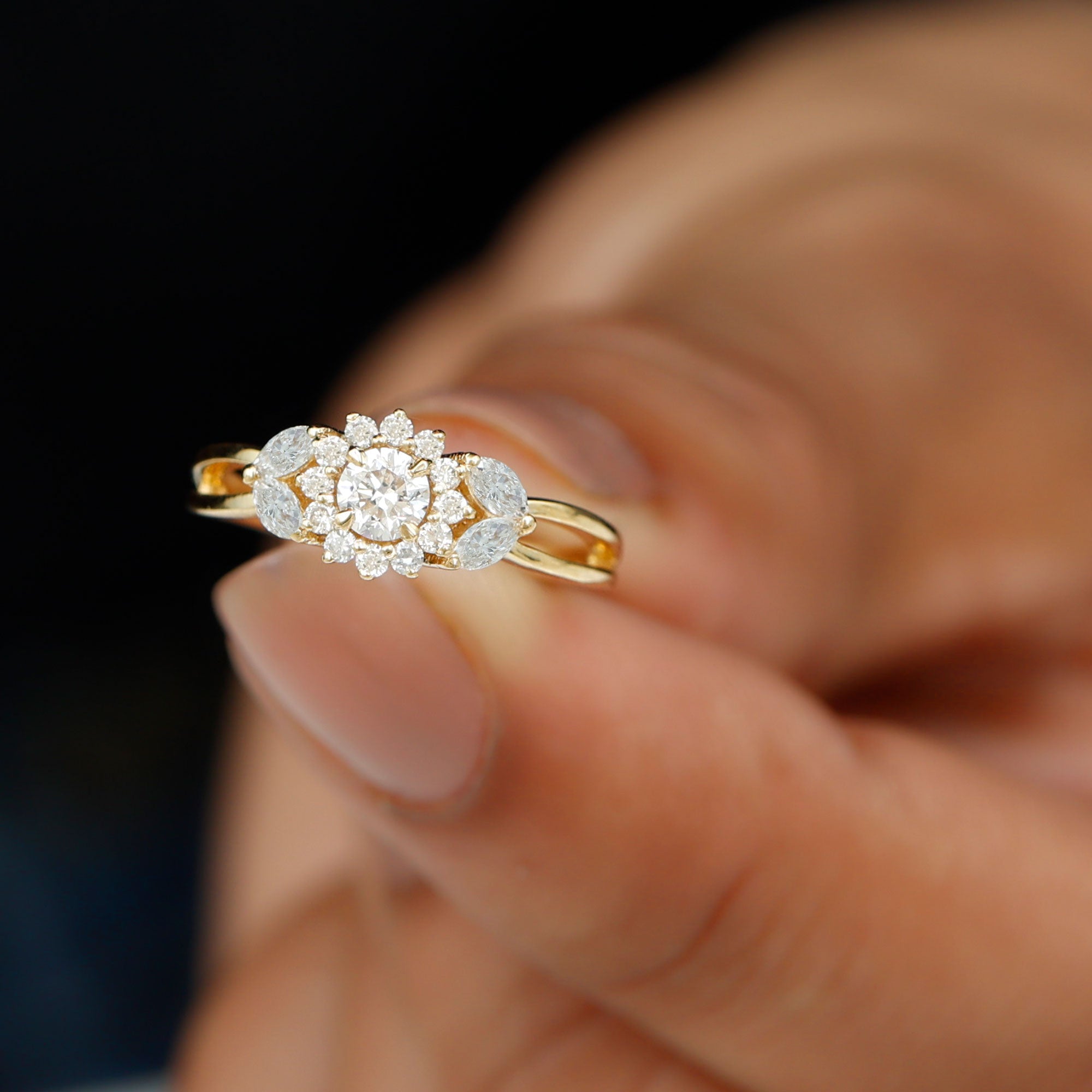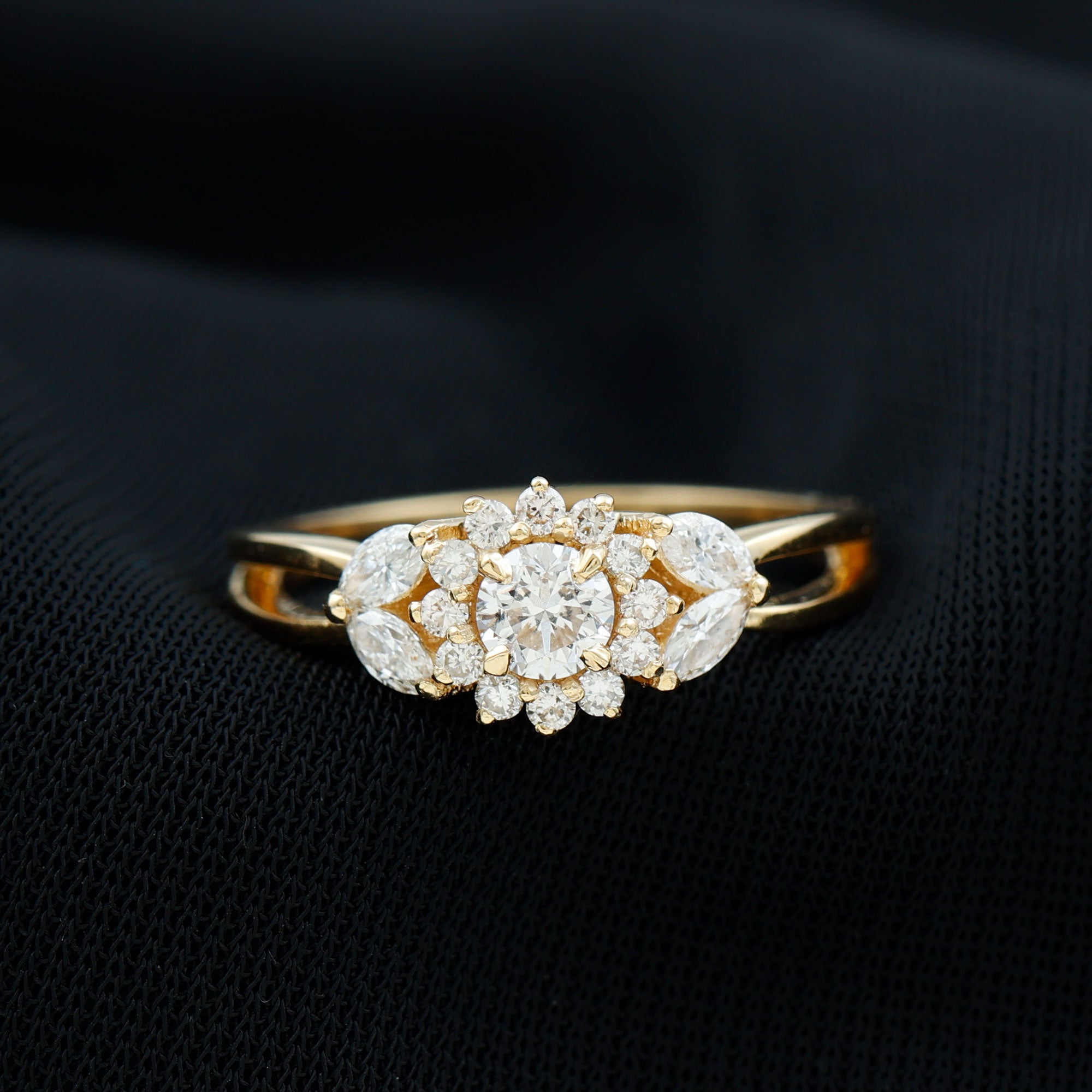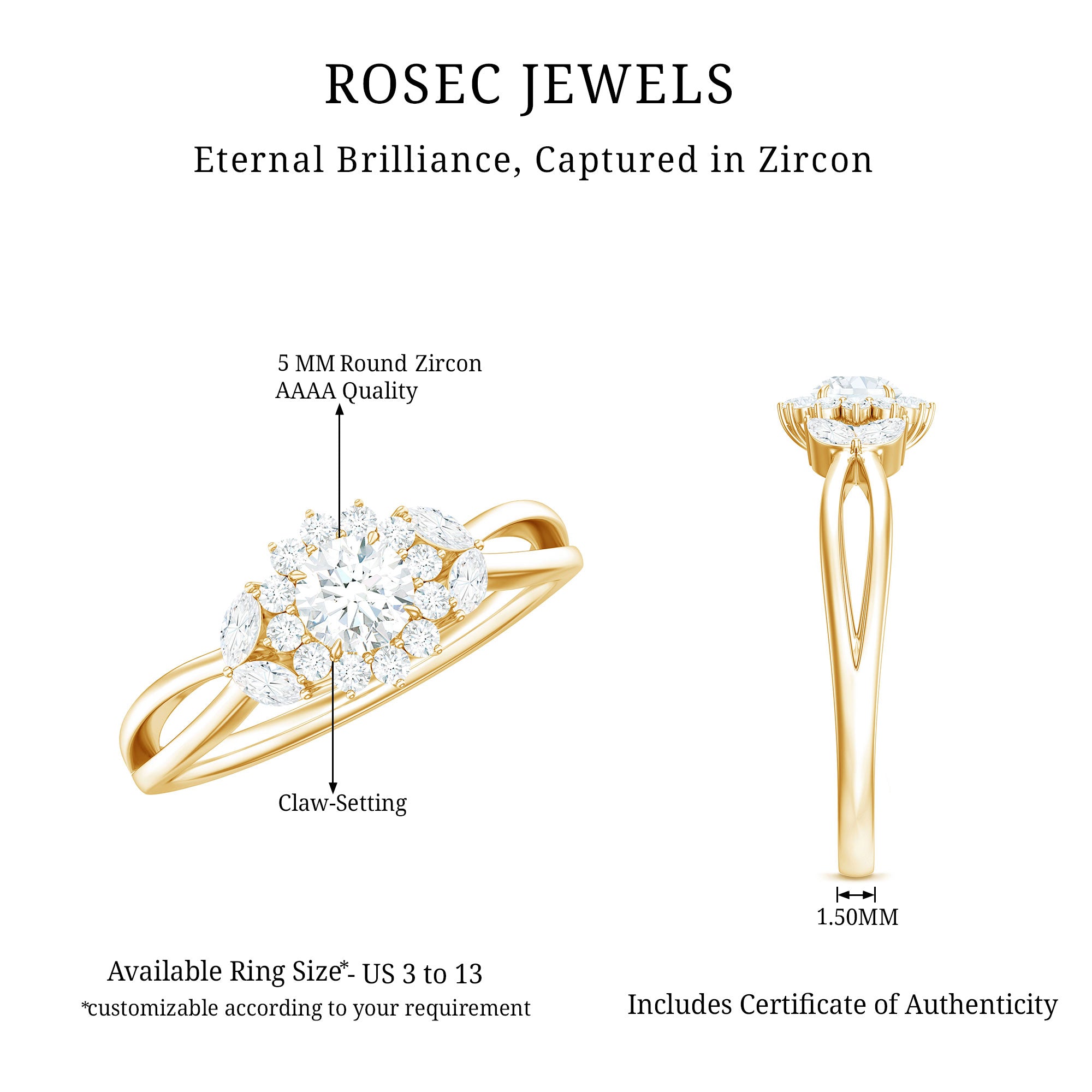 Featuring an exquisite floral motif, this Flower Engagement Ring is the perfect way to commemorate your special day. Adorned with both Round and Marquise-Cut Zircons in a secure claw and Prong Setting in Split Shank, this Engagement Ring for Women is truly a work of art. Crafted from high-quality Solid Gold, this Zircon Split Shank Engagement Ring radiates luxury and elegance, making it a truly stunning choice.