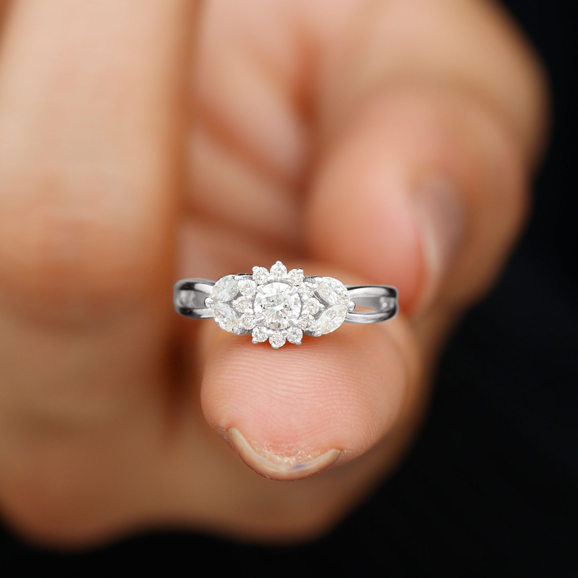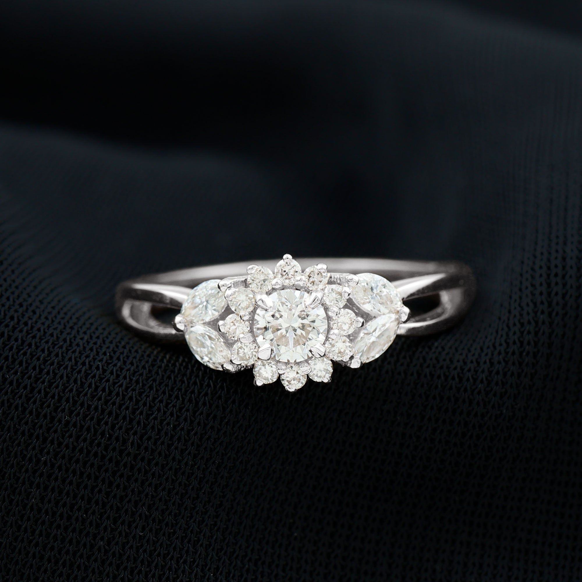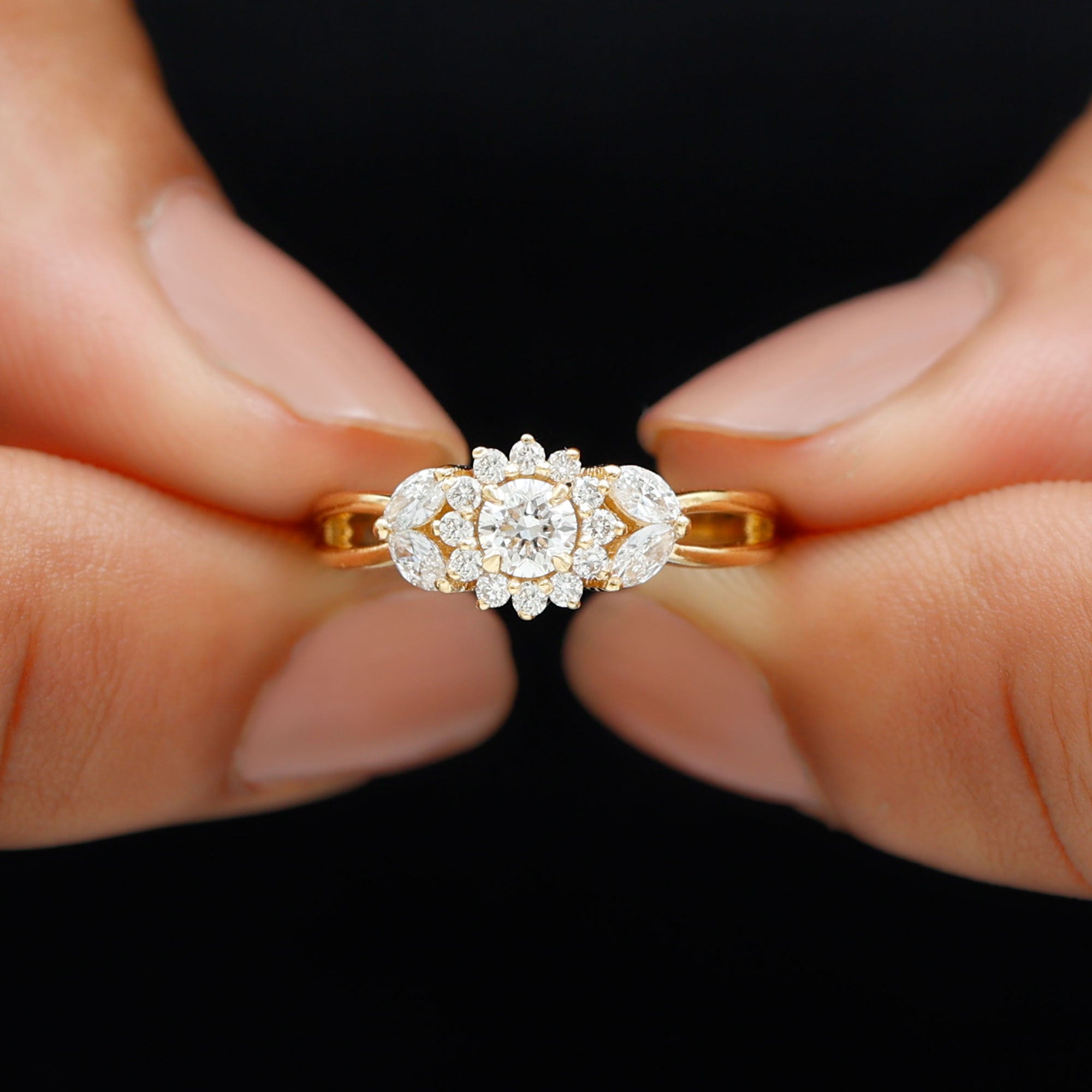 Featuring an exquisite floral motif, this Flower Engagement Ring is the perfect way to commemorate your special day. Adorned with both Round and Marquise-Cut Zircons in a secure claw and Prong Setting in Split Shank, this Engagement Ring for Women is truly a work of art. Crafted from high-quality Solid Gold, this Zircon Split Shank Engagement Ring radiates luxury and elegance, making it a truly stunning choice.