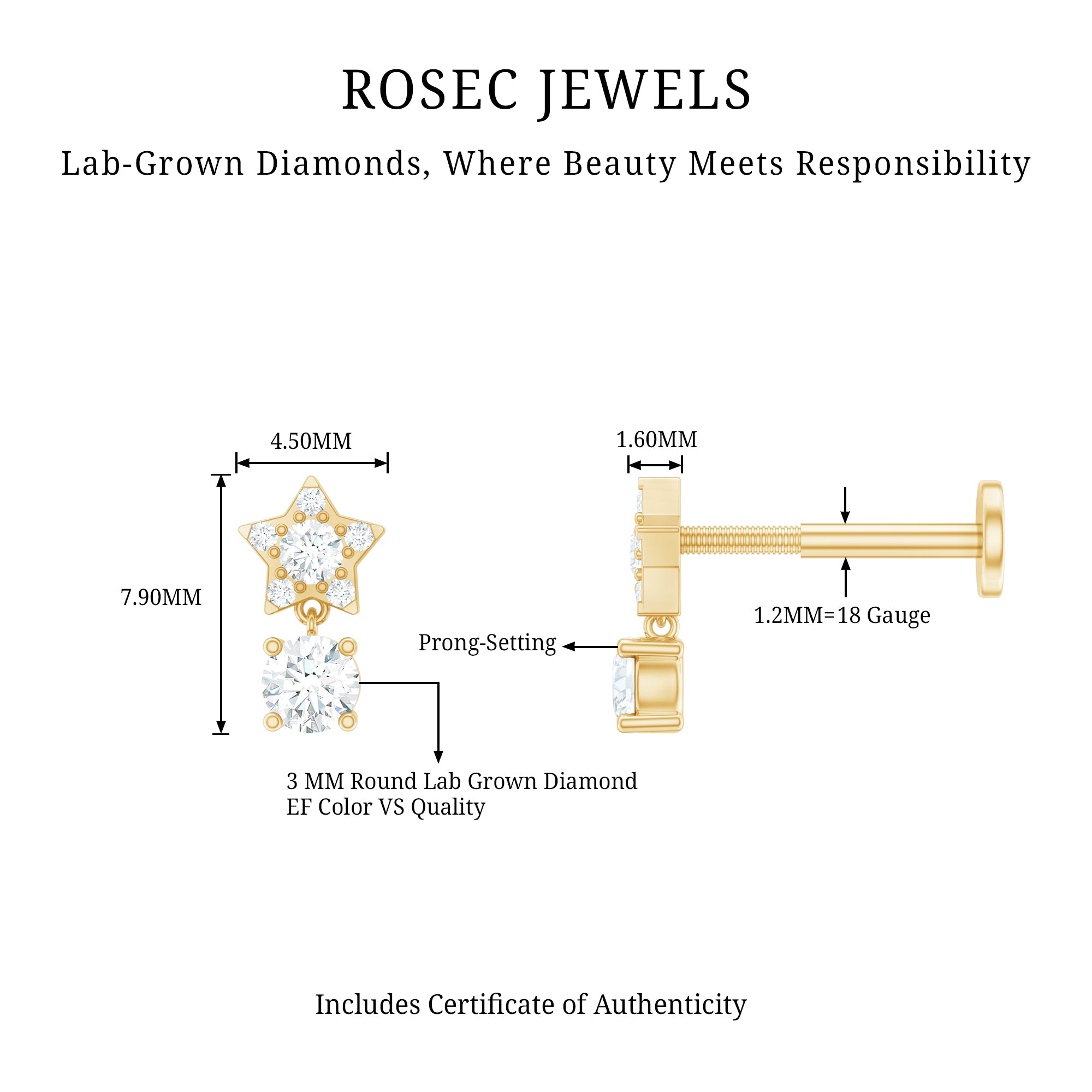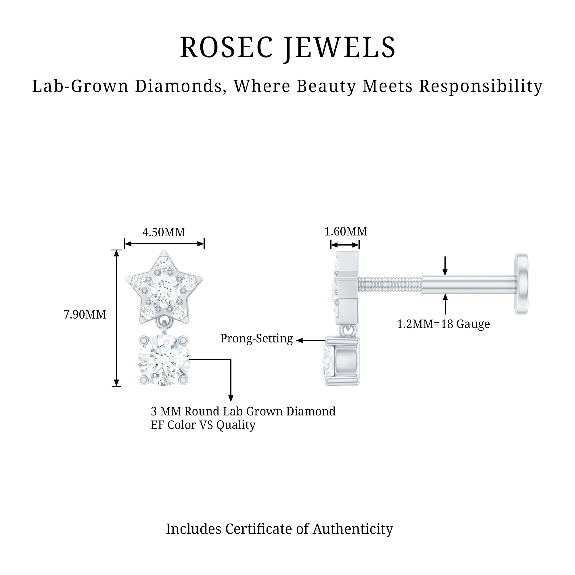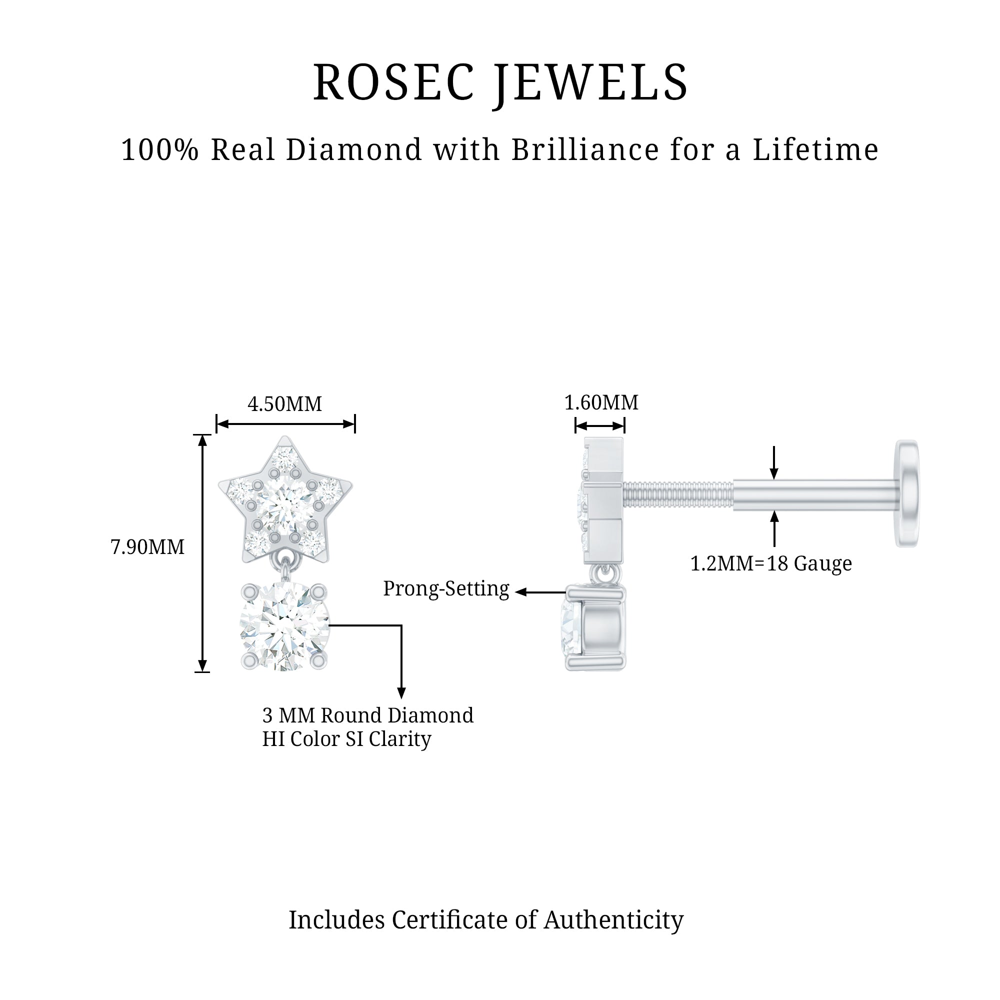 Our Diamond Celestial Star Earring, is destined just for you! A dazzling Round Diamond solitaire hanging as drop takes the center stage, while dainty Round Diamonds studded on the charming star design. This Piercing Earring strikes the perfect balance between understated chic and statement. Perfect fit for your Helix, Cartilage, Conch, Tragus, or Upper Lobe Piercing with this celestial adornment. Pair this elegant Celestial Earring with hoops to effortlessly elevate your style game with a stacked look. Make it a staple in your daily accessories rotation for a touch of celestial beauty, ensuring you a effortless charm every day.