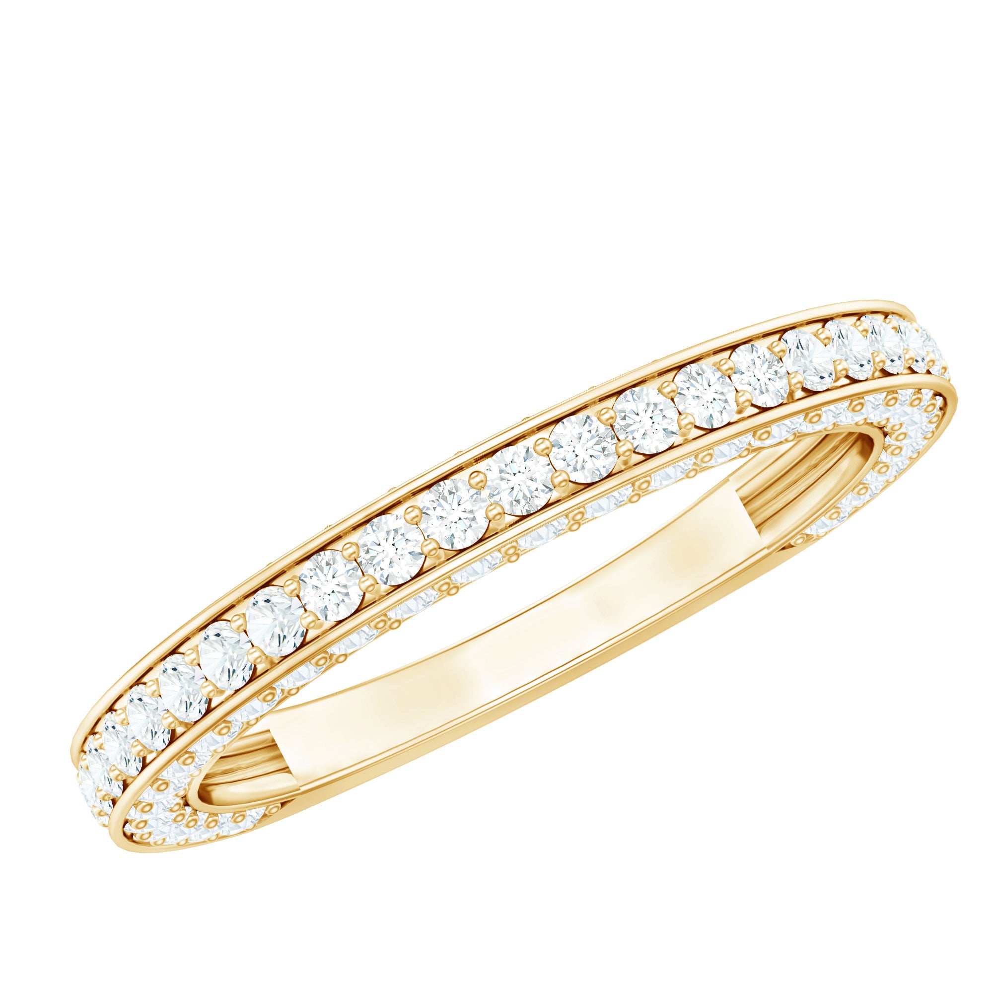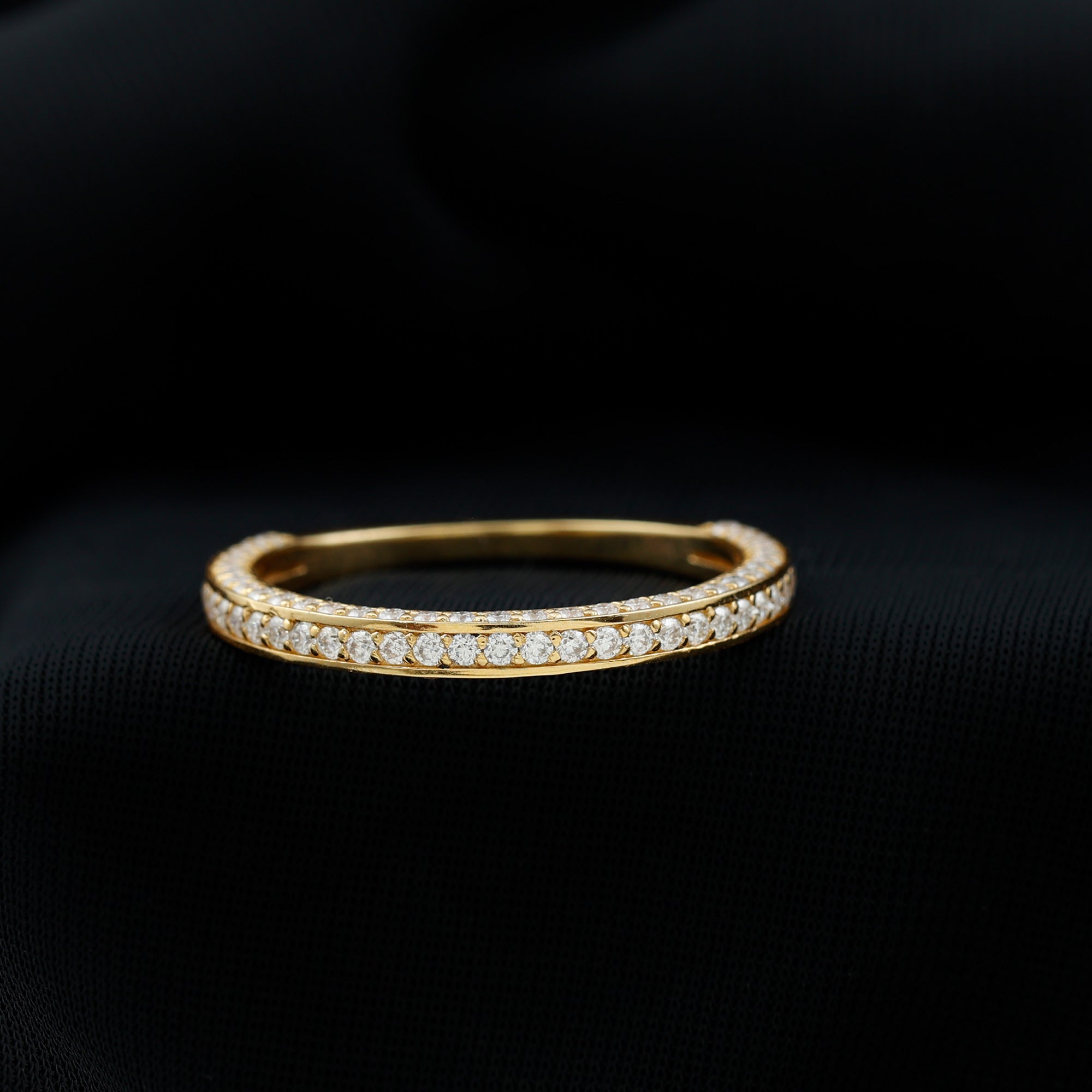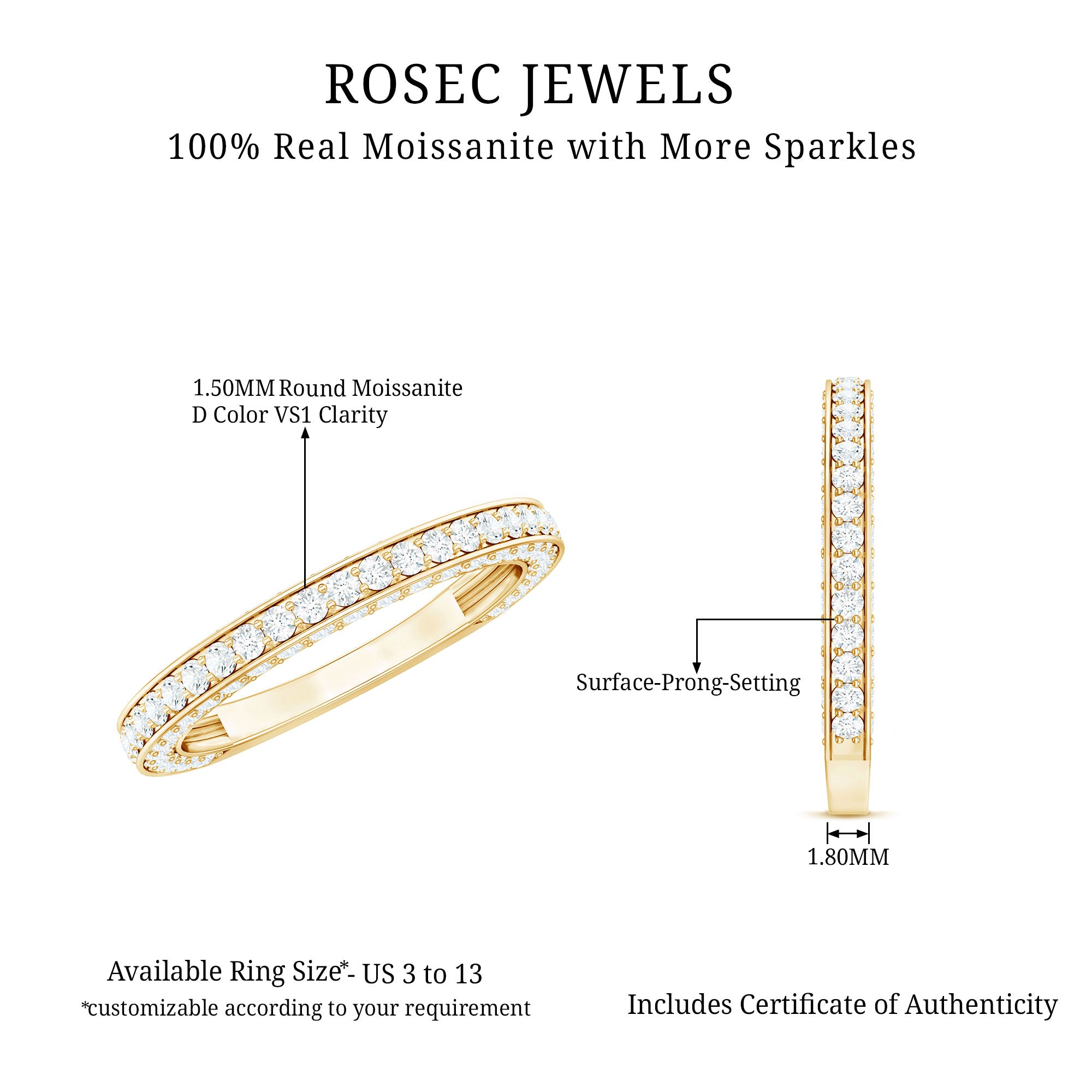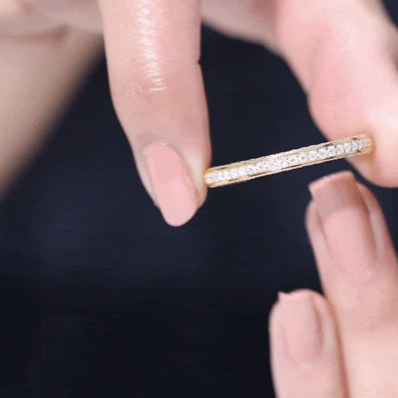Celebrate love with a sparkle that lasts forever. This Moissanite Half Eternity Ring blends classic charm with modern elegance, designed to honor your love story with brilliance that never fades. Set with D-VS1 quality round cut moissanite stones on three sides of the band in surface prong setting, it captures light from every angle, creating a stunning display of fire and beauty. Whether worn solo for a refined, minimal look or stacked with your favorite rings for added impact, this piece transitions effortlessly from everyday elegance to special occasion glam. Thoughtfully crafted for both comfort and style, the Eternity Wedding Band offers a smooth, secure fit that feels as good as it looks. Available in multiple sizes, its easy to find the perfect fit for you or your loved one. Arriving in a signature jewelry box, this Wedding Anniversary Ring is a meaningful gift for anniversaries, proposals, milestones, or simply because she deserves something special. More than an accessory, this Moissanite Stackable Ring is a daily reminder of connection, commitment, and celebration. With its dazzling presence and thoughtful craftsmanship, this Moissanite Eternity Band is a beautiful way to mark life’s most cherished moments.