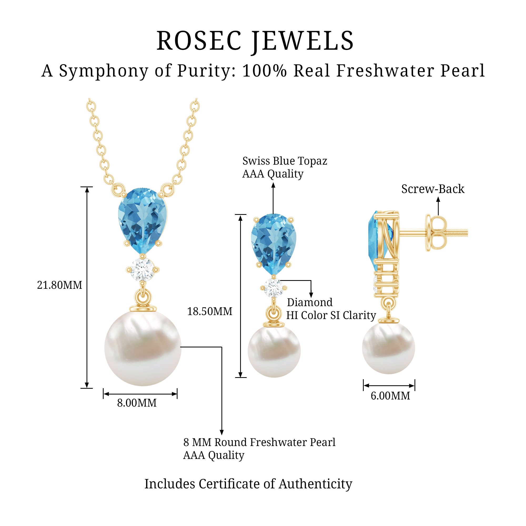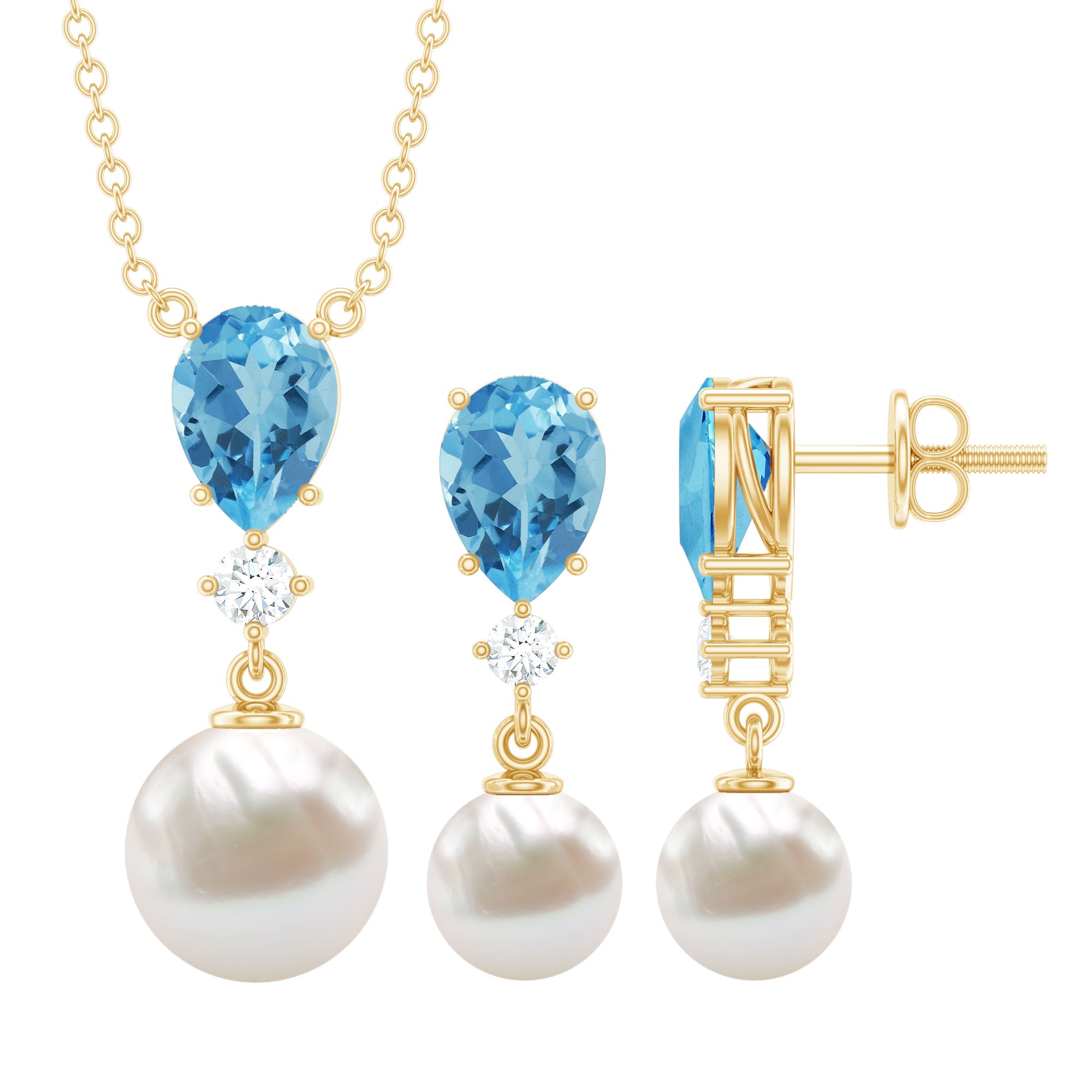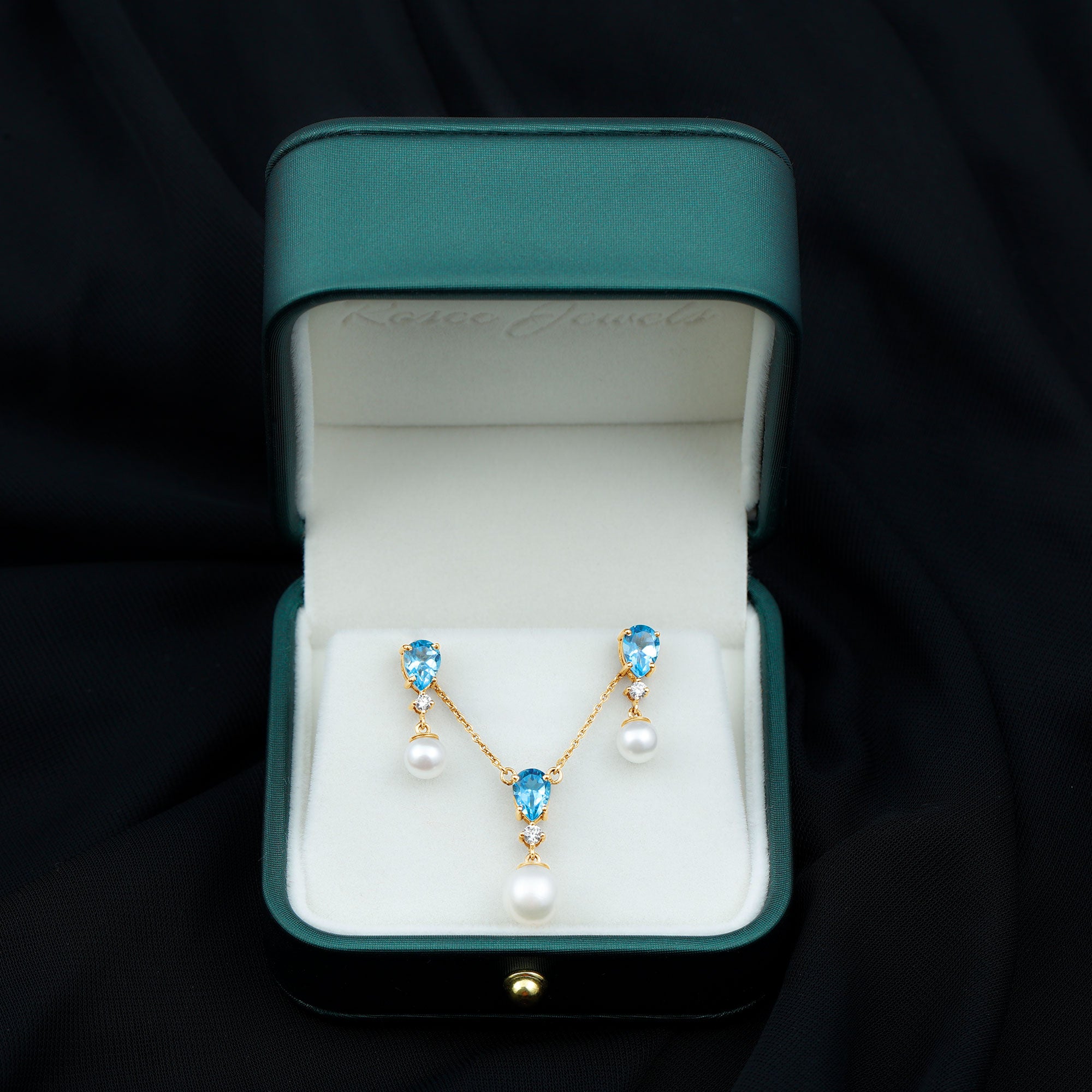 Swiss Blue Topaz and Diamond Jewelry Set with Freshwater Pearl Drop