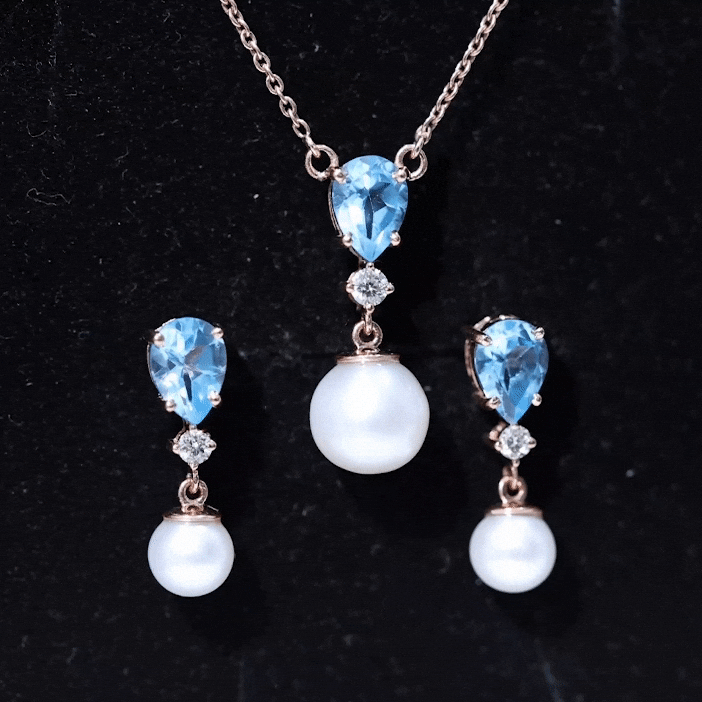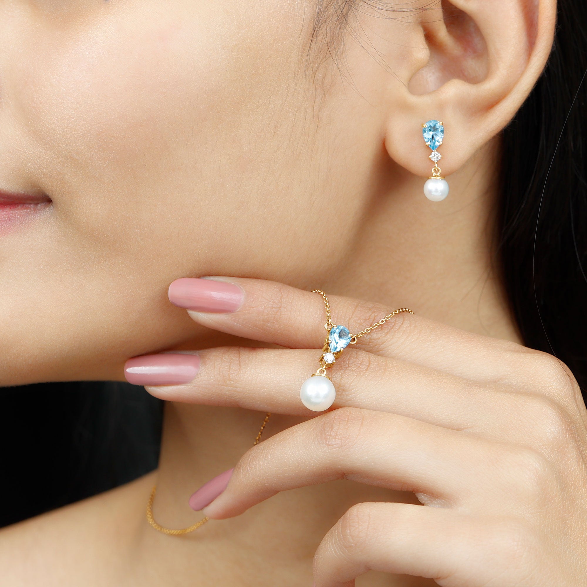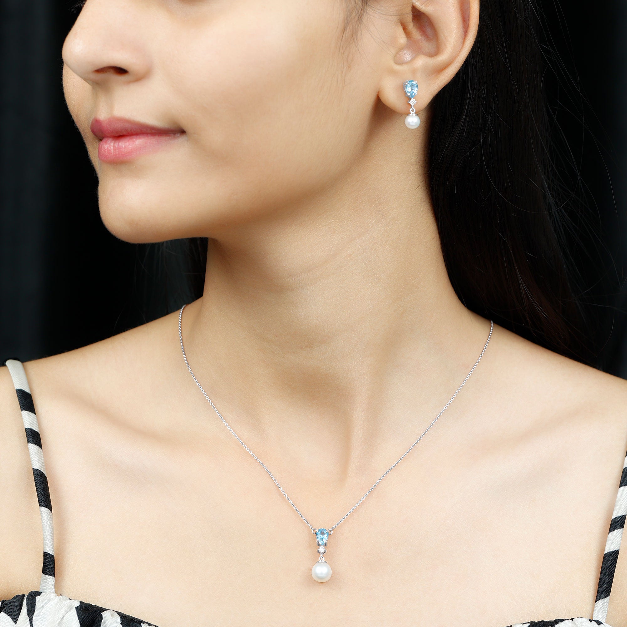 Swiss Blue Topaz and Diamond Jewelry Set with Freshwater Pearl Drop