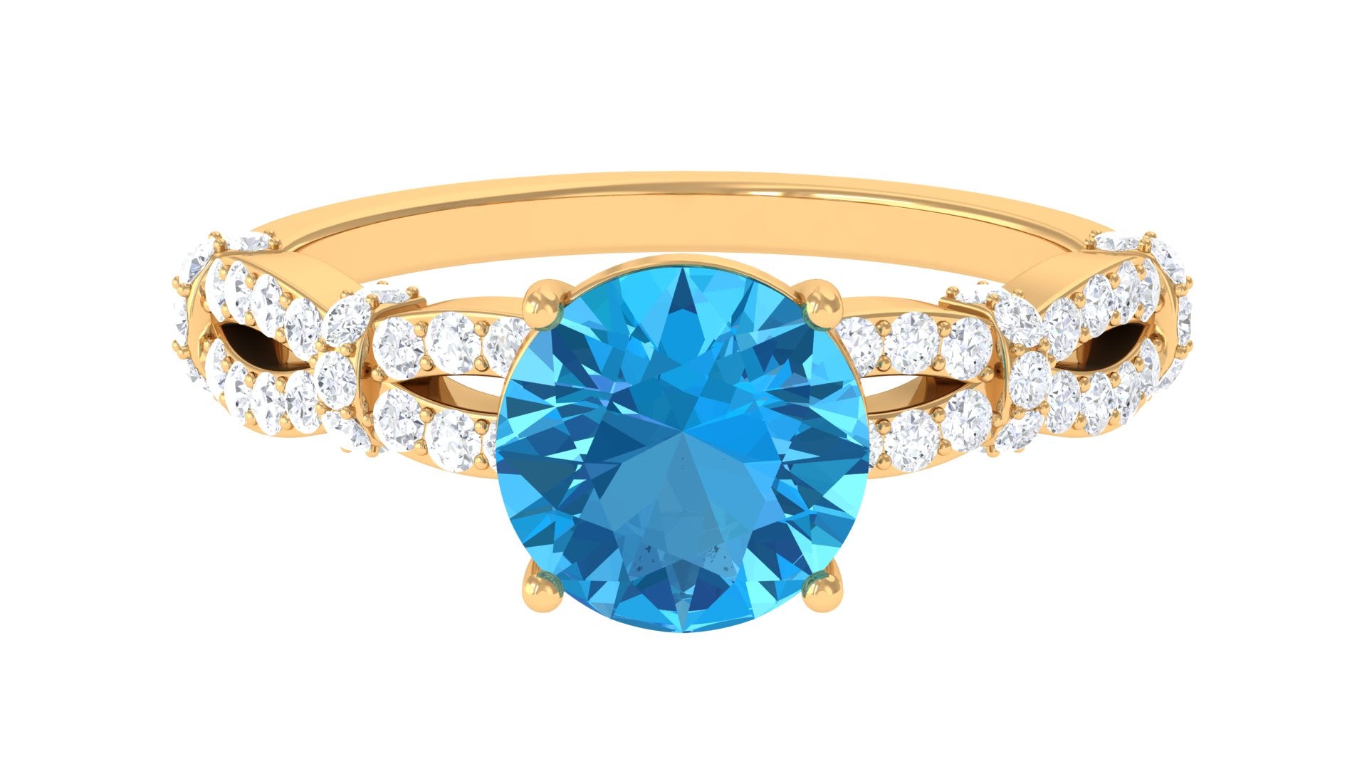 This exquisite Solitaire Engagement Ring showcases an impressive 8 MM Round Shape Swiss Blue Topaz, firmly nestled within a 4-prong setting. To elevate its charm, the Criss Cross Shank is gracefully adorned with Round Diamond stones arranged as accents. The combination of the captivating Swiss Blue Topaz and the intricate design of the shank makes this ring a striking and unique choice for engagement, promising to make a lasting impression and symbolizing the beginning of a beautiful journey together.