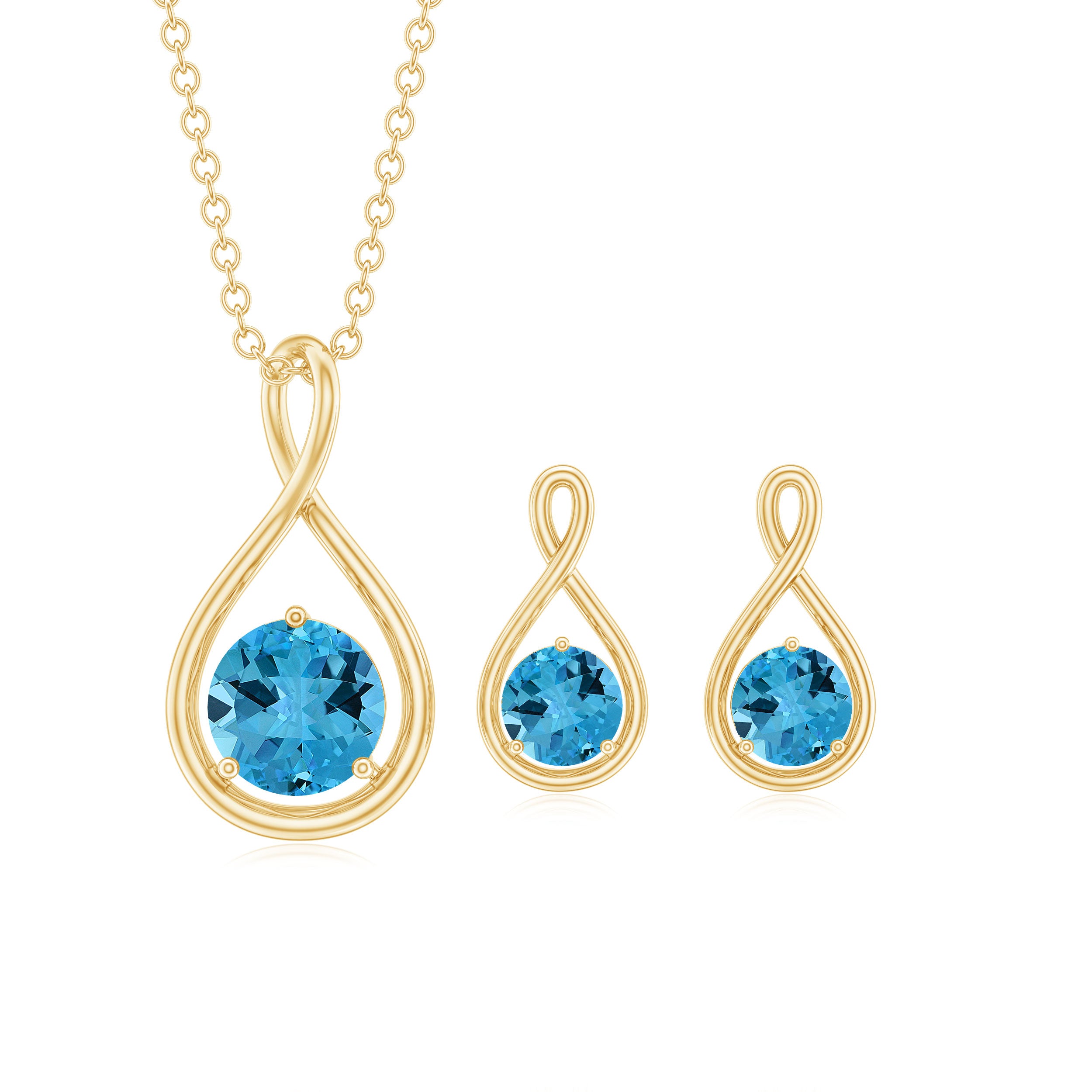 Dazzle in our Infinity Necklace Set featuring a 6 MM Round Cut Swiss Blue Topaz Solitaire in a unique Infinity style Pendant and 4 MM Solitaires in Infinity Earrings. The classic Solitaire Jewelry Set crafted in shining Gold will add grace and elegance to your look.