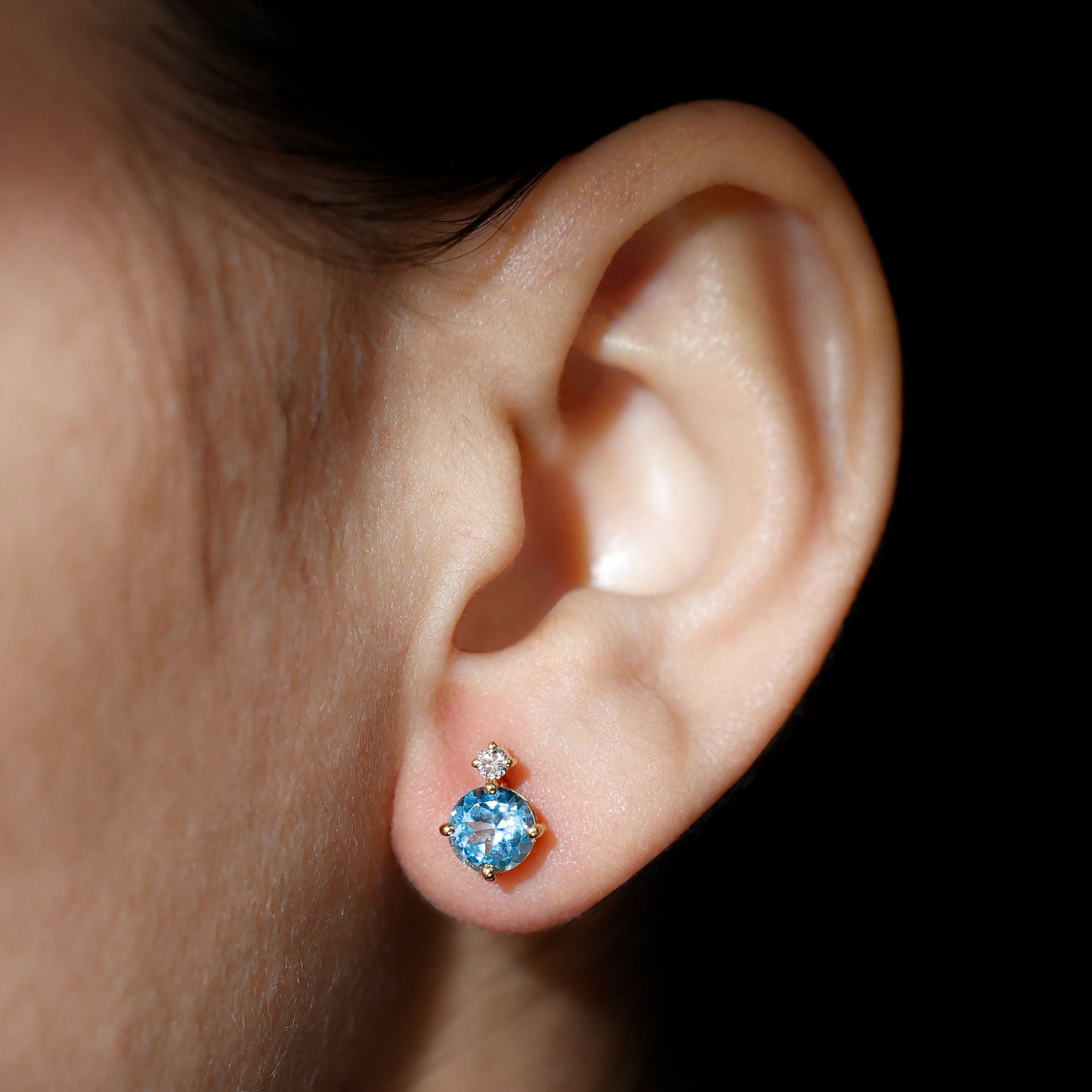 Add charm to your outfit with these Solitaire Earrings embellished with Round Cut Swiss Blue Topaz Solitaire and Round Brilliant Moissanite in prong setting. Crafted in Gold, the Women Stud Earrings come with Screw Back Closure to keep the Swiss Blue Topaz Earrings secure. These December Birthstone Earrings are perfect for casual or special occasions. Surprise your beloved with these Earrings as an Anniversary Gift and make their day memorable.