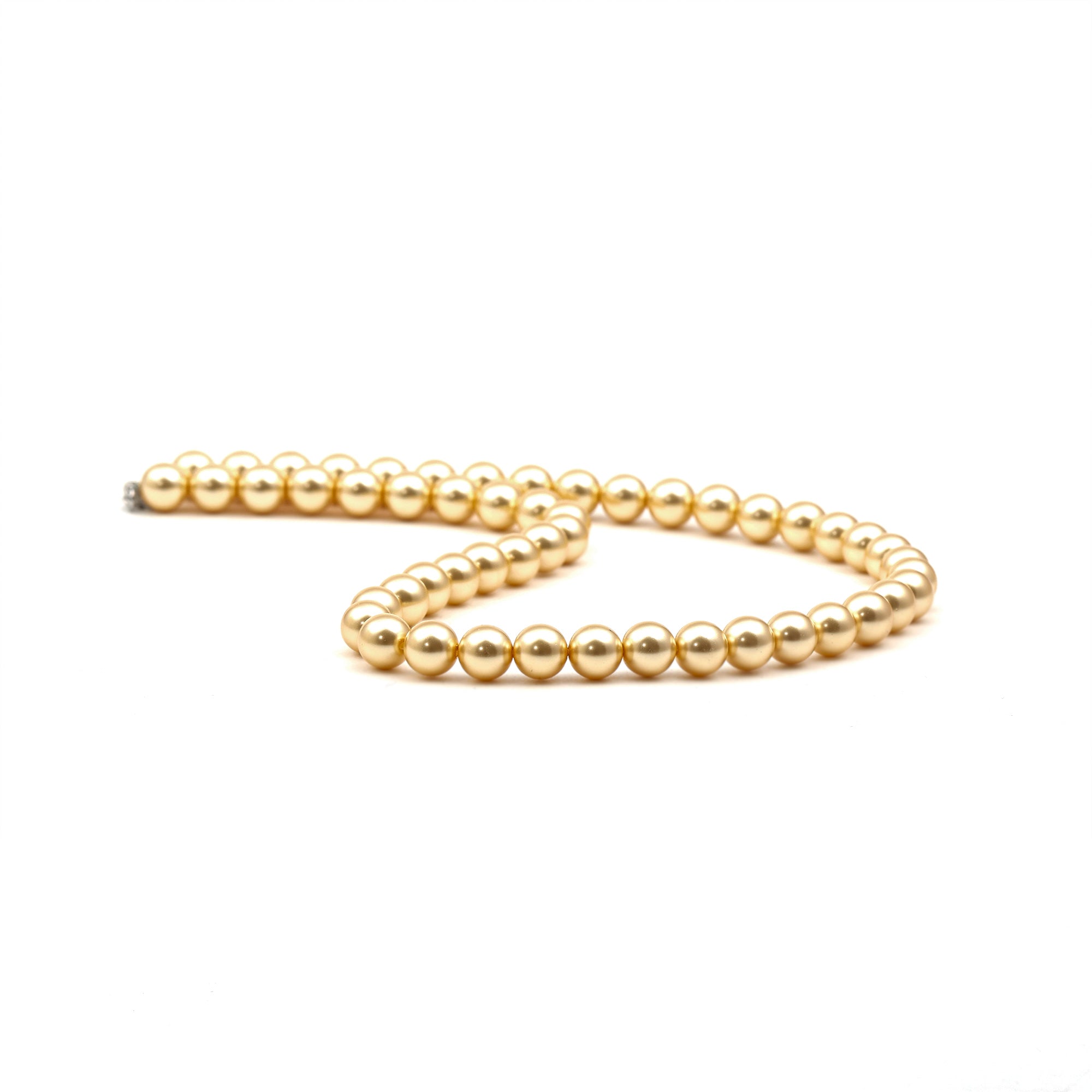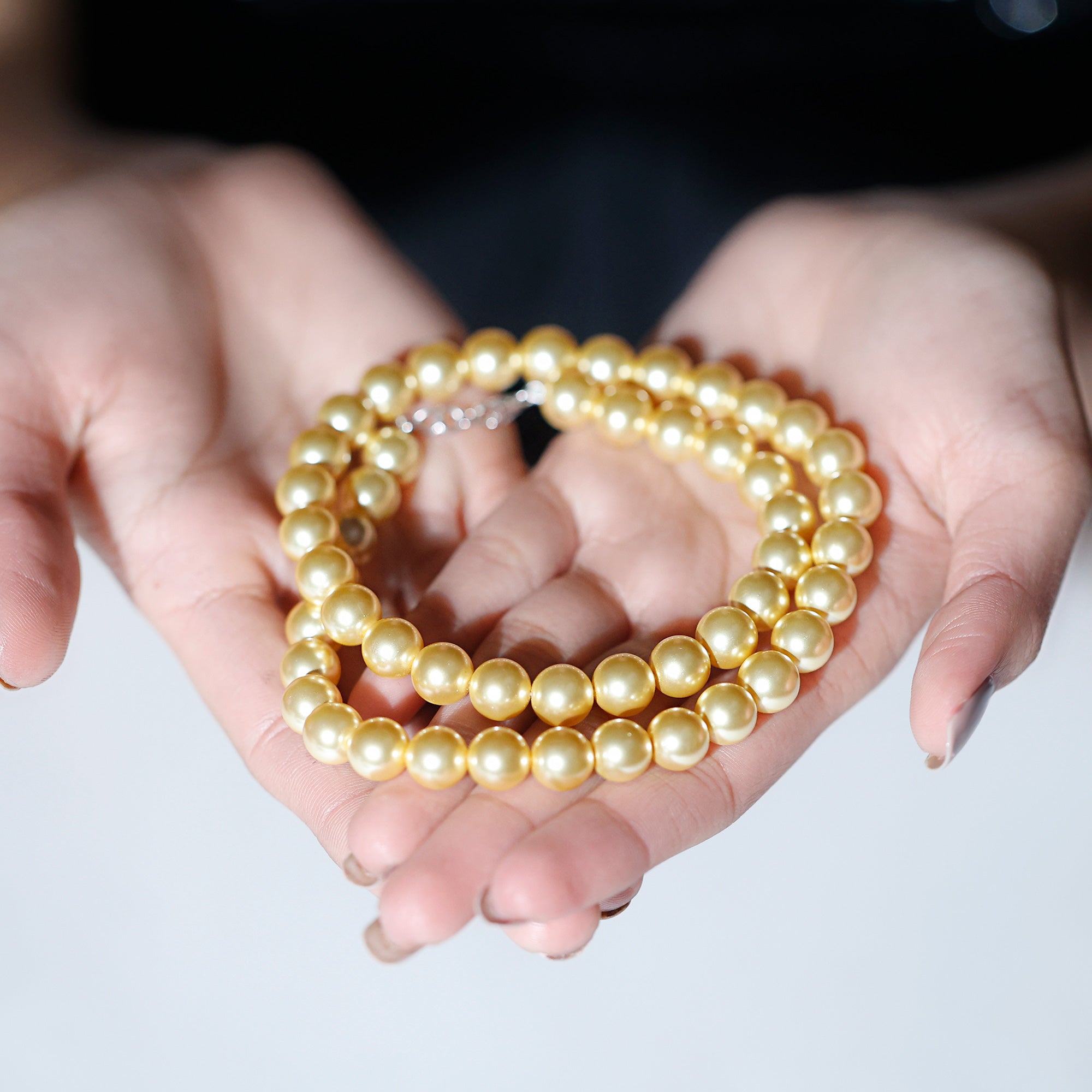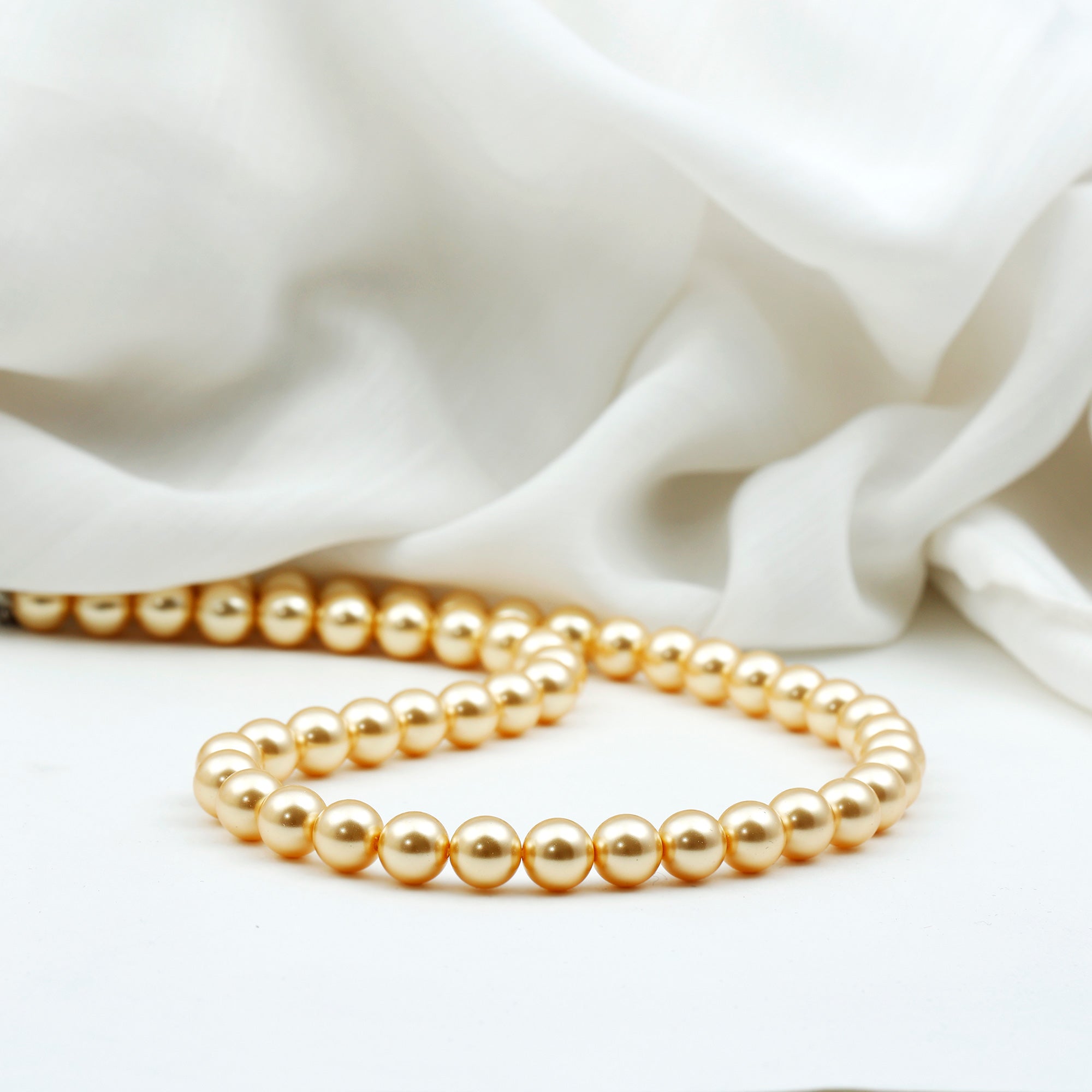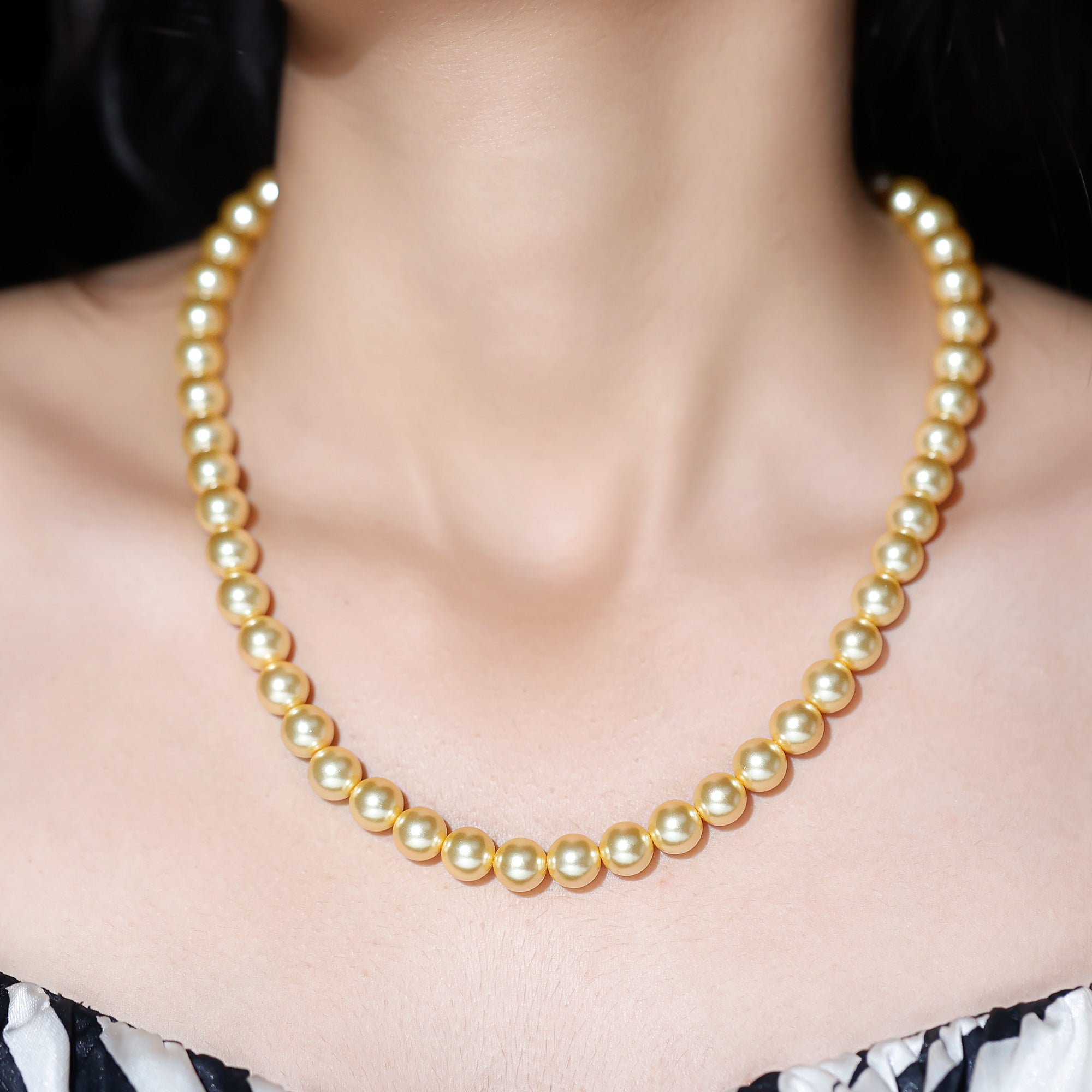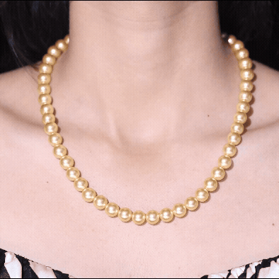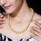 A symbol of royalty, grace, and timeless charm, this South Sea Pearl Necklace exudes classic luxury in every detail. Designed with sophistication in mind, this Single Strand Necklace features lustrous 9 MM round shaped synthetic south sea pearls, offering a uniform and rich golden glow that instantly elevates any necklace. This Golden Pearl Necklace is handcrafted in 14k white gold plated silver, providing a radiant and enduring finish to the design. It is secured with a lobster clasp, offering both style and confidence for day-to-evening wear. This Pearl Strand Necklace is also layered effortlessly with a longer chain or pearl strand for a bolder, fashion-forward statement. Ideal for weddings, festive occasions, or as a signature everyday adornment, this Pearl Layering Necklace is a celebration of refined taste, poised beauty, and graceful tradition.