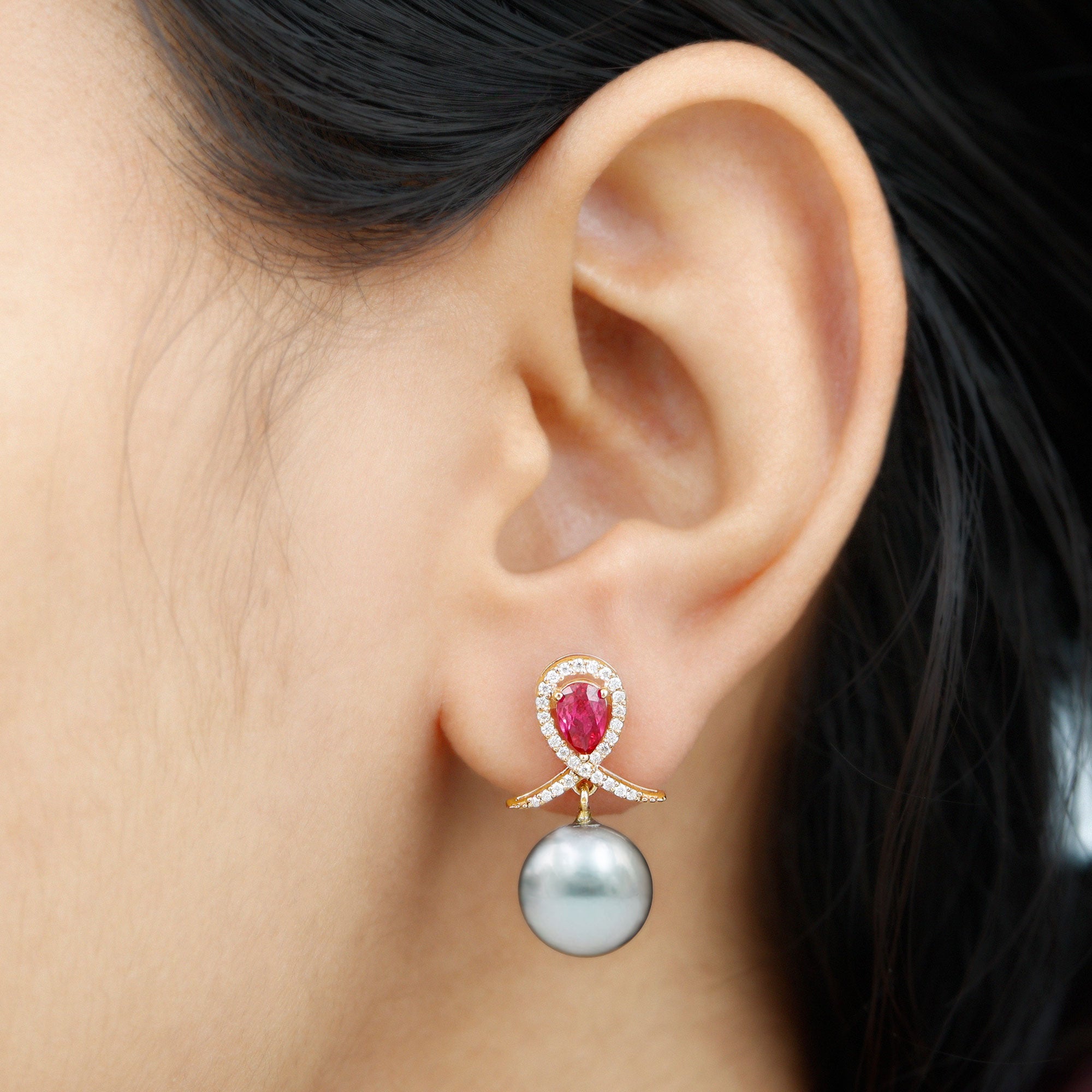 Add a touch of luxury to your wardrobe with these stunning Drop Earrings. Crafted in Gold, these earrings feature a Pear Cut Lab Created Ruby in Prong Setting, complemented by shimmering Round Cut Moissanite. A captivating Tahitian Pearl completes the design, creating a sophisticated and elegant look. These Vintage Earrings make a thoughtful anniversary gift for your significant other, or a special treat for yourself.