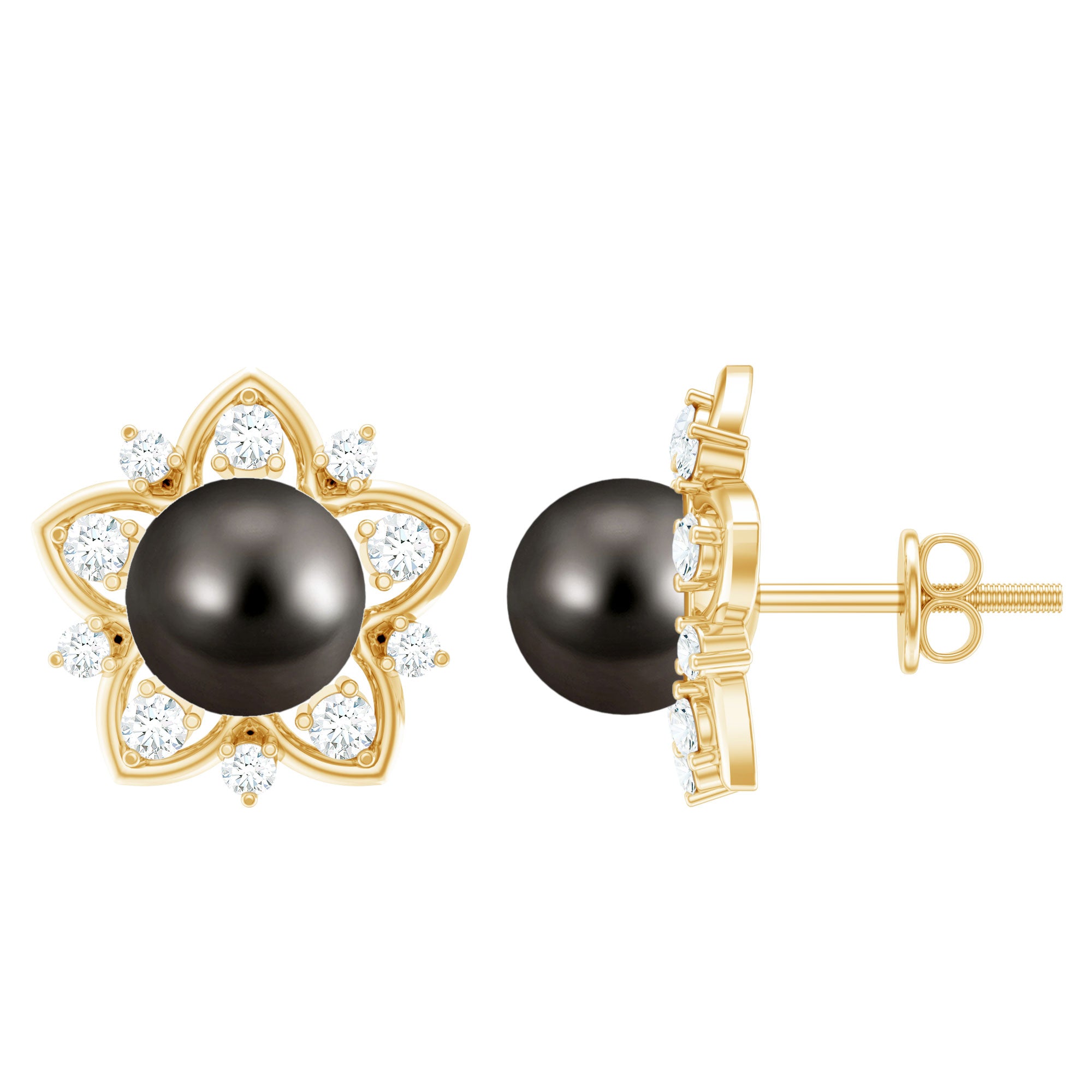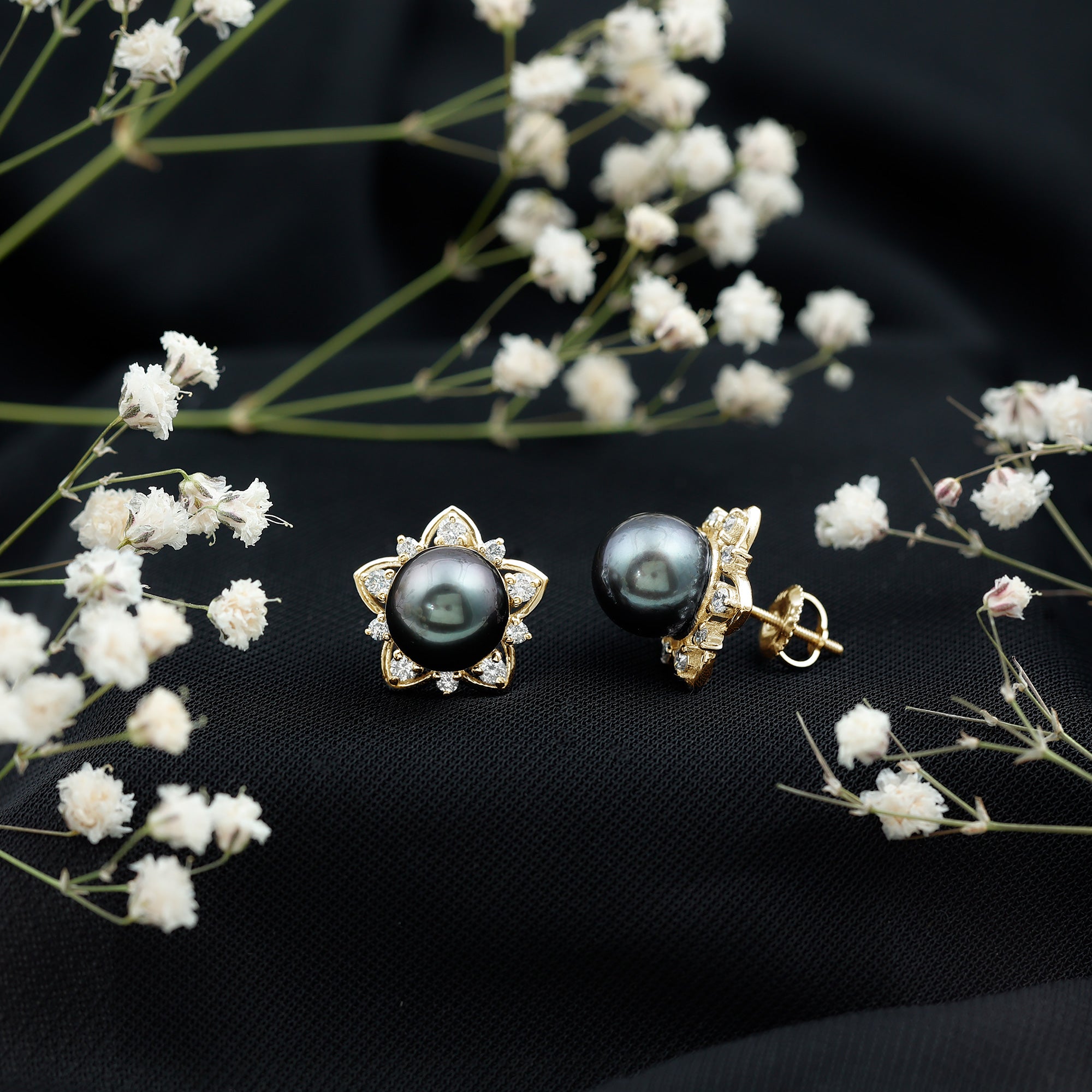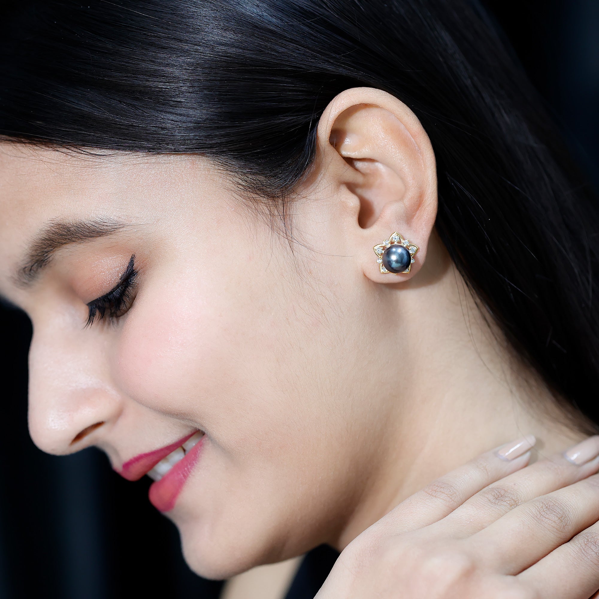 Pearl Flower Earring is the unique flower design is set with Solitaire Tahitian Pearl stone in the center and Round Shape Diamonds in prong setting decorates the flower. This Pearl Stud Earring is made in Solid Gold metal.