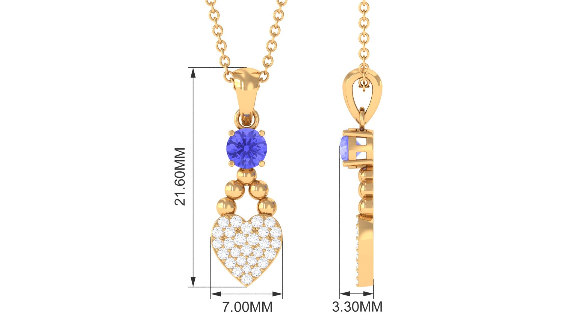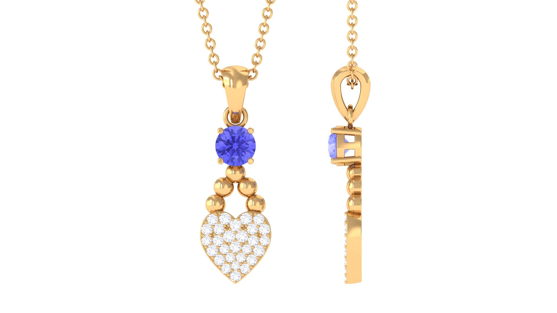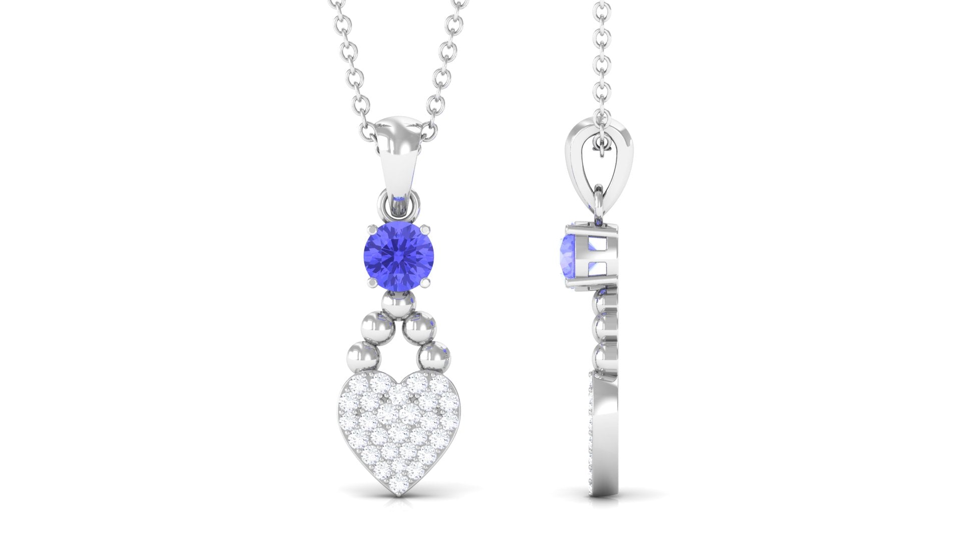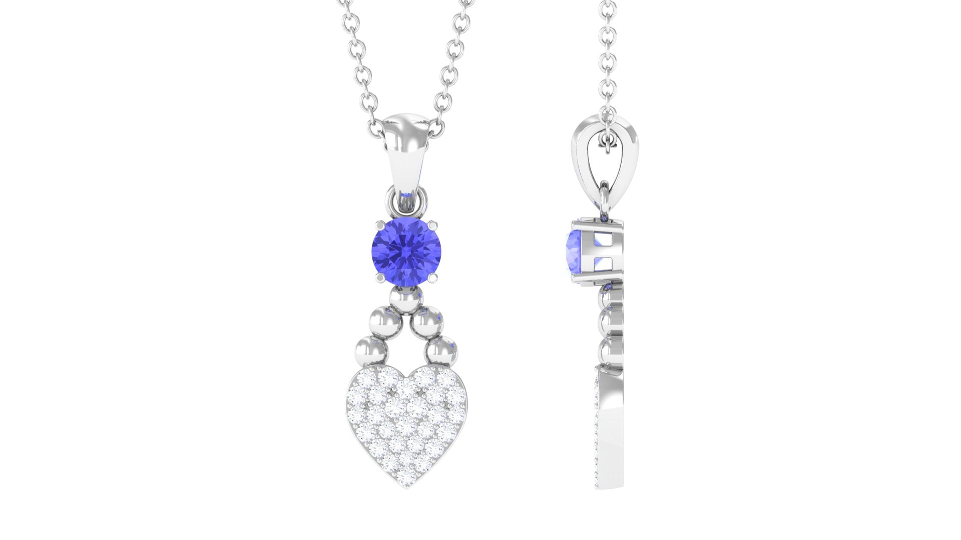 A glimmer metal heart frame is embellished with beaded detailing and joined to a 4-prong set round tanzanite in this aesthetically pleasing heart drop pendant. Round diamonds are meticulously set in the heart frame for an optimal sparkling effect. The drop pendant is secured with a shiny metal bale.