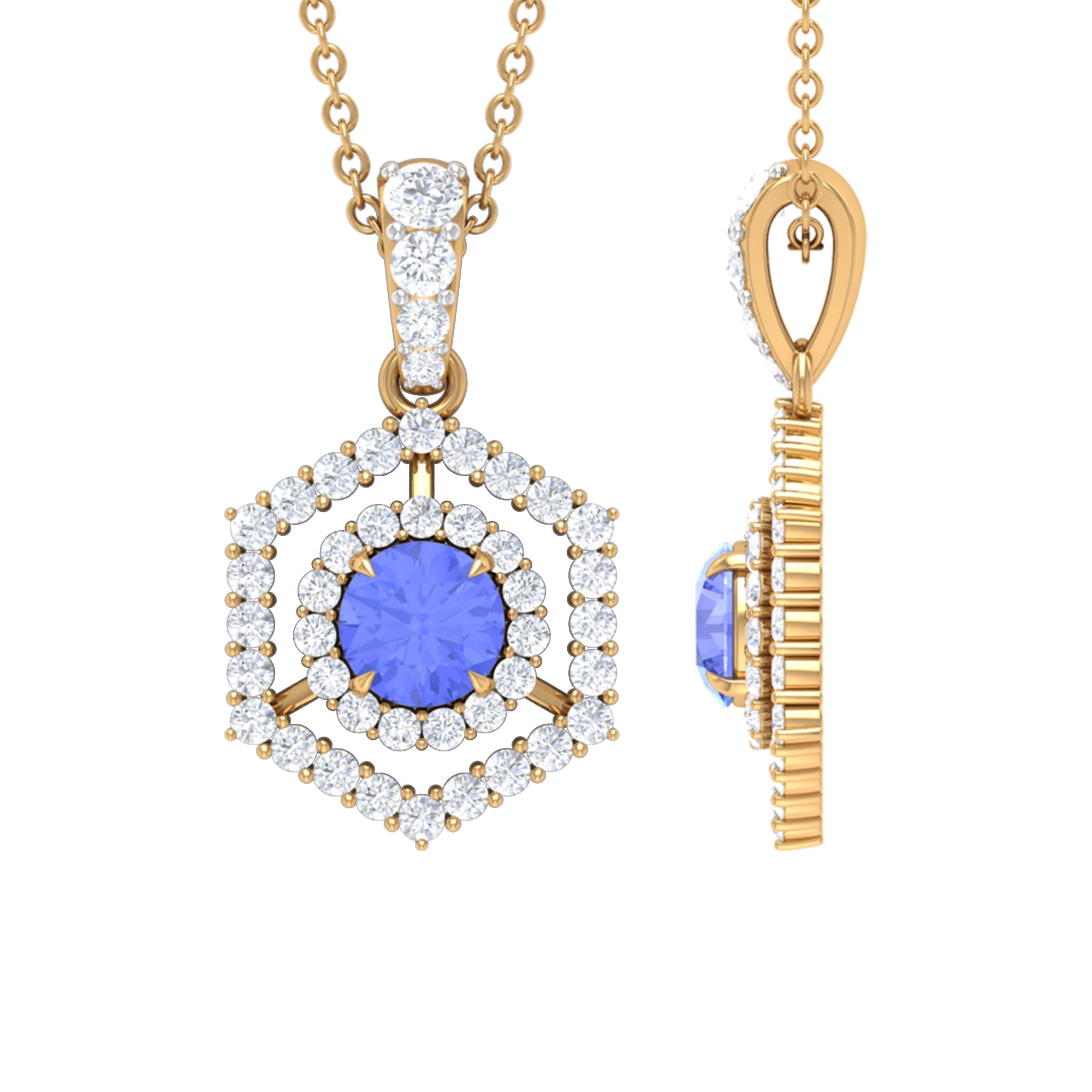 Indulge in the beauty of this Hexagon Shape Pendant, expertly crafted with Tanzanite and Diamond. The pendant necklace is adorned with a stunning Tanzanite, complemented with diamond accents, and a decorative accent bail. This elegant and sophisticated piece of jewelry is perfect for women who appreciate the beauty of natural gemstones and a touch of sparkle. The unique hexagon shape and intricate detailing of the pendant make it a striking addition to any outfit, making it the perfect accessory for any occasion.