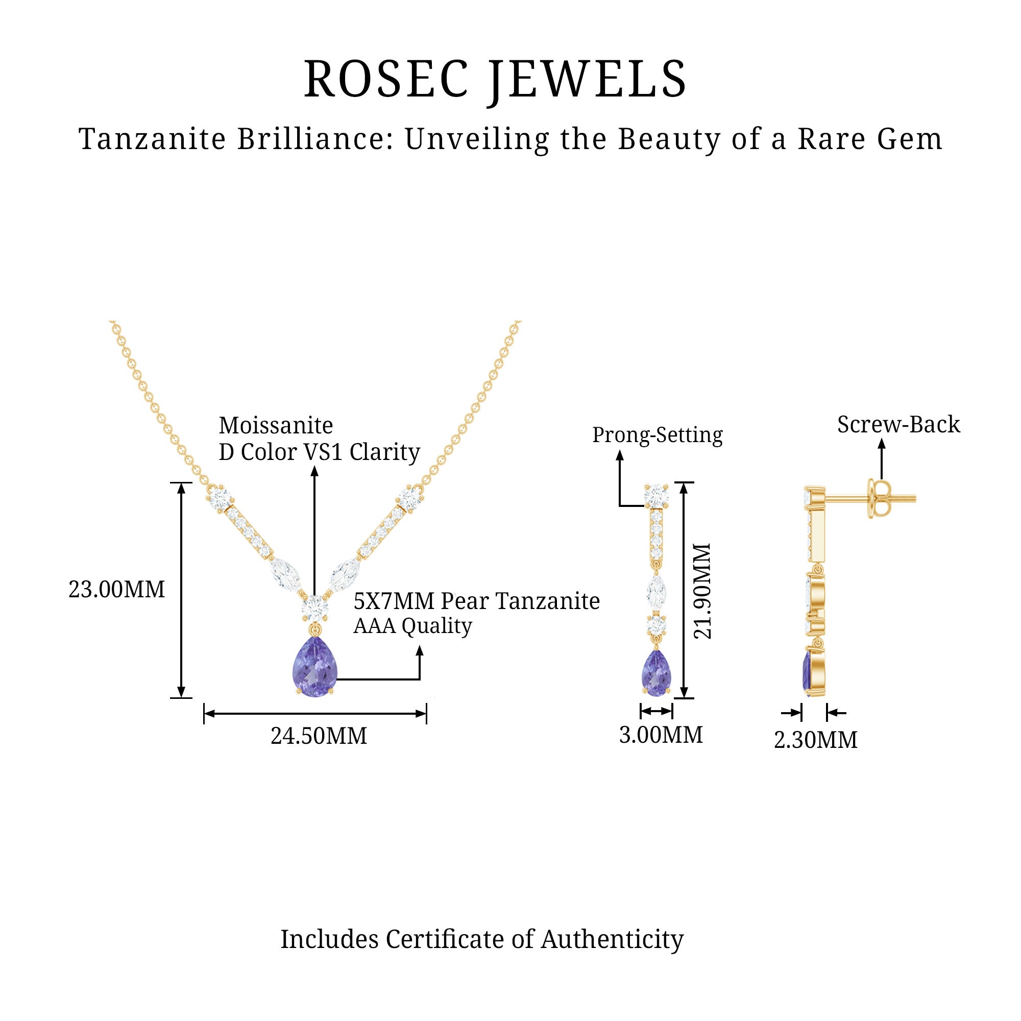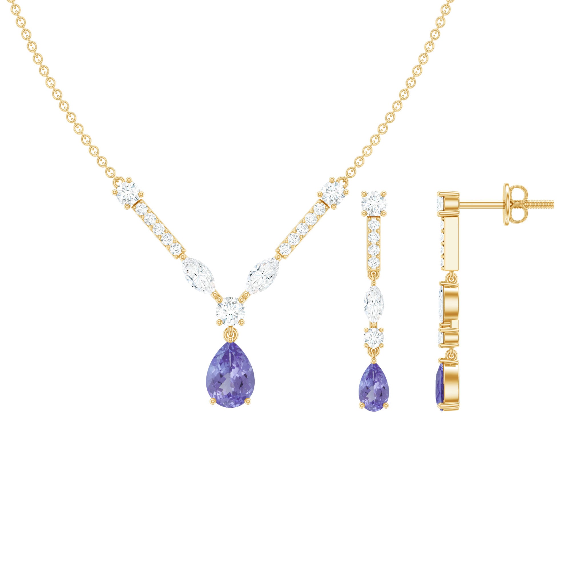 Looking for the perfect Necklace Earrings jewelry set to adorn your bride-to-be on your wedding day? Look no further than this stunning Tanzanite Jewelry Set. Featuring a gorgeous Pear Cut Tanzanite stone set in a secure Prong Setting and accented with sparkling Moissanite on both the pendant and drop earrings, this drop jewelry set is sure to make a statement. The elegant Tanzanite Pendant and Earrings Set is both beautiful and timeless and is sure to become a cherished piece in your loved ones jewelry collection.