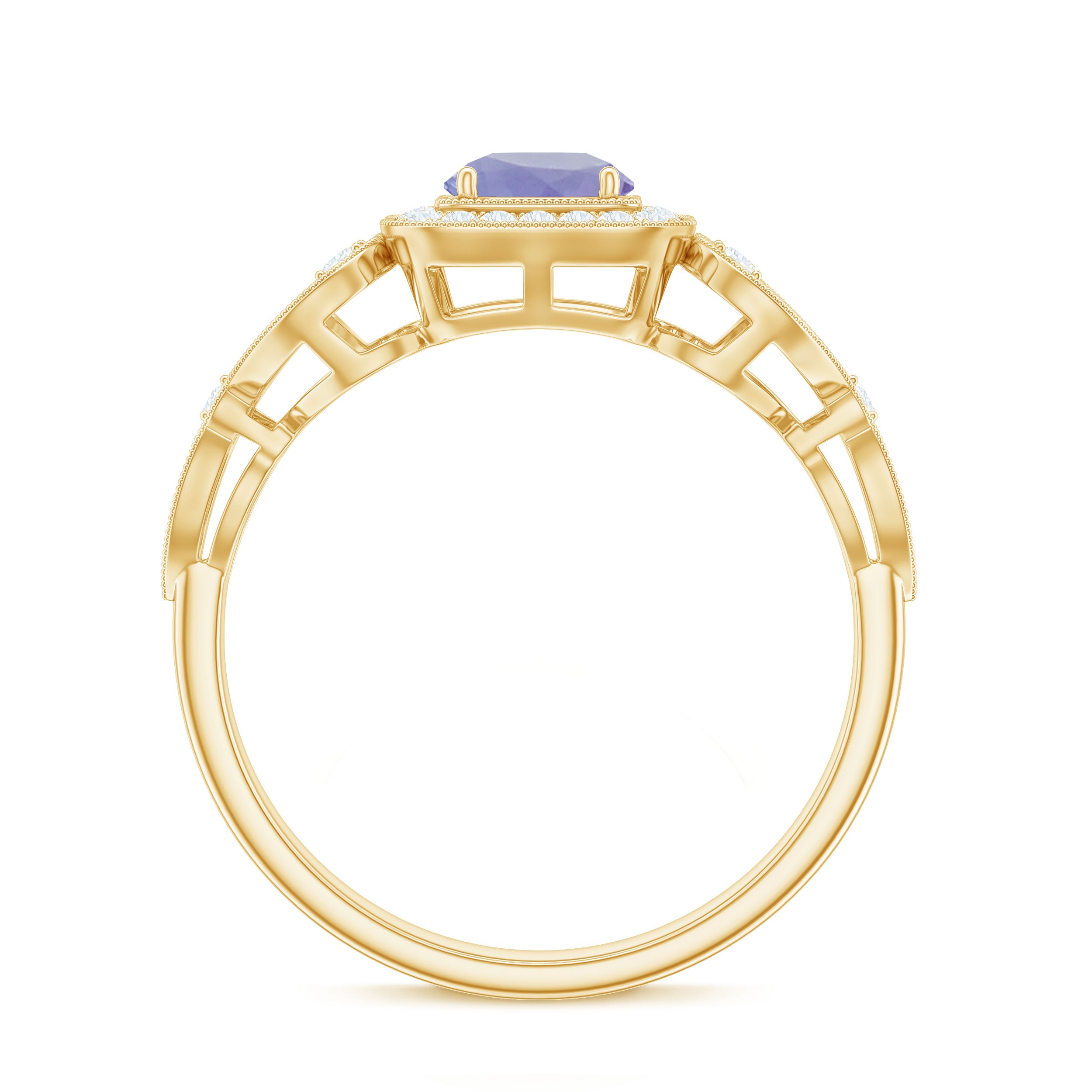 A reminiscent of timeless romance and old-world charm, this Vintage Looking Engagement Ring feels like a love story written across generations. At its center, a Prong Set 5 mm Round Shape Tanzanite draws you in with its rich blue hue, full of depth and emotion. Encircling the center stone, a sparkling Diamond Halo adds a soft glow, enhancing its beauty without overpowering it. The vintage inspired band is adorned with delicate Diamond stones and fine Beaded Detailing, creating a look that feels both intricate and meaningful. This Tanzanite Engagement Ring is made for someone who believes love should feel classic, personal and unforgettable. This Tanzanite Diamond Ring is perfect for marking a moment meant to last forever. Its antique inspired design carries a sense of history, while the brilliant stones keep it fresh and modern. Thoughtfully presented in a signature jewelry box and available in a range of ring sizes, this Vintage Tanzanite Ring is ready for a proposal filled with emotion.