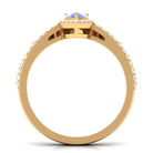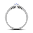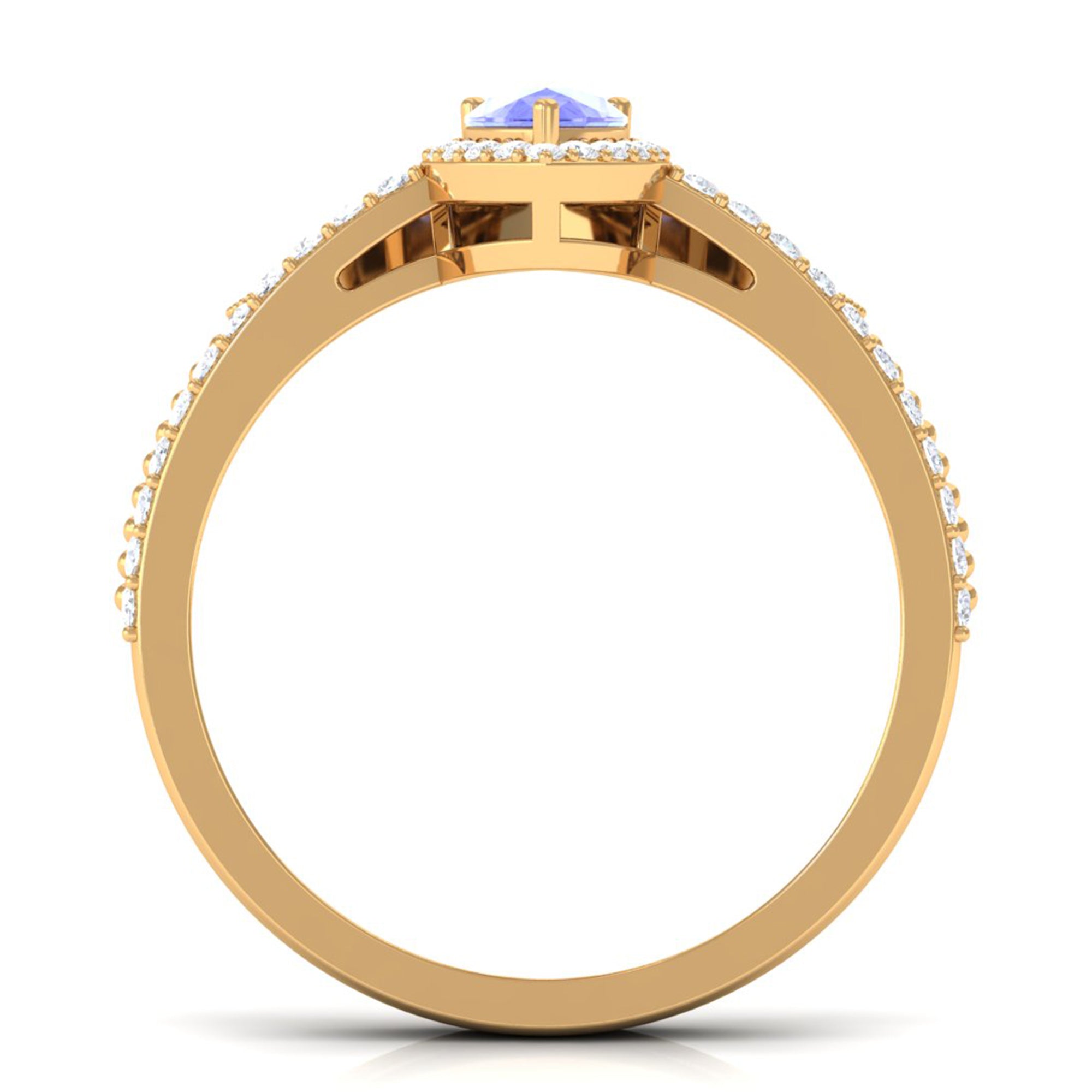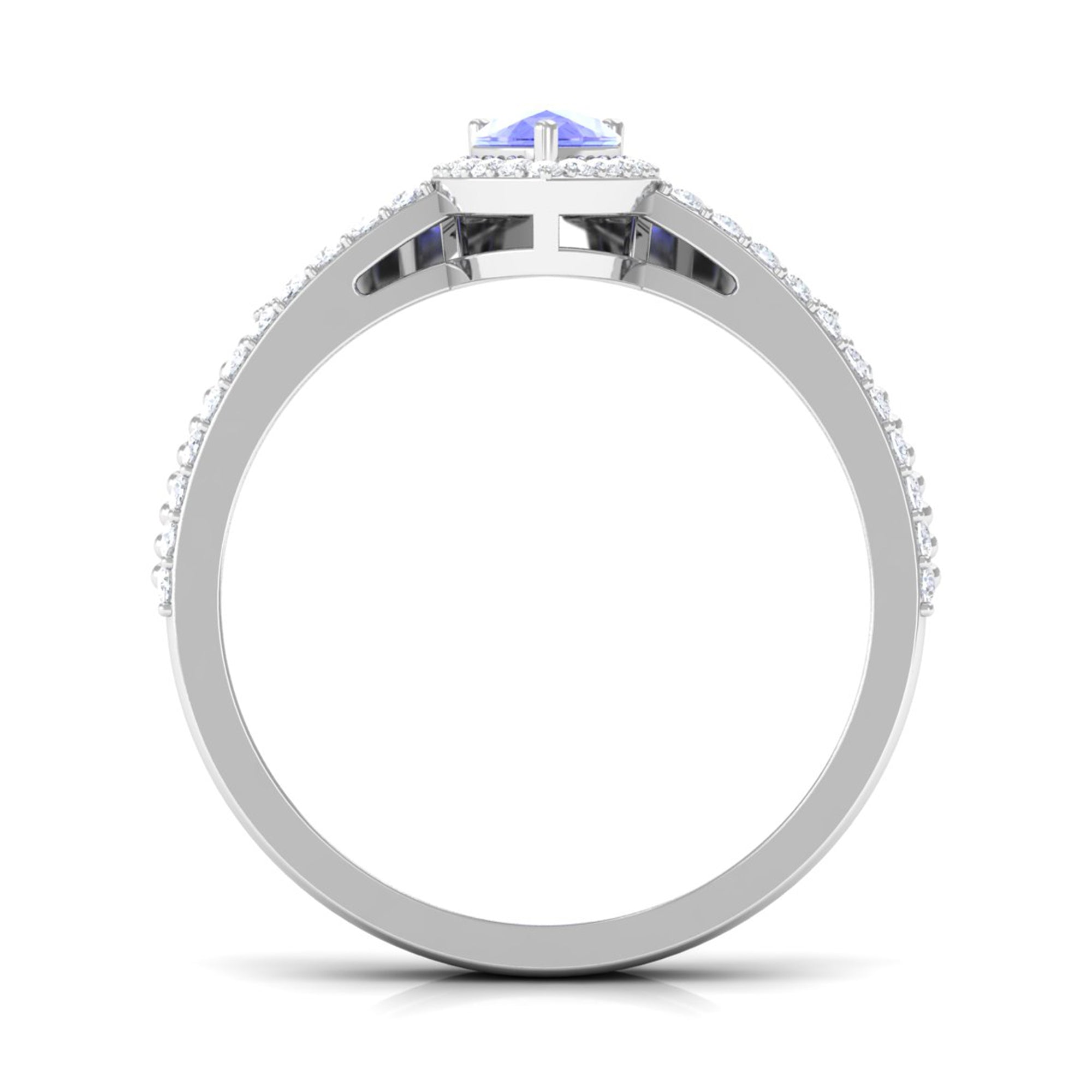 Leave her in awe with your impeccable choice of this exquisite ring set. The bridal set features a 5X7 mm pear-cut Tanzanite, delicately held in a prong setting. The ring set is enhanced by a halo of round, gleaming Diamond stones that encircle the Tanzanite, adding a captivating sparkle. The chevron band, adorned with more radiant Diamond stones, beautifully complements the centerpiece. Present her with this remarkable ring set and watch her marvel at its exquisite craftsmanship and timeless elegance.