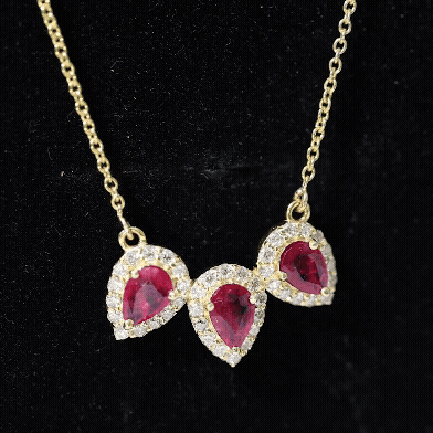This Gorgeous Gold Leaf Necklace is embellished with Pear Cut Created Ruby set in Prong Setting and Moissanite in Halo Style. This Three Stone Necklace is Composed of Solid Gold. A Perfect Gift For Your Loved Ones.
