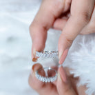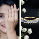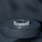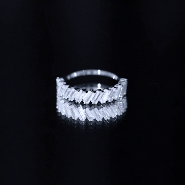 This half eternity ring features tilted baguette cut zircon stones set in 2 prong setting. The unique and modern design of the tilted baguette stones creates an eye-catching and sophisticated look. The zircon stones sparkle brilliantly, adding a touch of luxury and elegance to the ring. This ring is perfect for someone who appreciates a contemporary and bold design, with a hint of femininity. Its a beautiful accessory that can be worn on any occasion and is sure to make a statement.