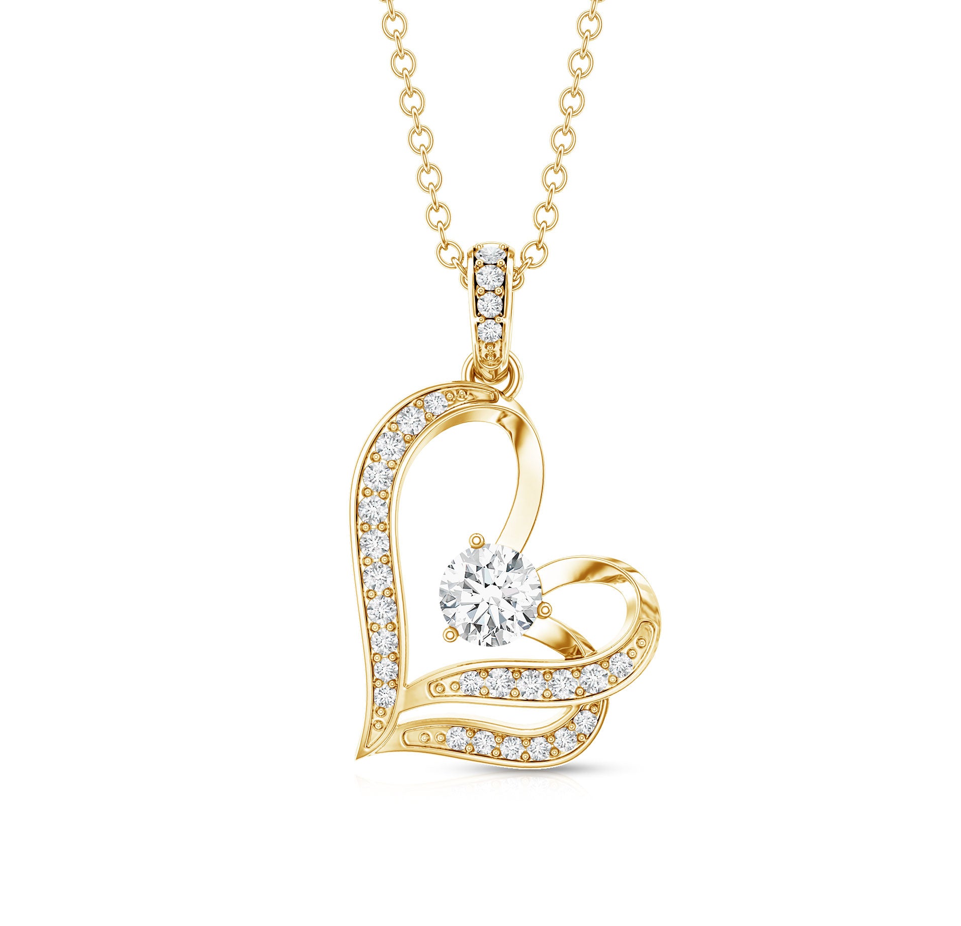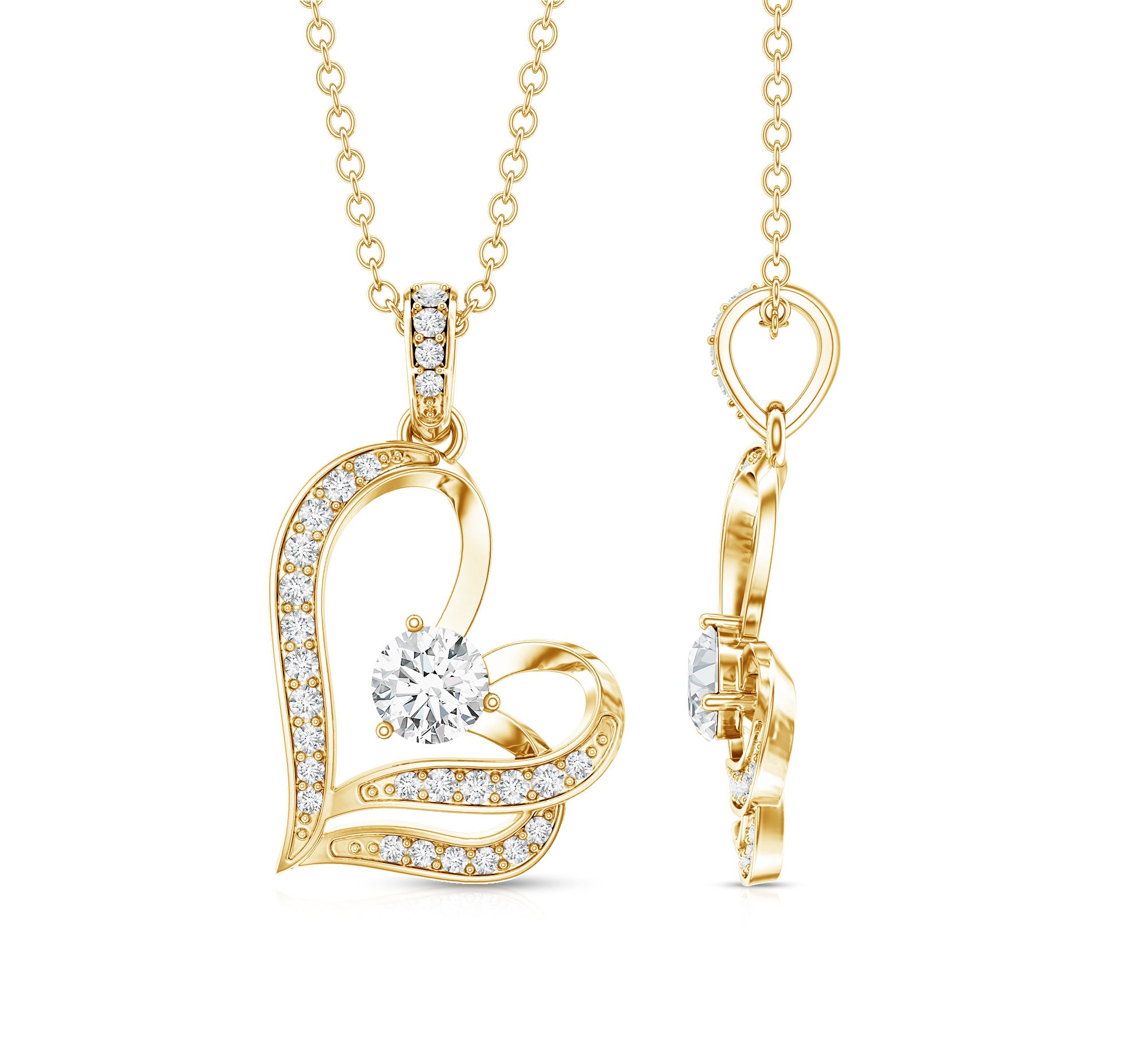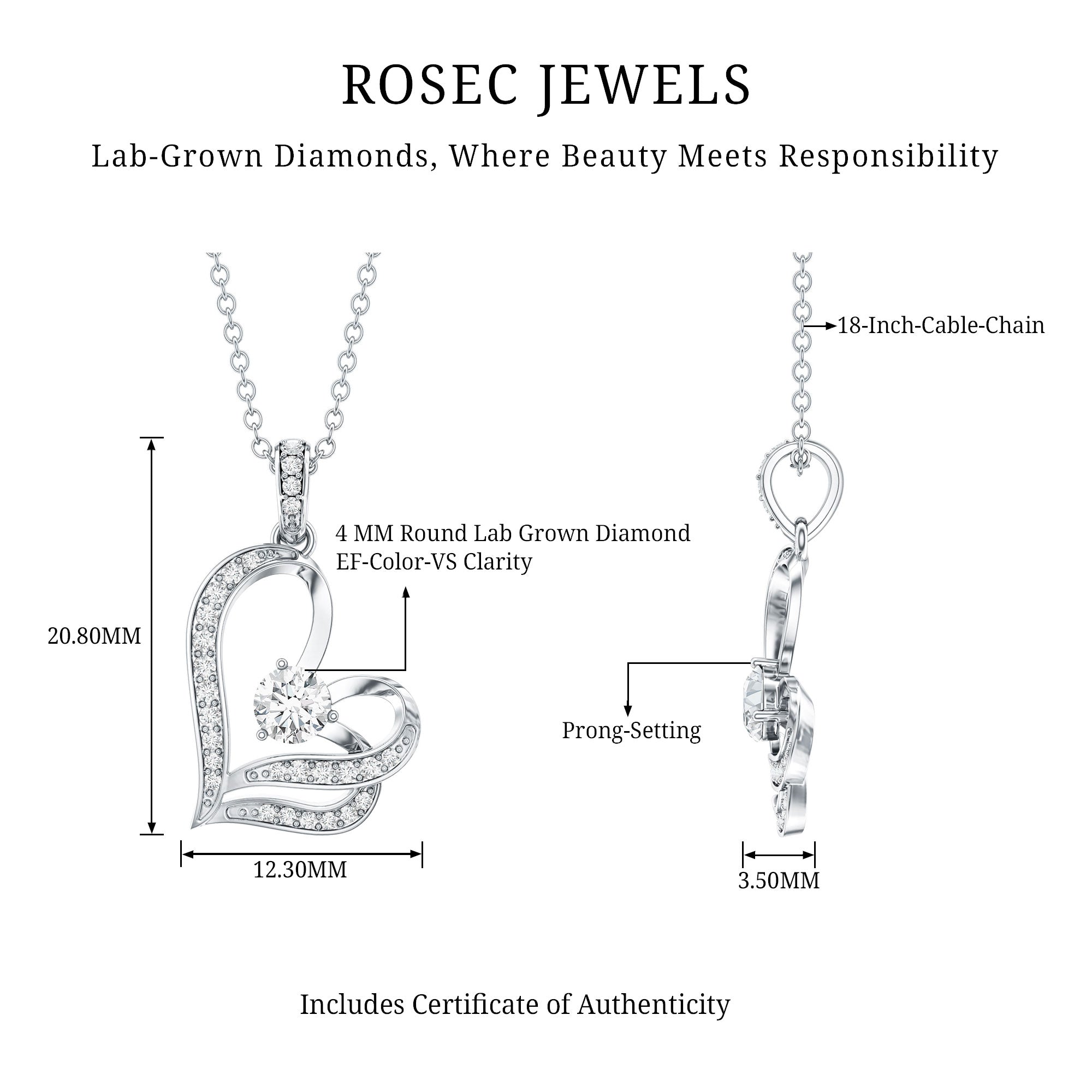 Surprise your loved one with this Heart Necklace featuring Round Shape Diamond gemstones set in a Prong Setting. The subtly tilted heart design of this Lab Grown Diamond Necklace adds a touch of uniqueness and the accent bail complements the look with more shine. Crafted with EF-VS quality diamonds, this Minimal Necklace exudes sophistication and charm. This delicate piece seamlessly blends modern elegance with timeless romance. Upgrade your style with this ethically sourced, exquisite accessory from Rosec Jewels, where craftsmanship meets compassion.