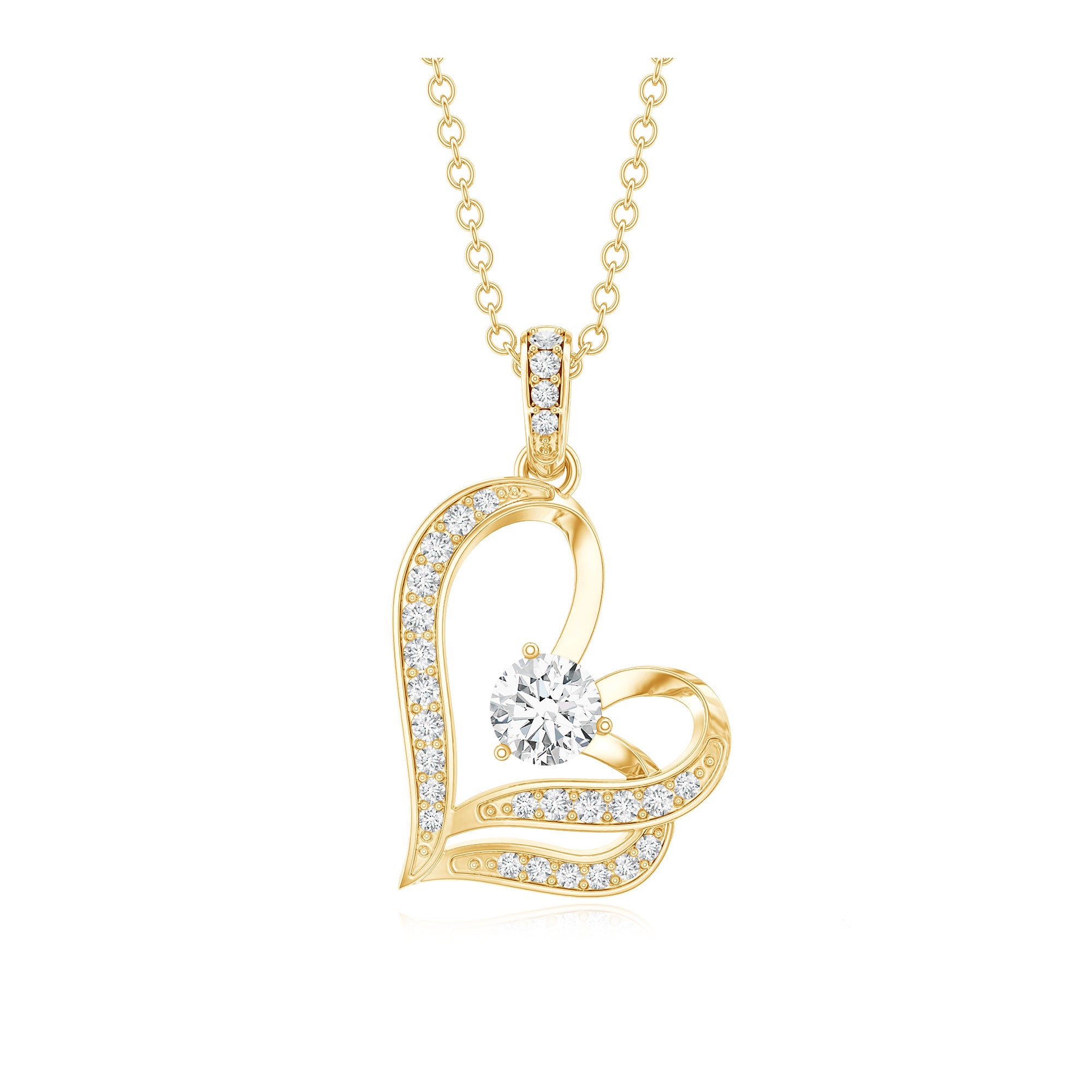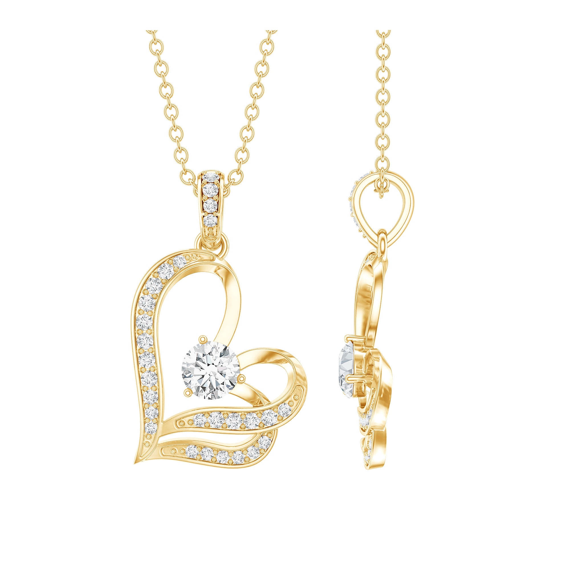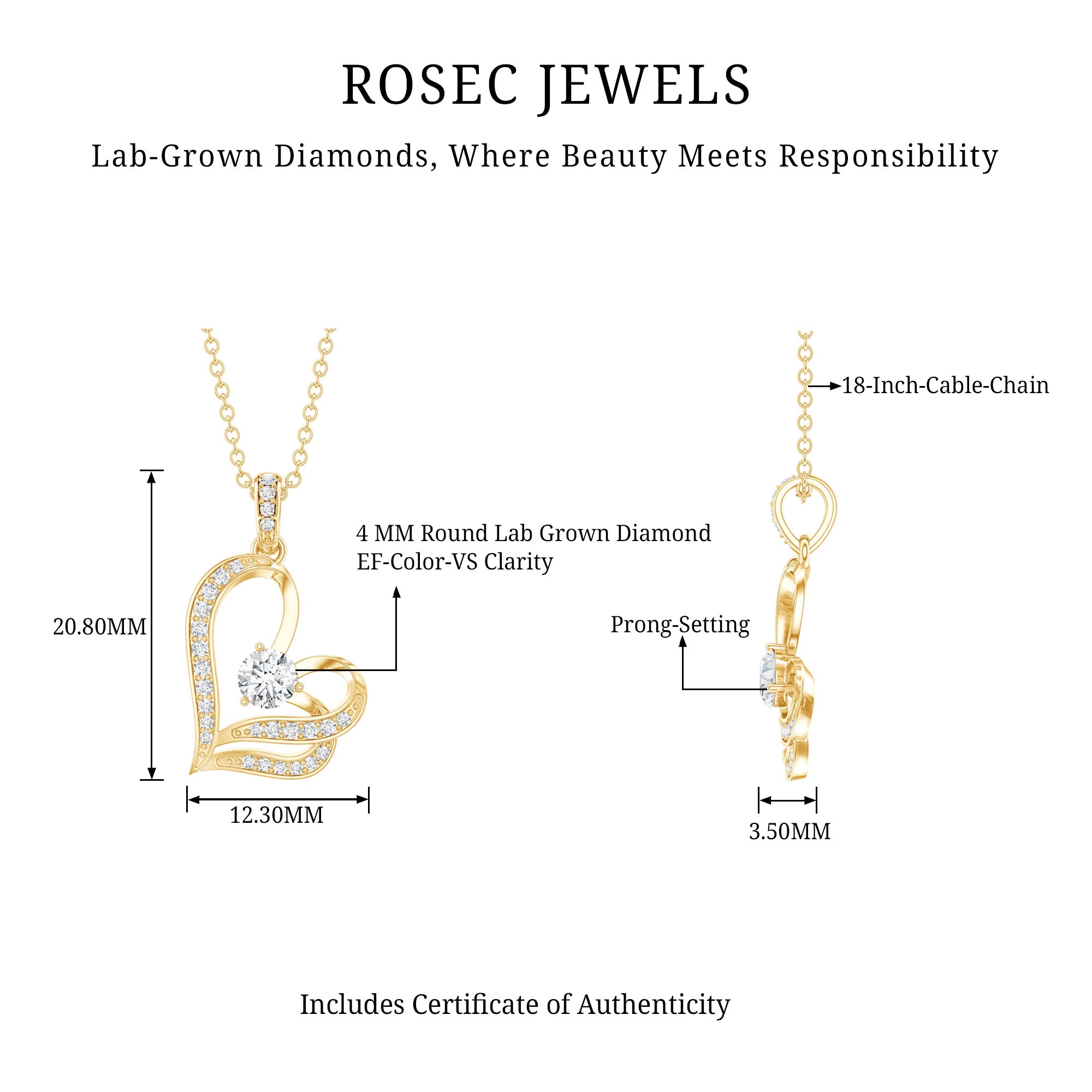 Surprise your loved one with this Heart Necklace featuring Round Shape Diamond gemstones set in a Prong Setting. The subtly tilted heart design of this Lab Grown Diamond Necklace adds a touch of uniqueness and the accent bail complements the look with more shine. Crafted with EF-VS quality diamonds, this Minimal Necklace exudes sophistication and charm. This delicate piece seamlessly blends modern elegance with timeless romance. Upgrade your style with this ethically sourced, exquisite accessory from Rosec Jewels, where craftsmanship meets compassion.