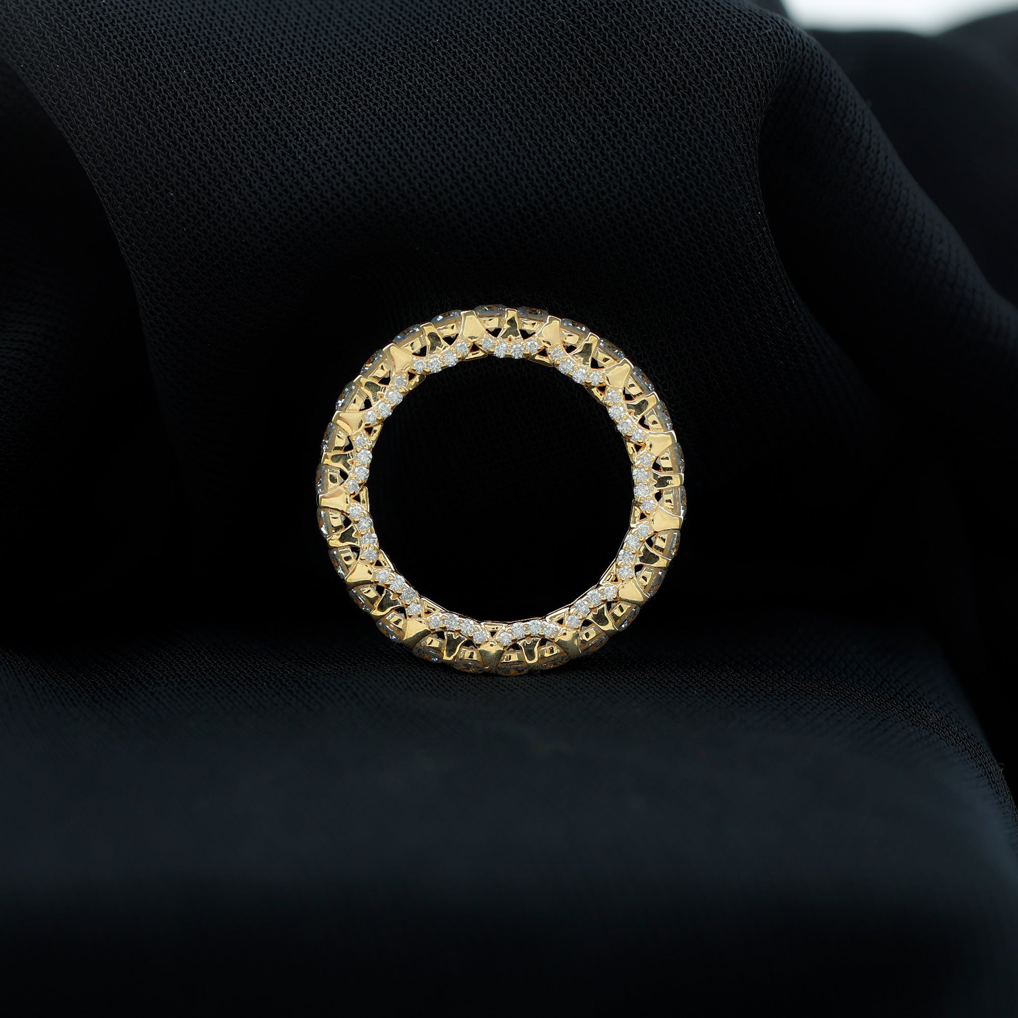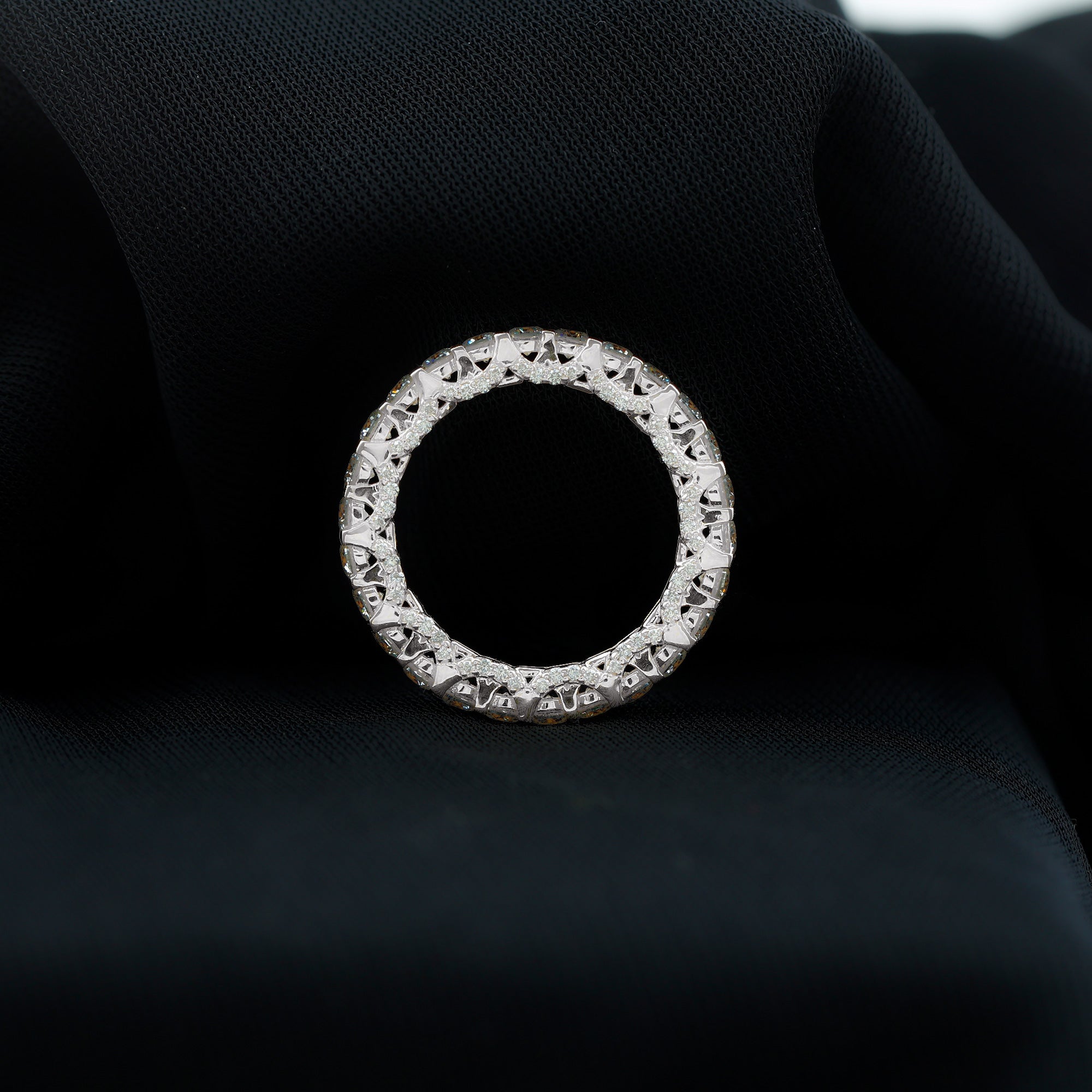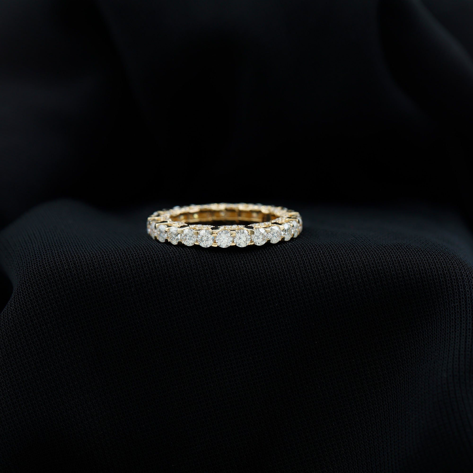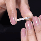 This Moissanite Eternity Band is the perfect ring for someone who loves simple sparkle. The Full Eternity Band is designed with round cut moissanite stones that go all the way around, creating a beautiful circle of shine. The trellis setting adds a gentle twist to the band, while small extra moissanites placed along the sides make the Eternity Wedding Band even more eye-catching. Made to be comfortable for everyday wear, this Moissanite Wedding Band fits smoothly on the finger and feels light yet secure. It is a lovely piece to wear on its own if you like a simple style, but it also matches perfectly with engagement rings or other stacking bands. You can mix it with different rings to create your own personal set. Because the stones form an unbroken circle, this Moissanite Anniversary Band represents never-ending love, loyalty, and togetherness. This makes it a meaningful choice for a wedding band, an anniversary gift, or a special surprise for someone you care about. Whether it is worn daily or saved for special moments, the soft glow of D-VS1 quality moissanite adds an elegant touch that never goes unnoticed.