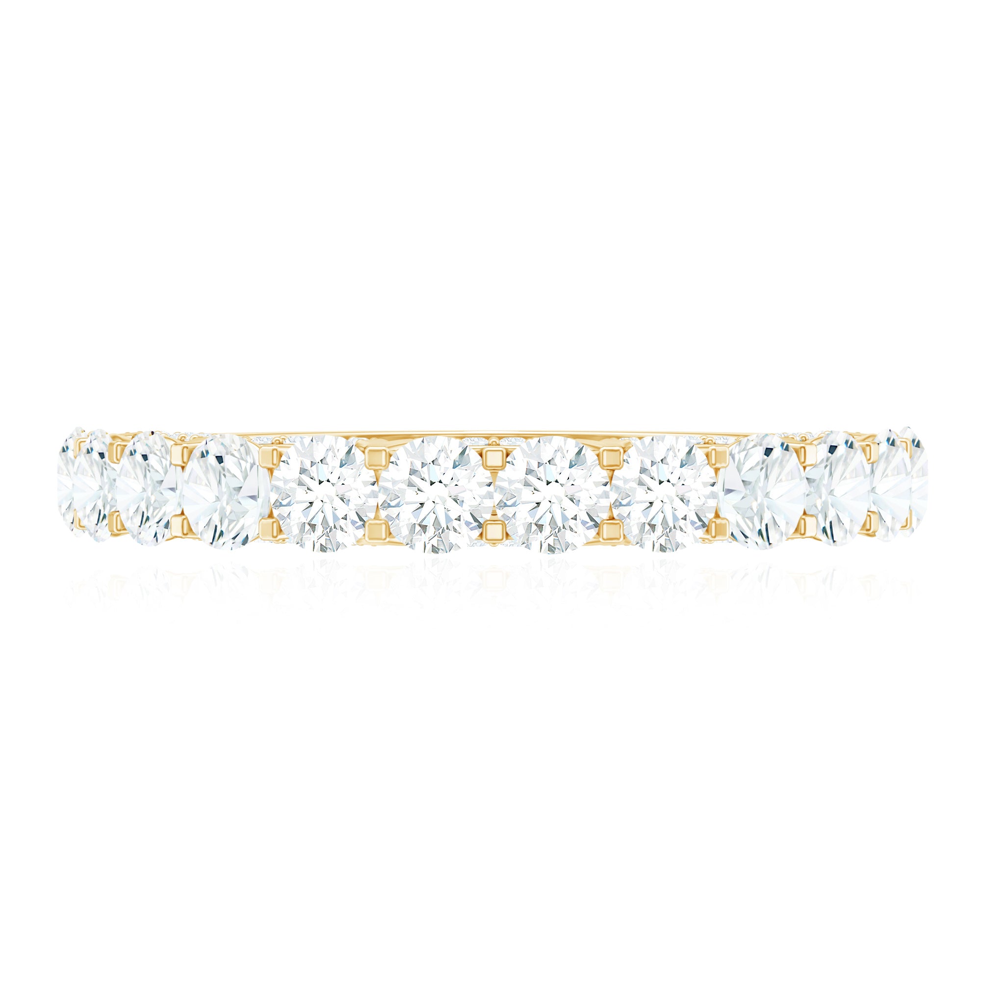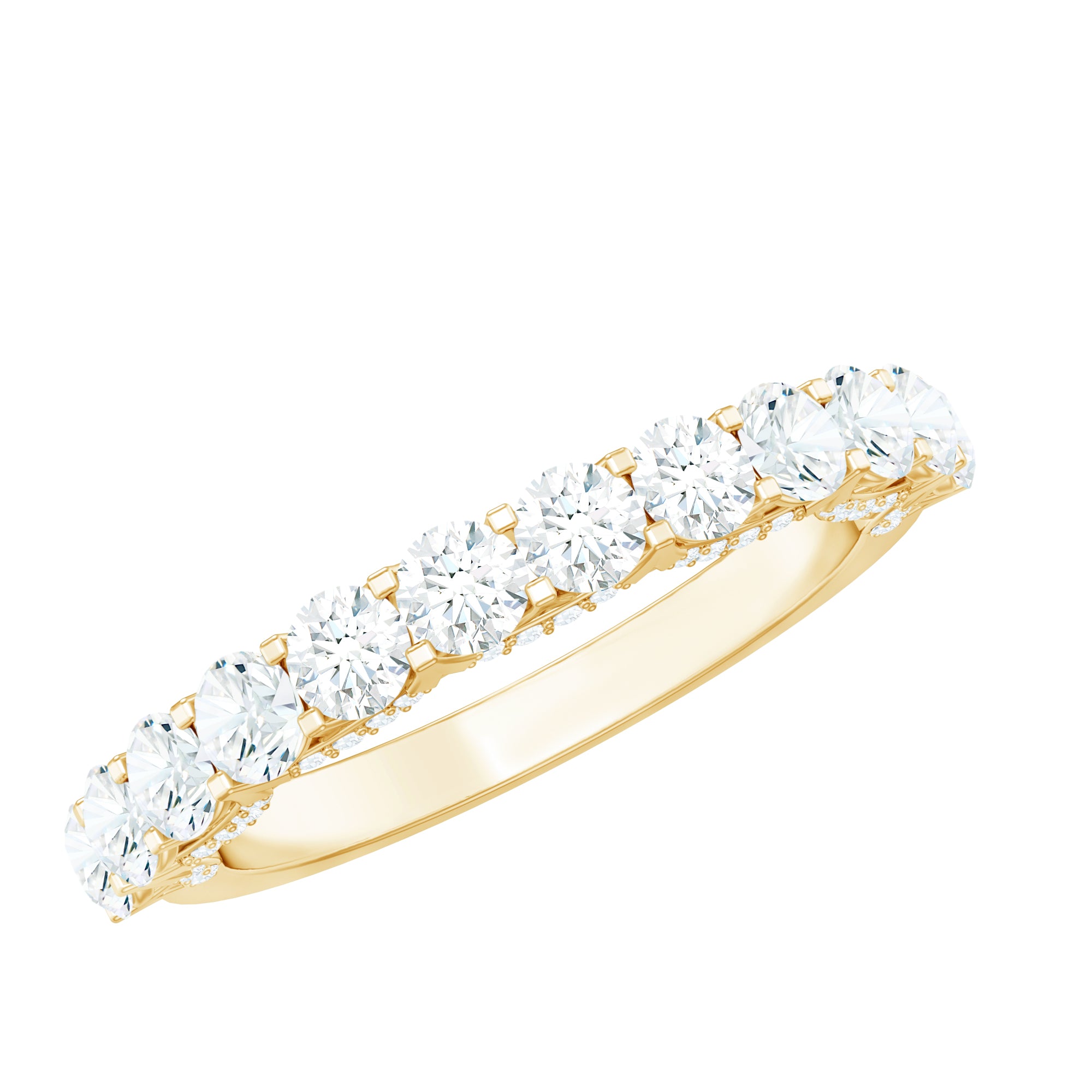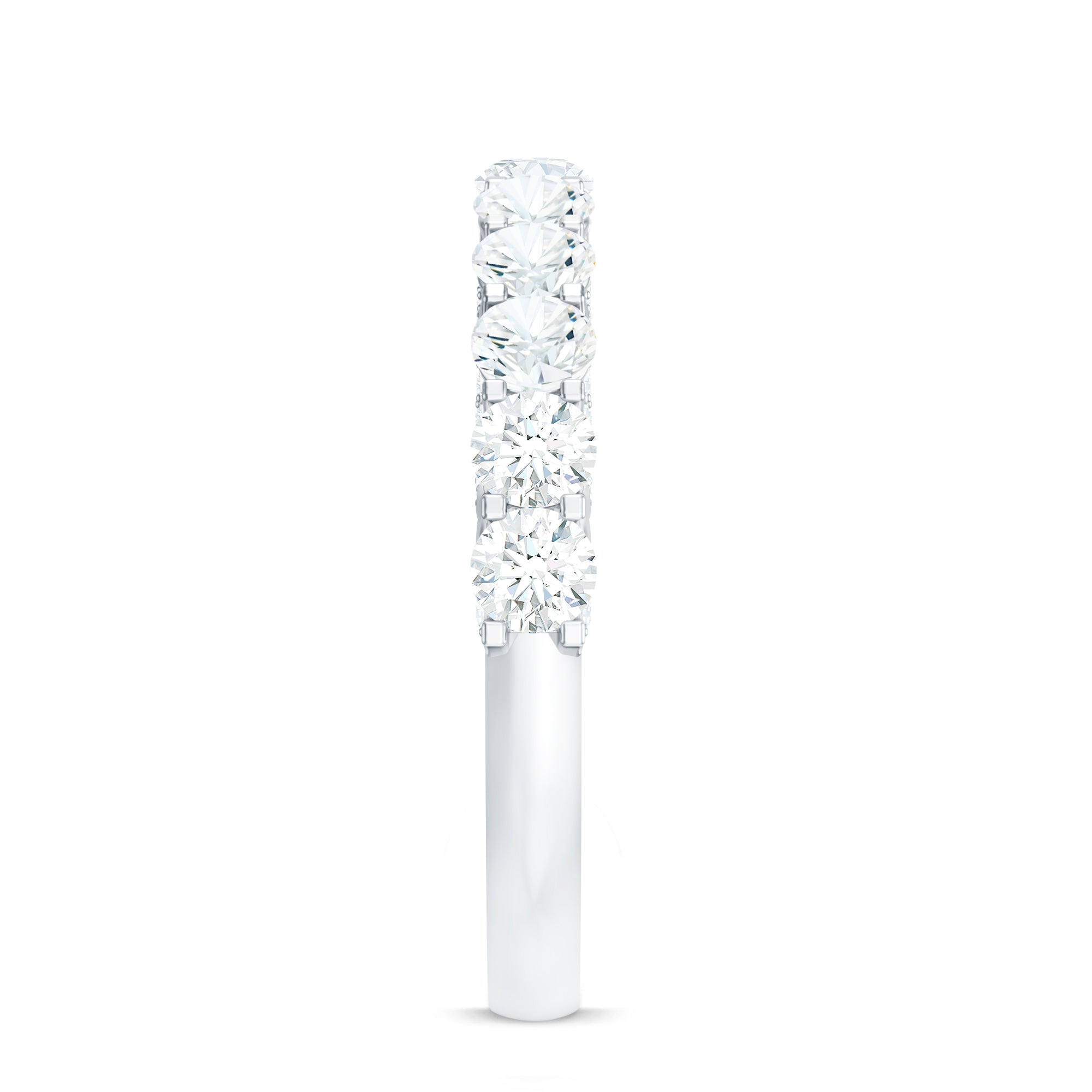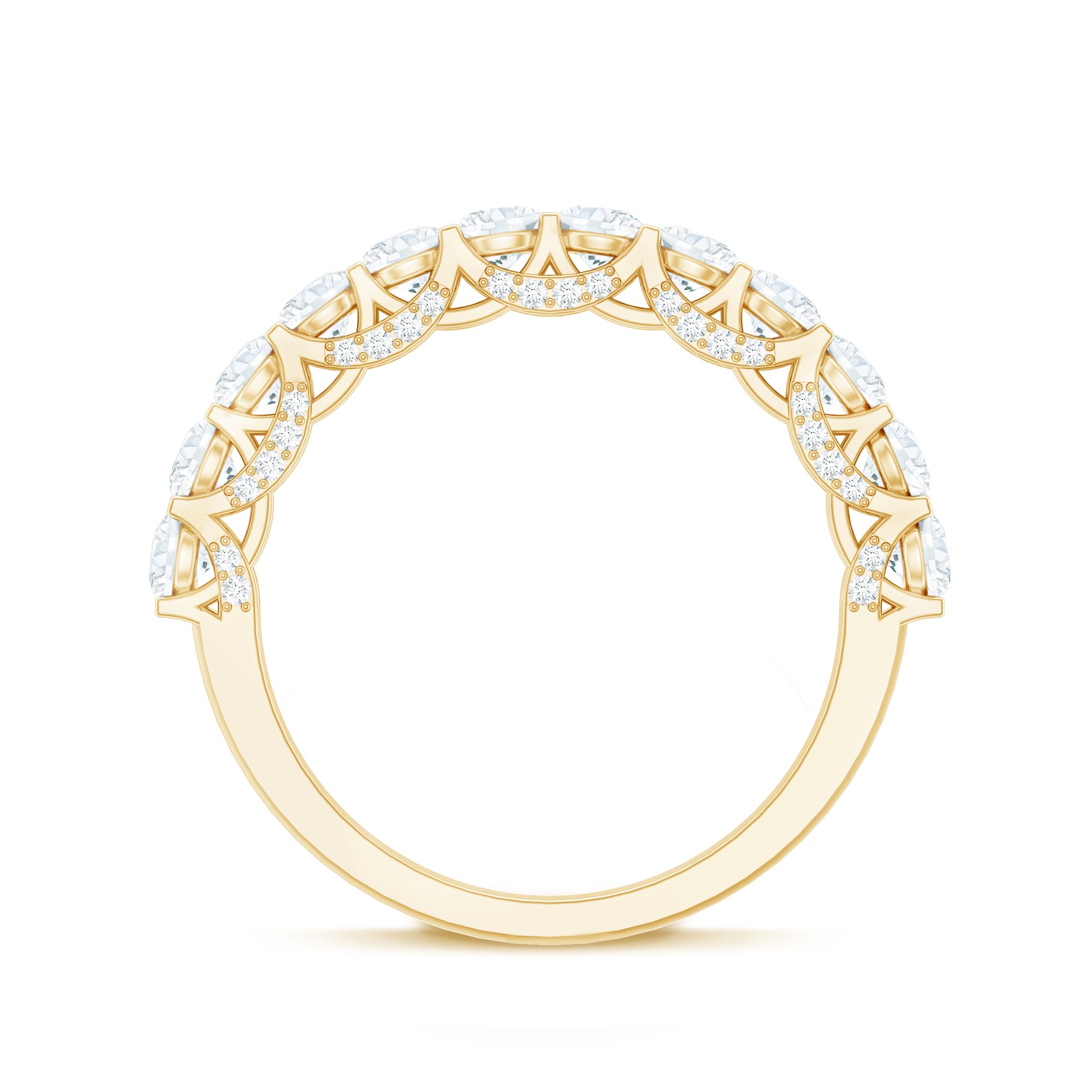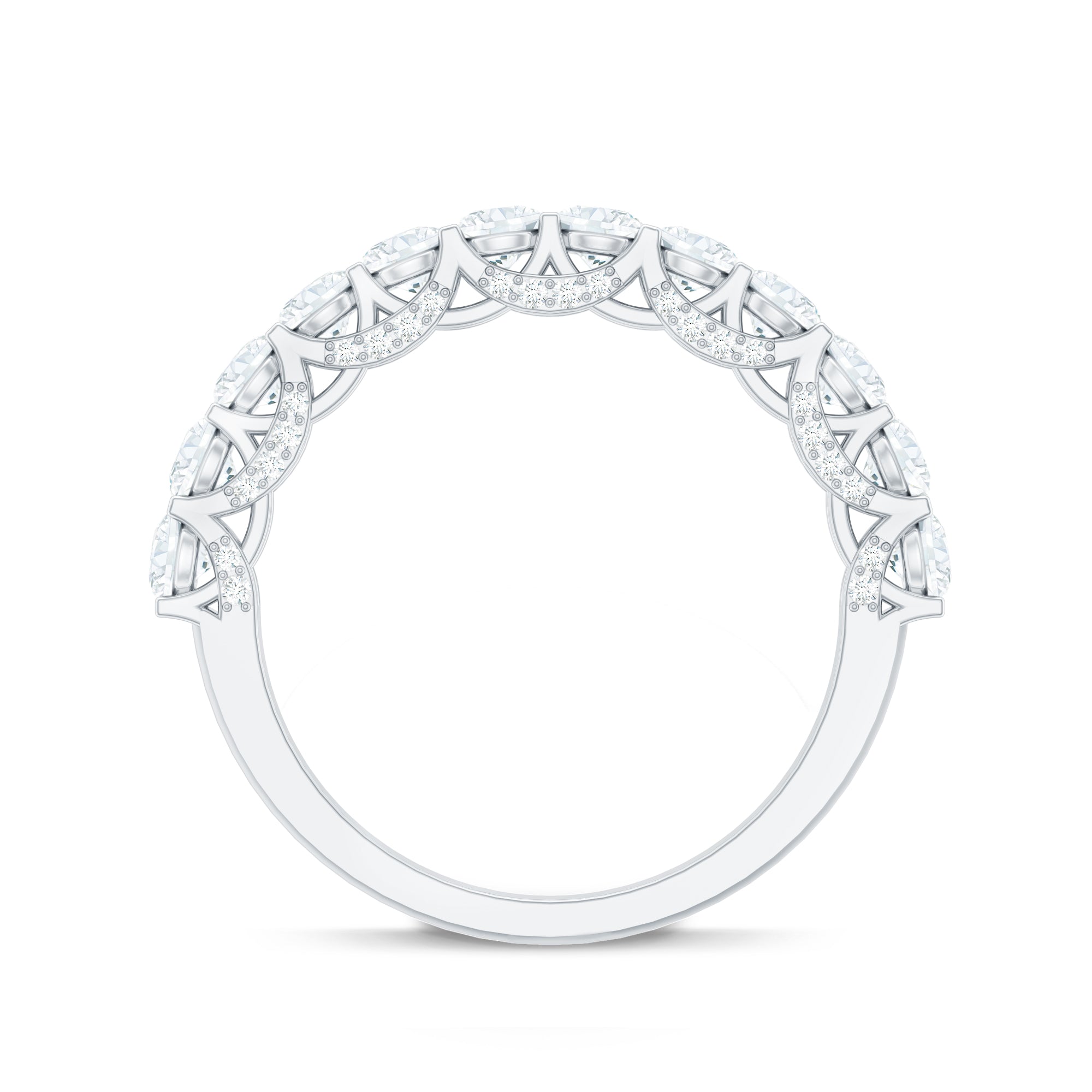 Gracefully encircling half of this exquisite eternity ring, the resplendent Moissanite Stones radiate an air of refinement and grace. To enhance this elegance, the coastal crescent patterns, delicately adorned with petite moissanite gems, introduce an exclusive and enchanting touch to the ring periphery, heightening its overall luminosity and allure.
