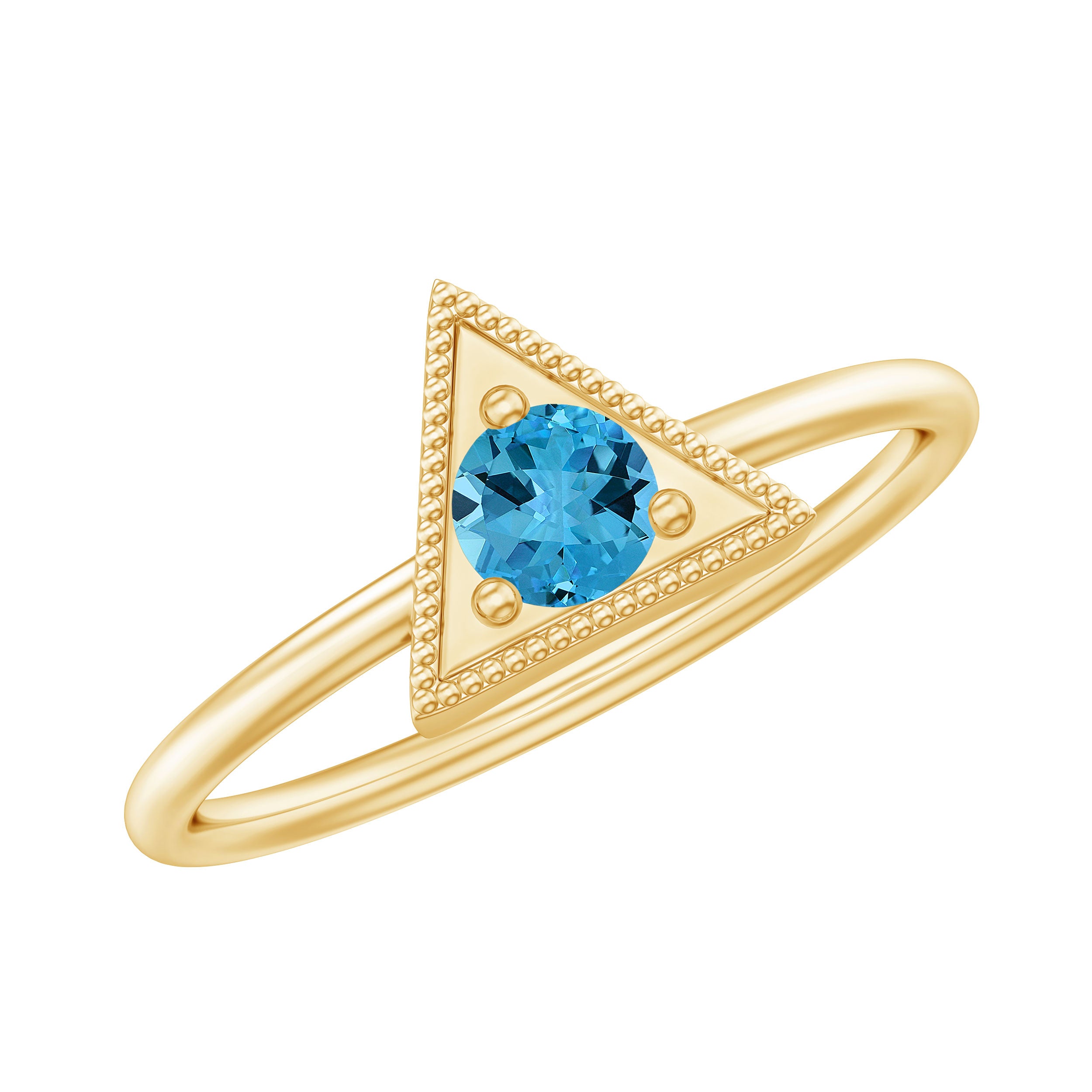 This Valentines day make surprise your beloved by gifting this Gold Triangle Shape Ring embellished with Round Shape Swiss Blue Topaz Gemstone is set at the center in Triangle Frame in a Prong Setting with Milgrain Detailing, crafted in a Solid Gold Metal.