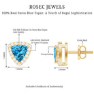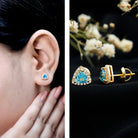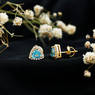 Bright blue sparkle meets timeless elegance in these Blue Topaz Stud Earrings. Made from yellow gold plated silver, these Halo Earrings feature a unique and eye-catching design that is perfect for everyday wear or special occasions. At the center of each earring is a 5 MM trilliant cut Swiss Blue Topaz, set securely in prong setting to keep them safe and sparkling. Surrounding each blue topaz is a halo of round lab grown diamonds, adding extra brilliance and contrast. Together, the rich blue color stone and sparkling white stones create a look that is simple, bold, and stylish. These Swiss Blue Topaz Earrings come with screw back closures, offering a secure and comfortable fit, so you can wear them all day with confidence. Whether you are dressing up or keeping it casual, these Triangle Earrings are a great way to add color and shine to your outfit. Whether you are buying them for yourself or as a gift for someone special, they are sure to be loved. Timeless, bright, and easy to wear, these Swiss Blue Topaz and Diamond Earrings are a wonderful way to bring a little joy and color to your jewelry collection.