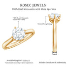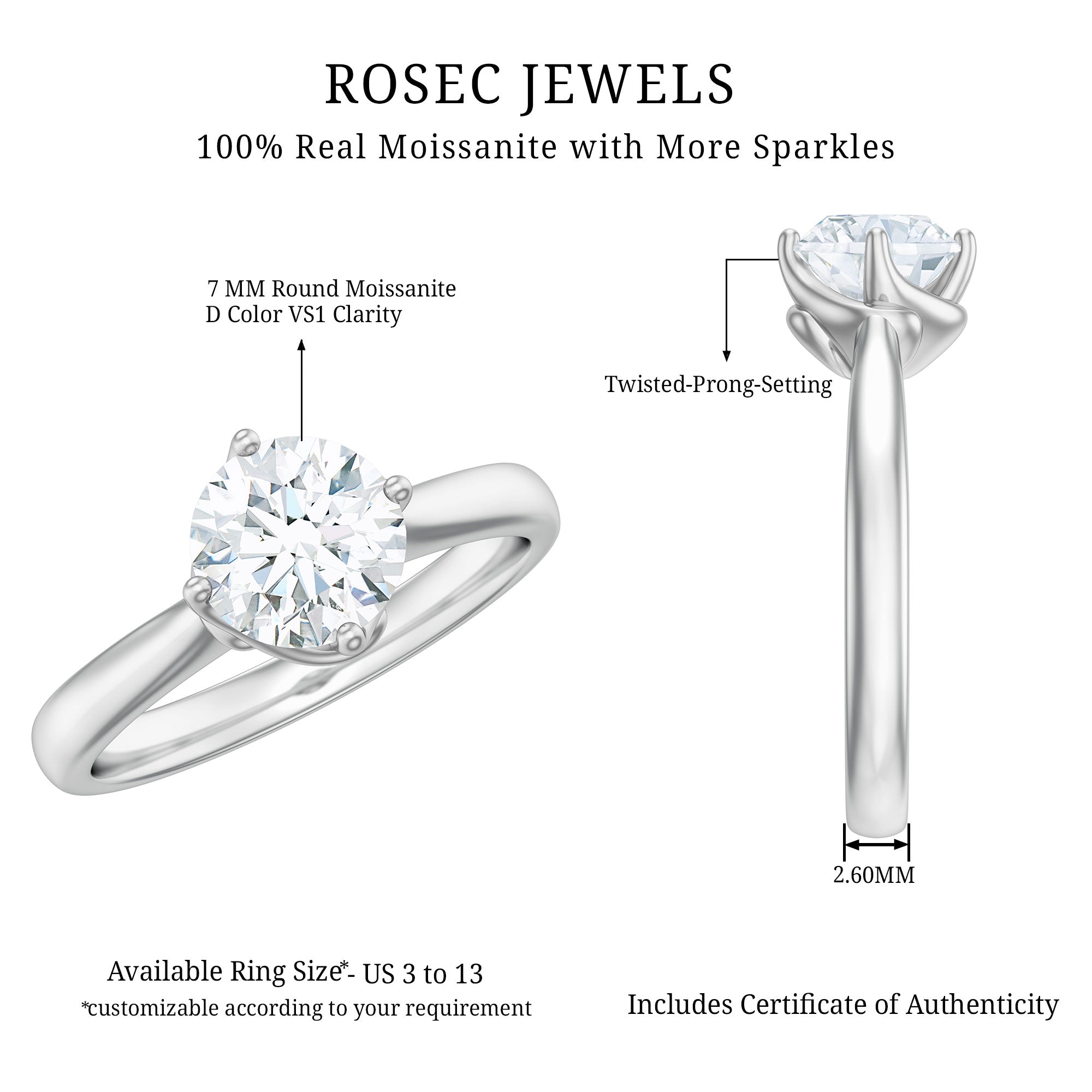 Mark your forever with the timeless elegance of this Moissanite Engagement Ring, thoughtfully designed to reflect the beauty of true connection. At the heart of this romantic piece lies a dazzling 7 MM round cut moissanite, chosen for its exceptional D Color VS1 Clarity, radiating brilliance from every angle. The moissanite is secured in a twisted prong setting, a graceful representation of two lives intertwined, moving forward together as one. With its clean lines and gentle curves, this Solitaire Engagement Ring captures attention without being overpowering. The 1 Carat Moissanite Ring blends traditional charm with a modern edge, making it an elegant symbol of love, commitment, and new beginnings. The sleek, sophisticated design gives it versatility, allowing it to transition effortlessly from proposal to everyday wear. Perfect as a promise ring or engagement piece, this Round Moissanite Ring is ideal for those who appreciate classic style with a fresh, modern feel. Available in US sizes 3 to 13 and crafted to your preference in a variety of metal options, this ring ensures a flawless fit and personalized experience. This Solitaire Moissanite Ring is thoughtfully packaged in a signature jewelry box and comes with a gemstone certificate, making it gift-ready for your special occasion.