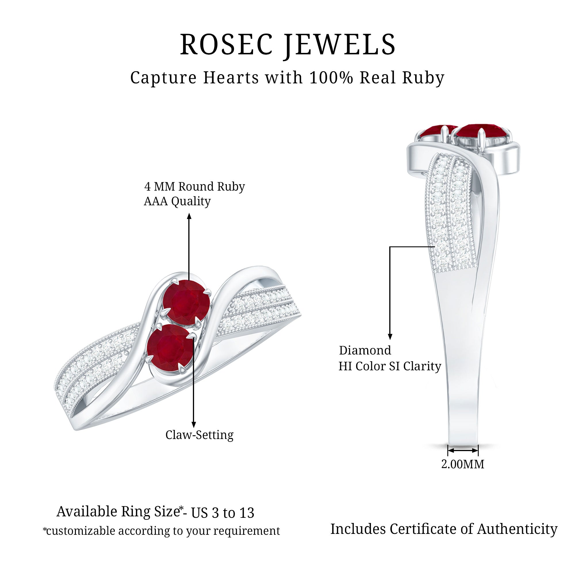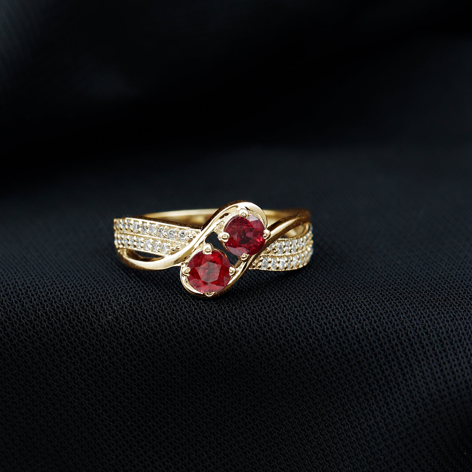 Unmatched in beauty and elegance, this Two Stone Engagement Ring is the classic look she has been dreaming of. Features two Round Cut Ruby secured in Claw Setting, additional Round Cut Diamonds dance down the band in two rows while Beaded Detailing finishes the look.