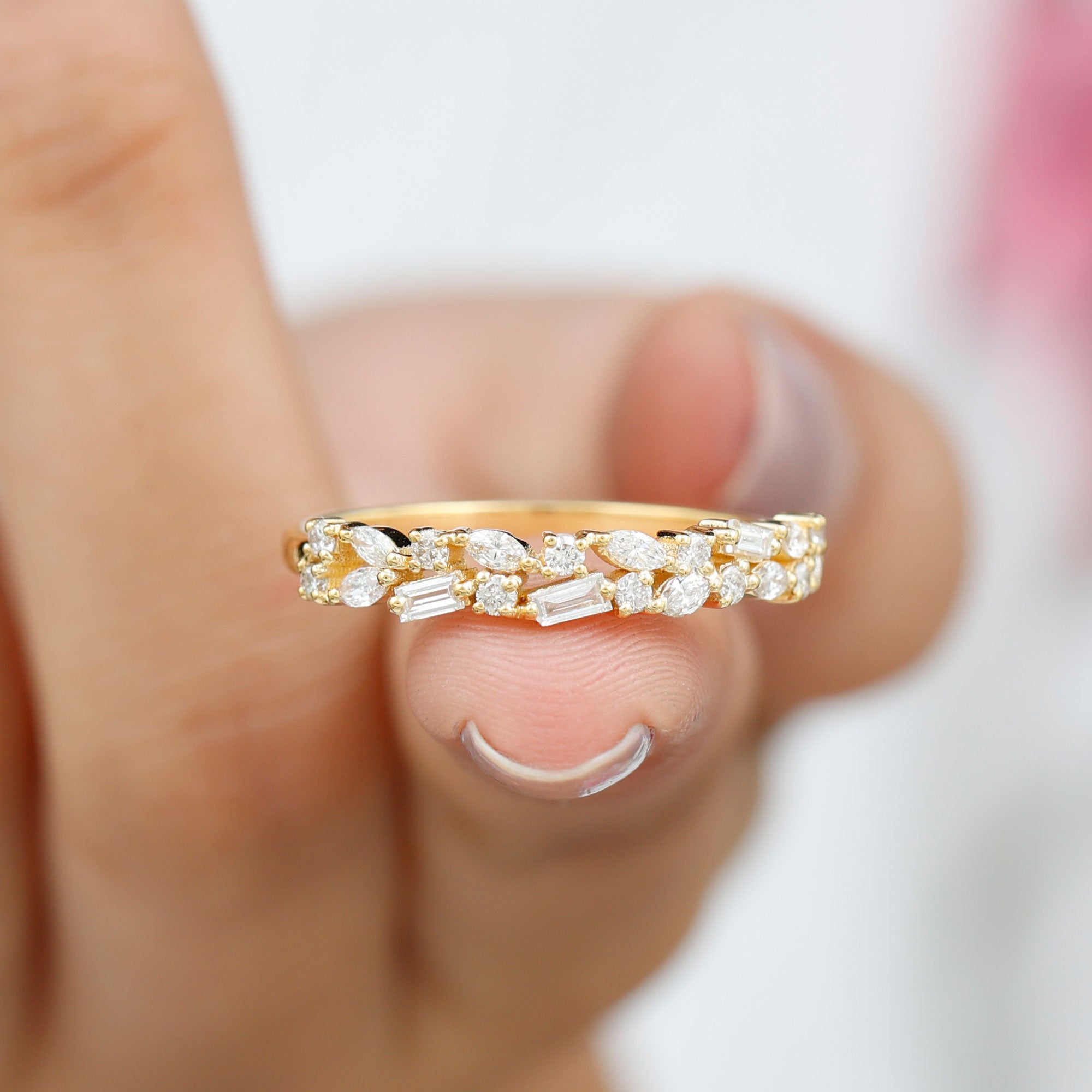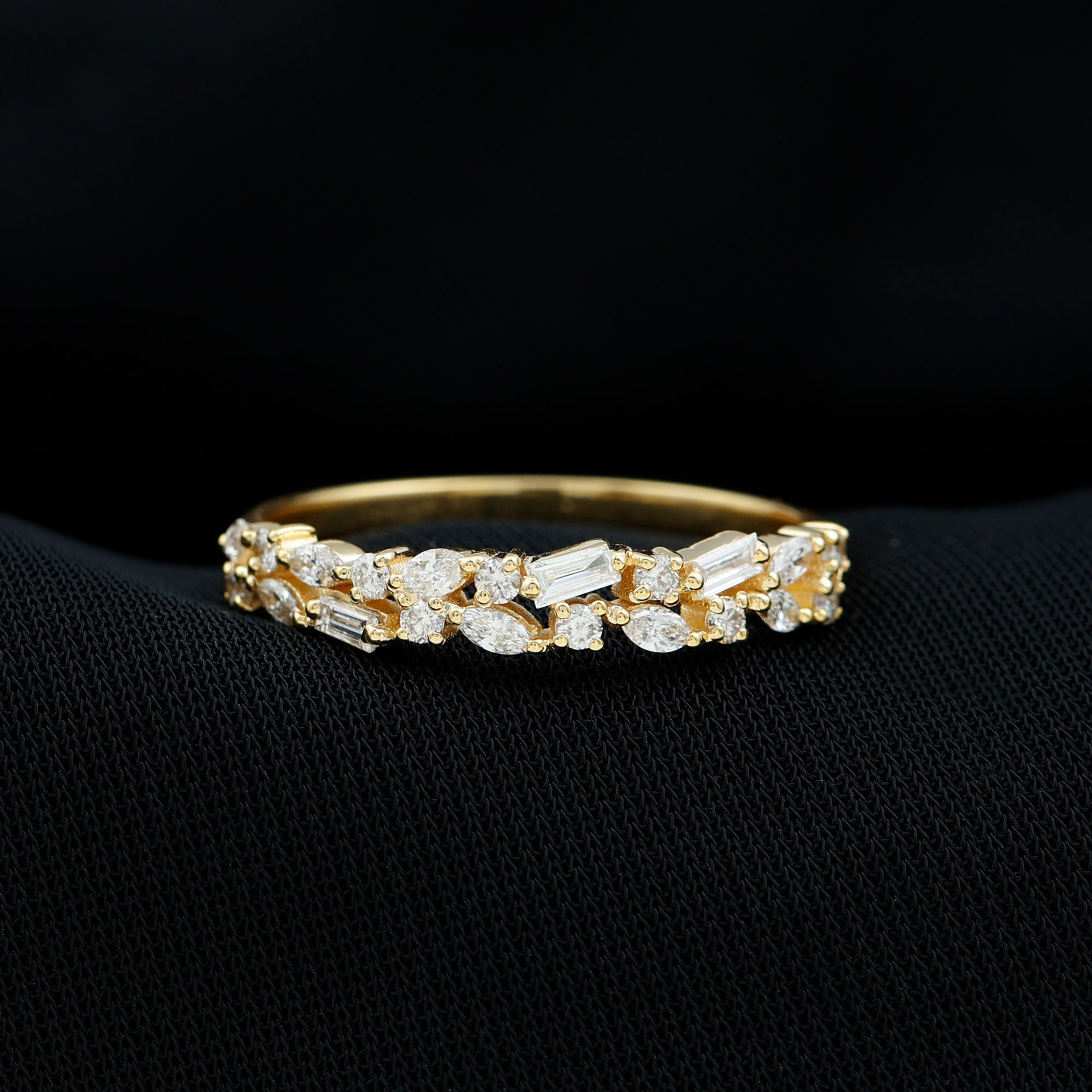 Celebrating the timeless charm of sparkling stones, this Moissanite Wedding Band boasts a delicate design that enchants with its elegance. As a genuine showstopper, this Moissanite Band Ring is carefully crafted by our talented artisans using top-notch metal and certified stones, perfectly enhancing its beauty while offering outstanding value. The Cluster Eternity Band features a stunning mix of marquise, baguette, and round cut moissanite stones, held in place by prong setting that embellishes half of the band. Symbolizing your love, this band wraps around your finger in a half eternity style, stirring up feelings of romance and nostalgia. This Minimalist Eternity Ring lets you celebrate your union with a symbol of radiant beauty that shines even brighter with every glance. Its intricate details come together to create a wedding ring that will truly resonate with you. The Moissanite Stackable Ring will be delivered in a signature jewelry box for safekeeping when not in use, along with a certificate of authenticity. With options to customize both the metal color and type, you can make this piece uniquely yours. Available in US ring sizes 3 to 13, it is designed for a perfect fit because every great love story deserves nothing less than perfection.