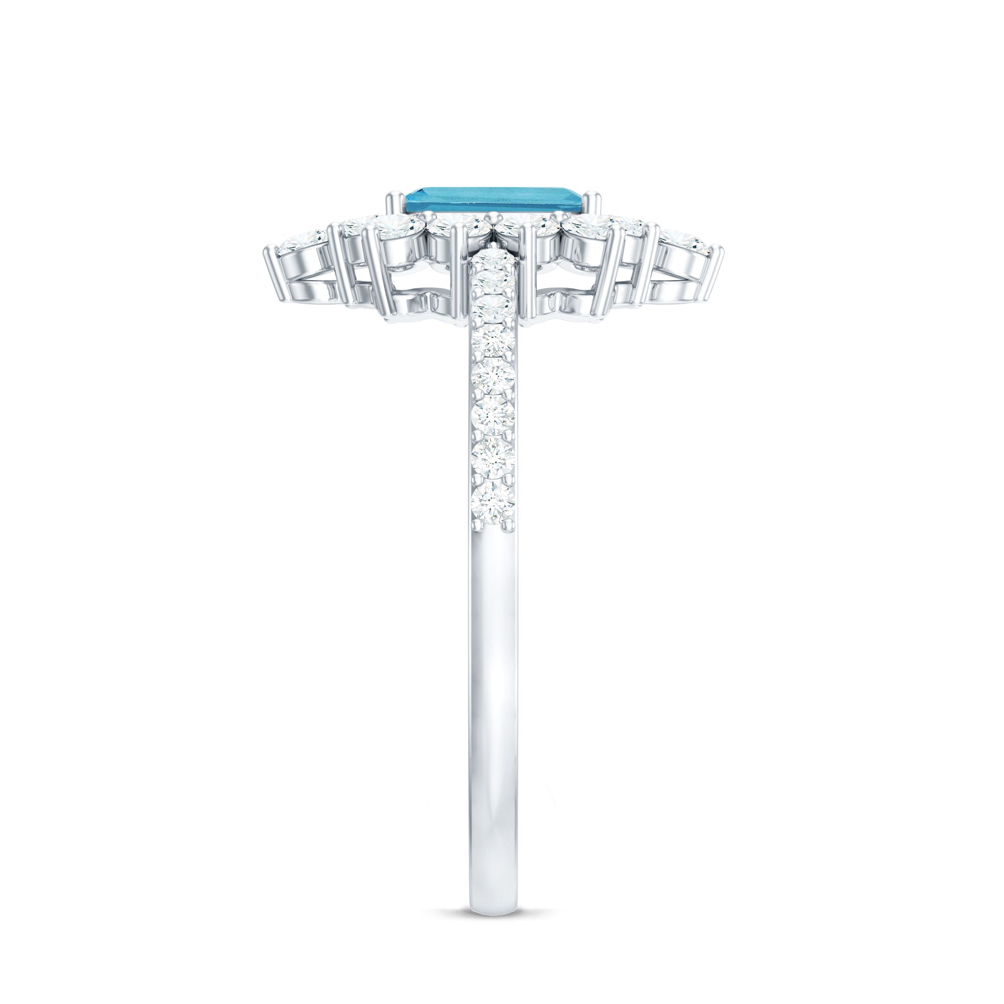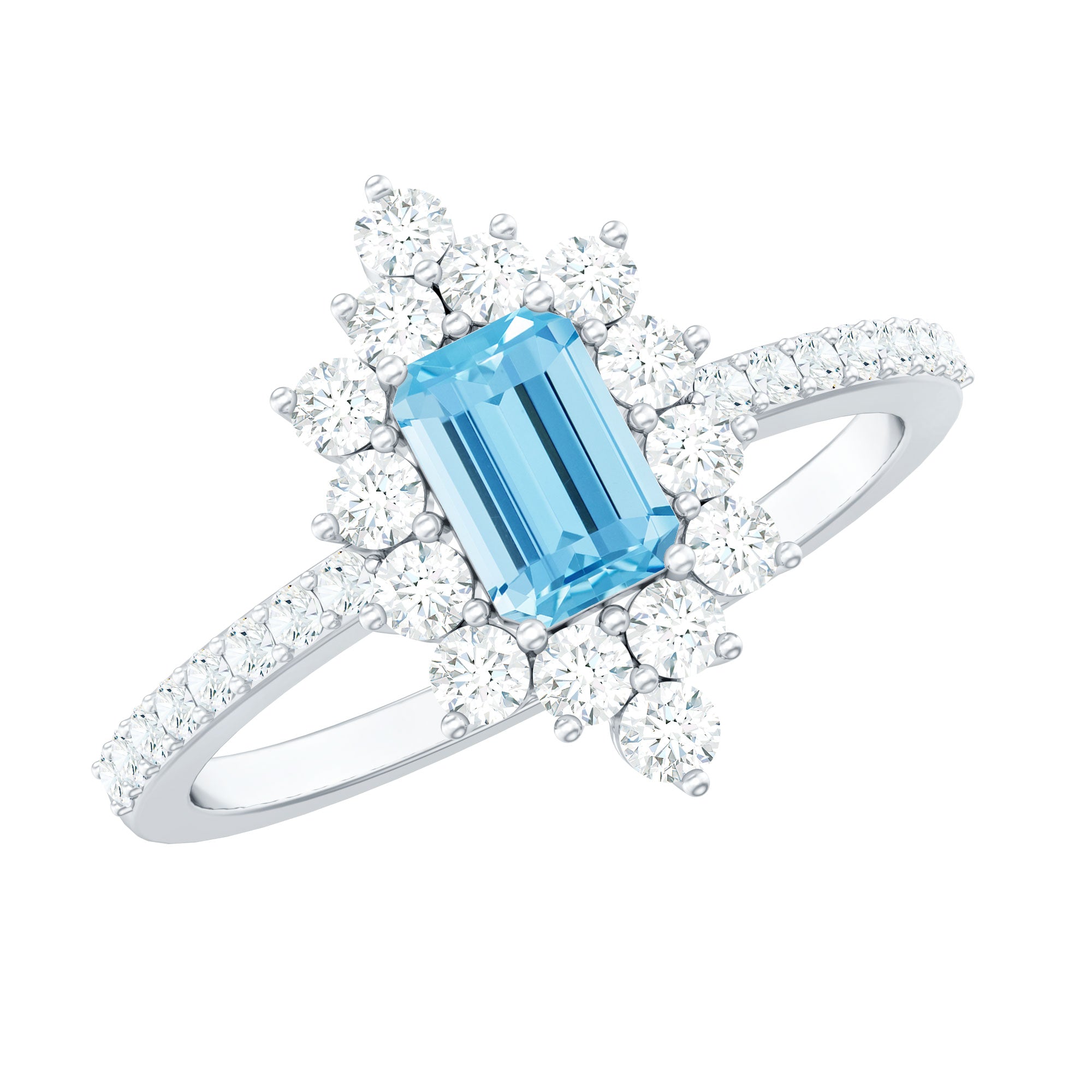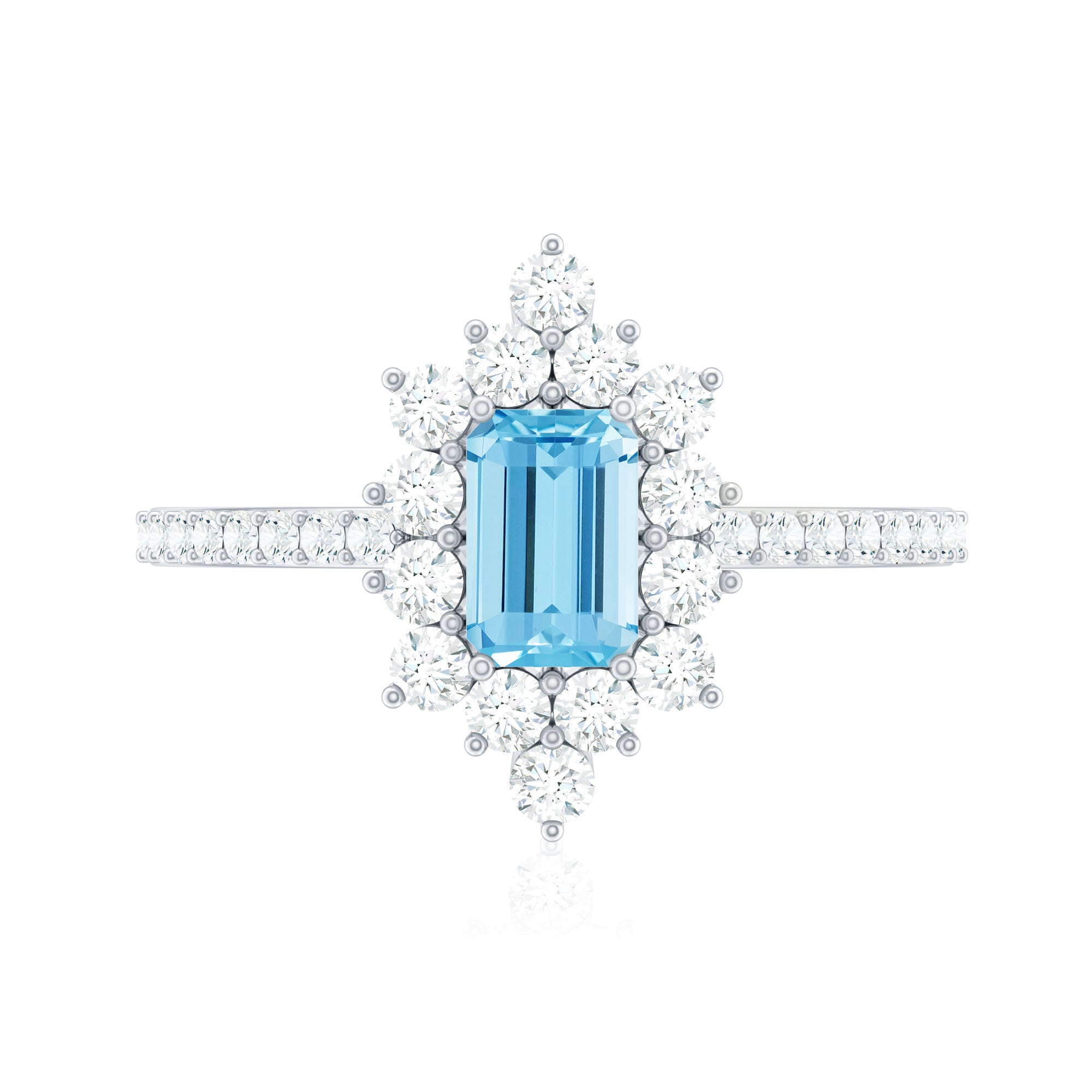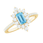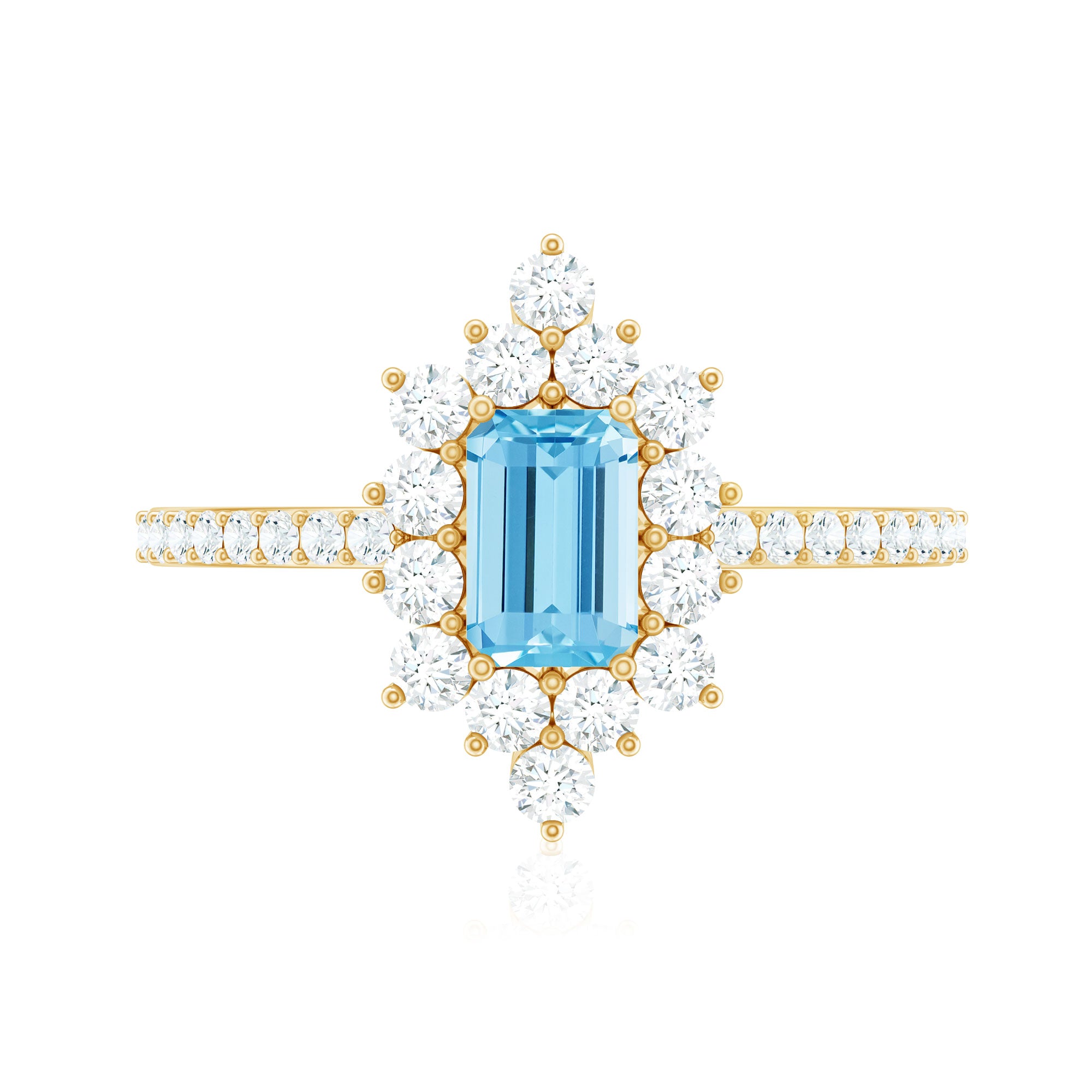 Get ready for the party look with this beautiful Vintage Inspired Engagement Ring. This Halo Engagement Ring is embellished with 4X6 MM Octagon Cut Aquamarine in the center with Round Diamond set in a halo and Side Stones. This Aquamarine Engagement Ring is crafted in Gold Metal.