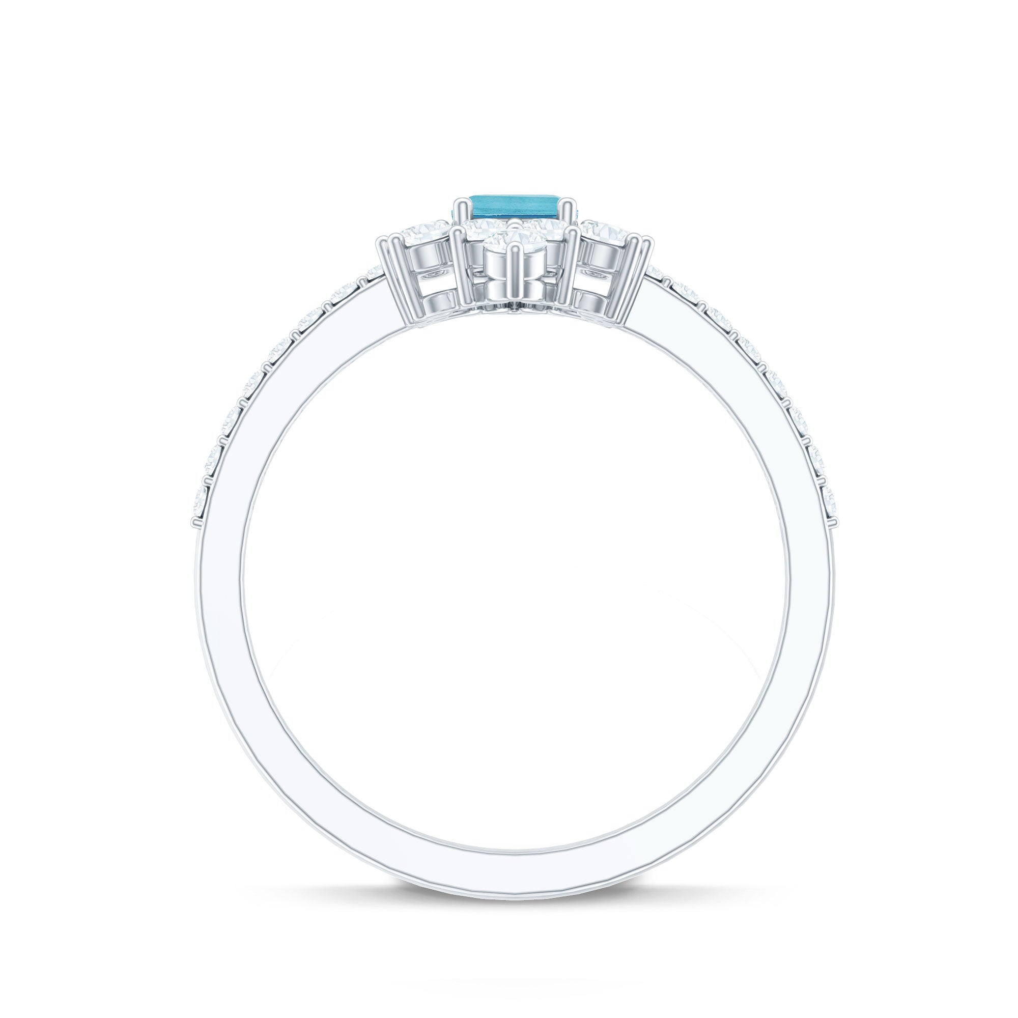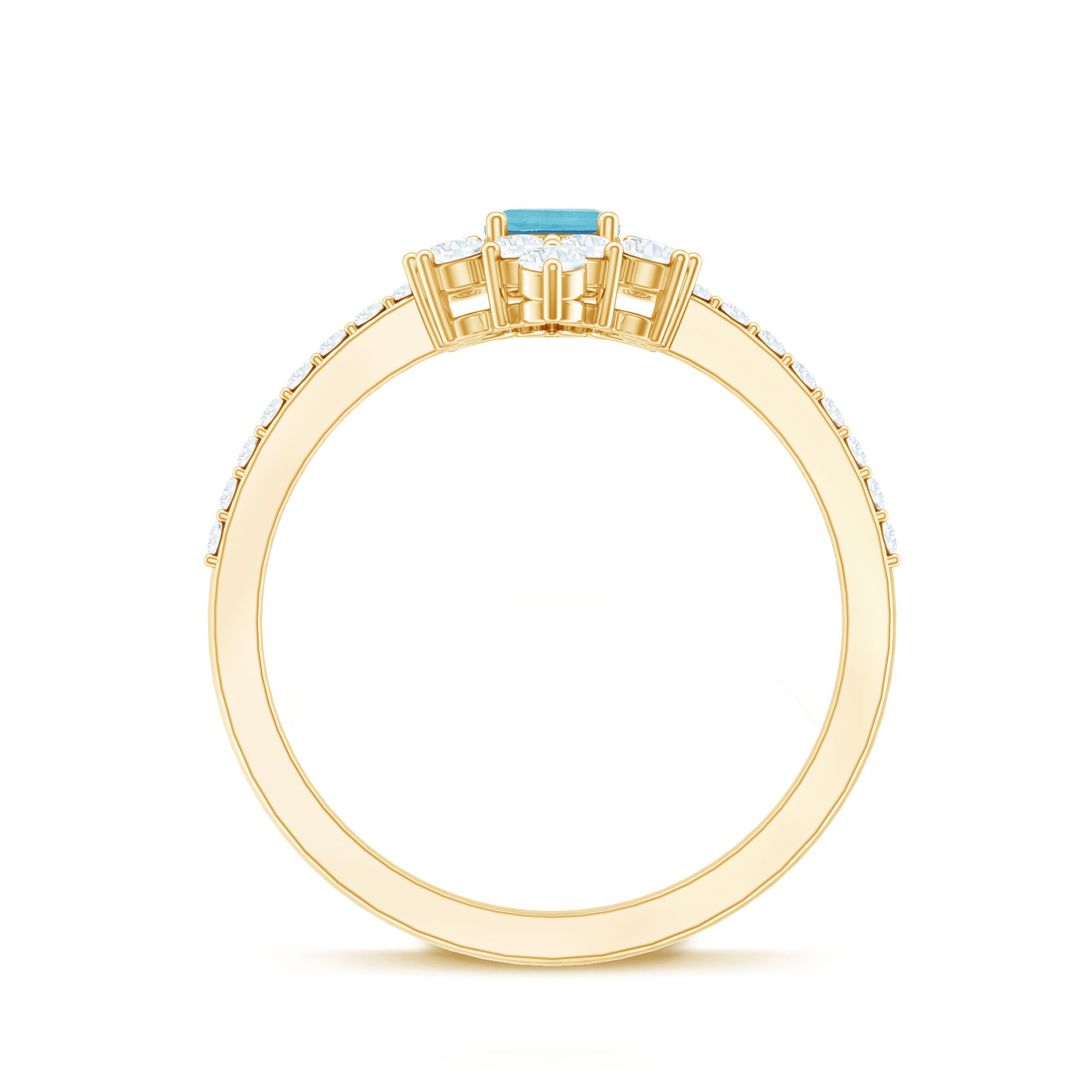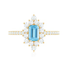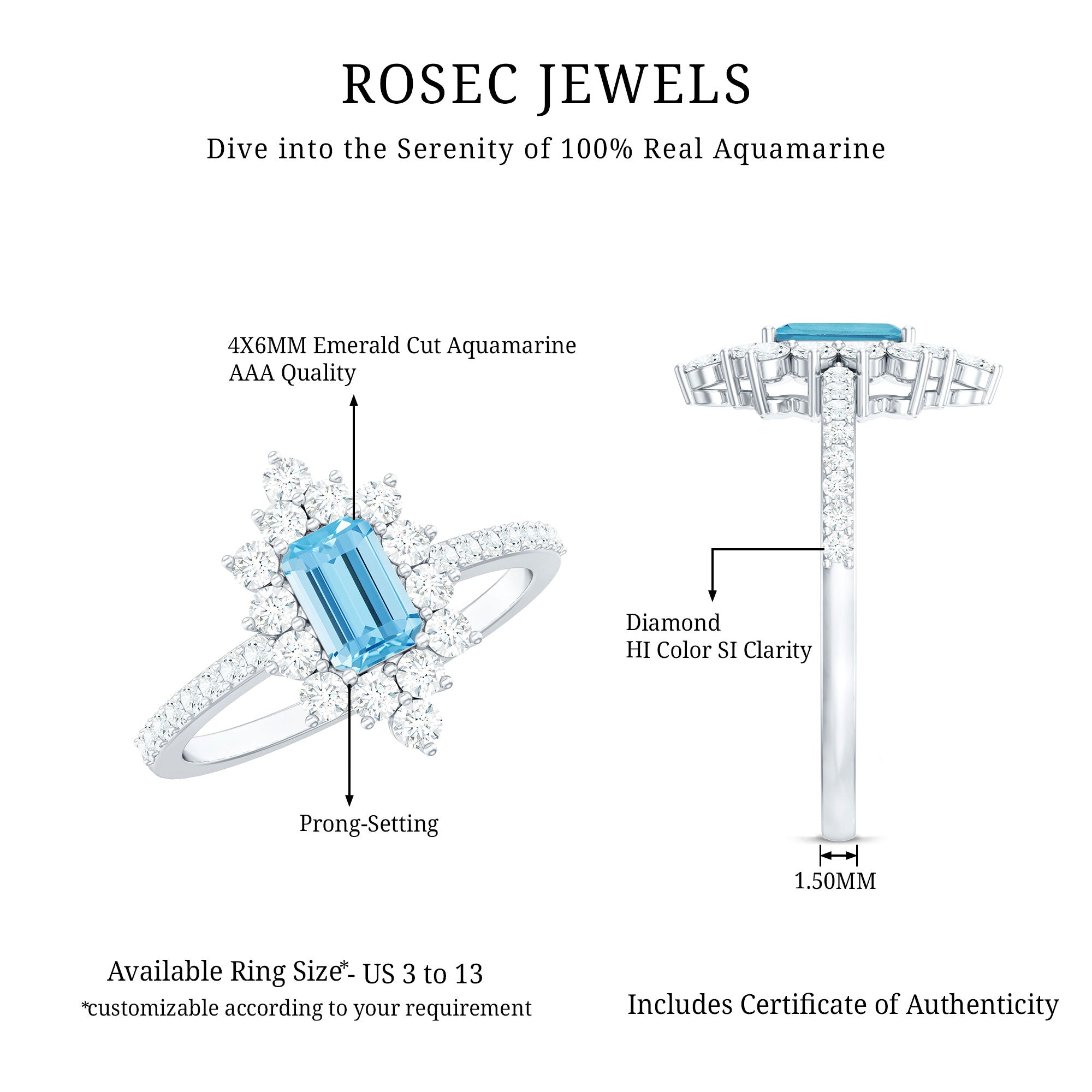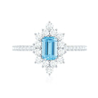 Get ready for the party look with this beautiful Vintage Inspired Engagement Ring. This Halo Engagement Ring is embellished with 4X6 MM Octagon Cut Aquamarine in the center with Round Diamond set in a halo and Side Stones. This Aquamarine Engagement Ring is crafted in Gold Metal.