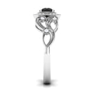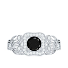 An Amazing and Fabulous Vintage Engagement Ring is a perfect gift for your lady. This Engagement Ring is decorated with Round Shape Created Black Diamond in the center and a Round Diamond in a halo and side stone style. The milgrain floral design set with Diamond stones magnifies the piece. This Created Black Diamond Engagement Ring is mounted in Gold Metal.