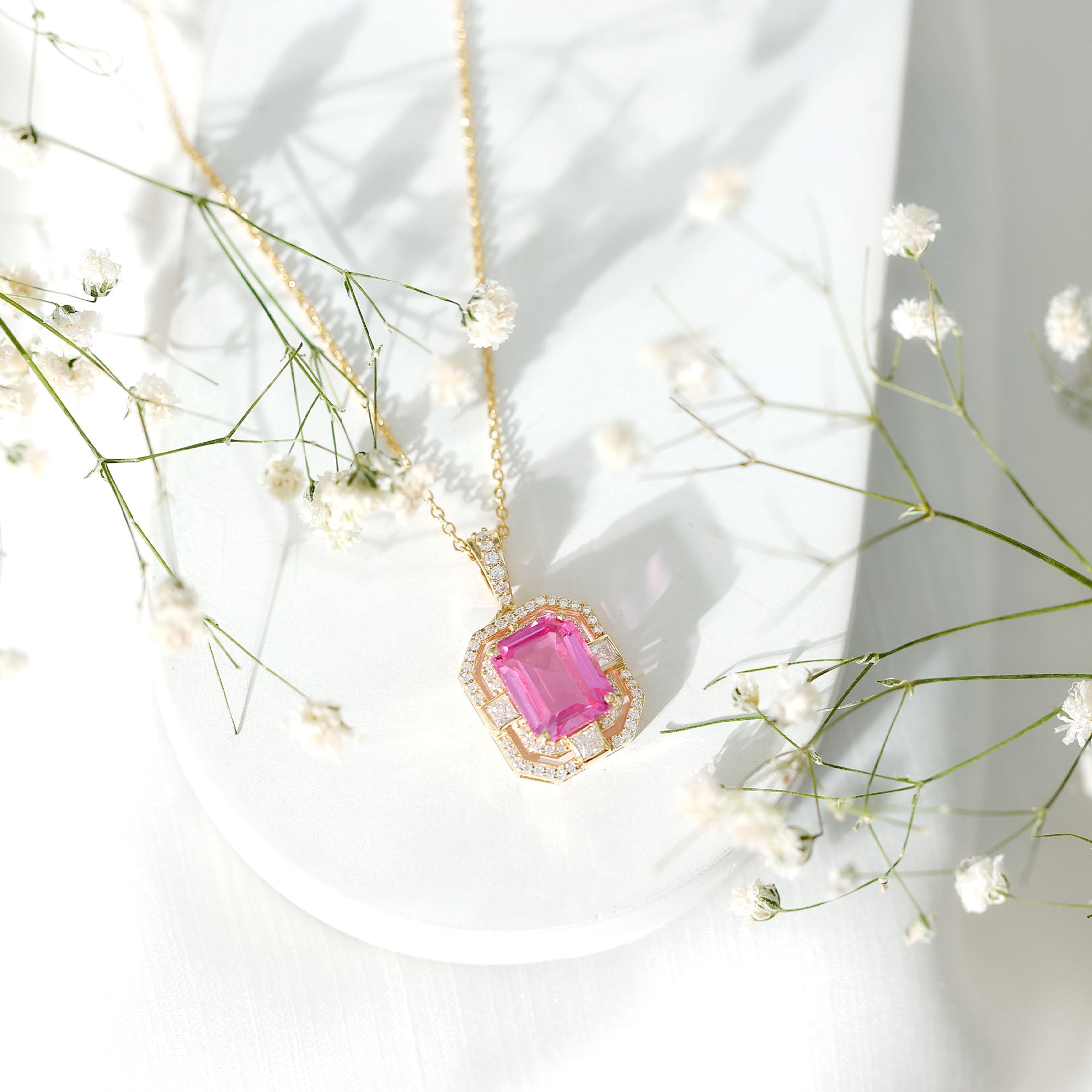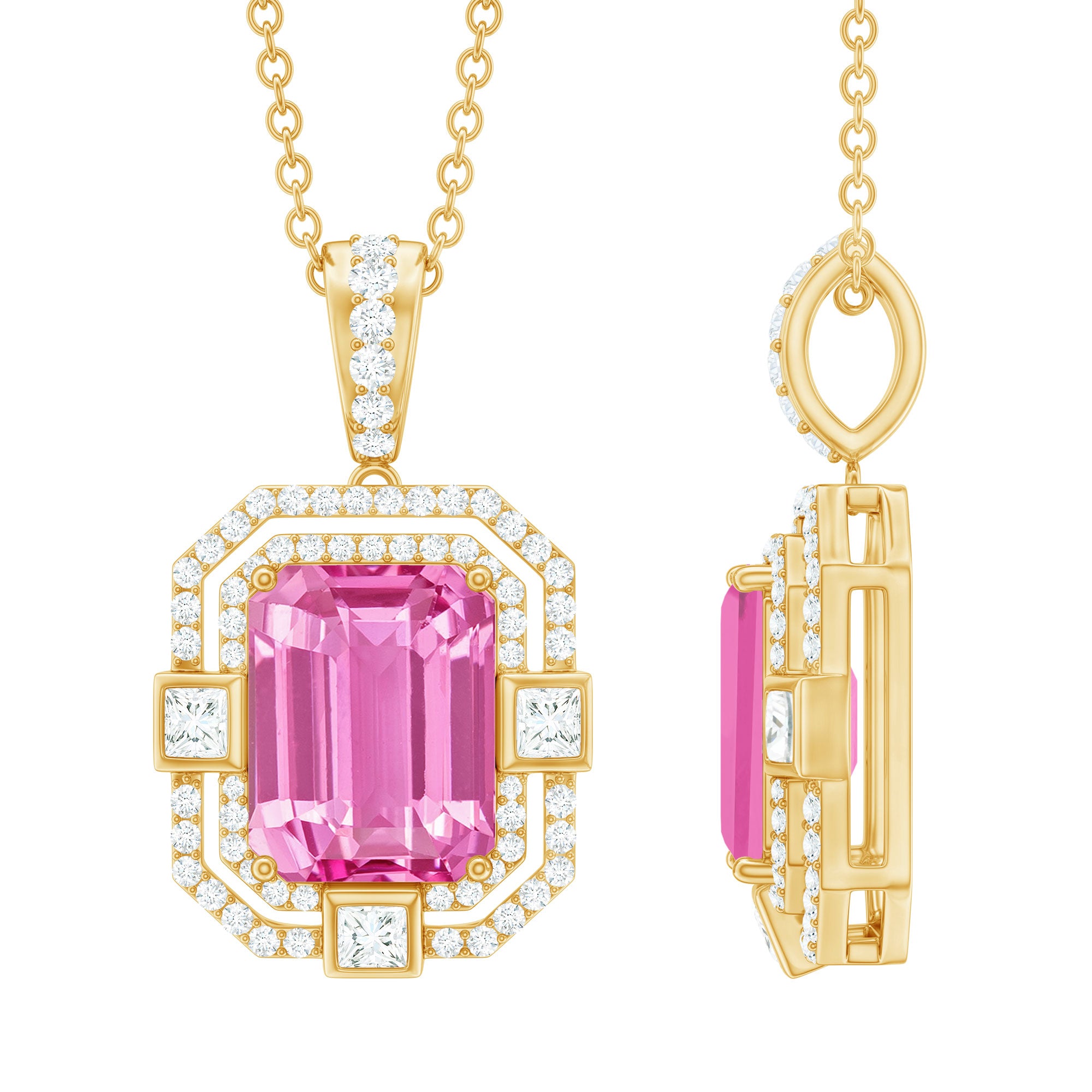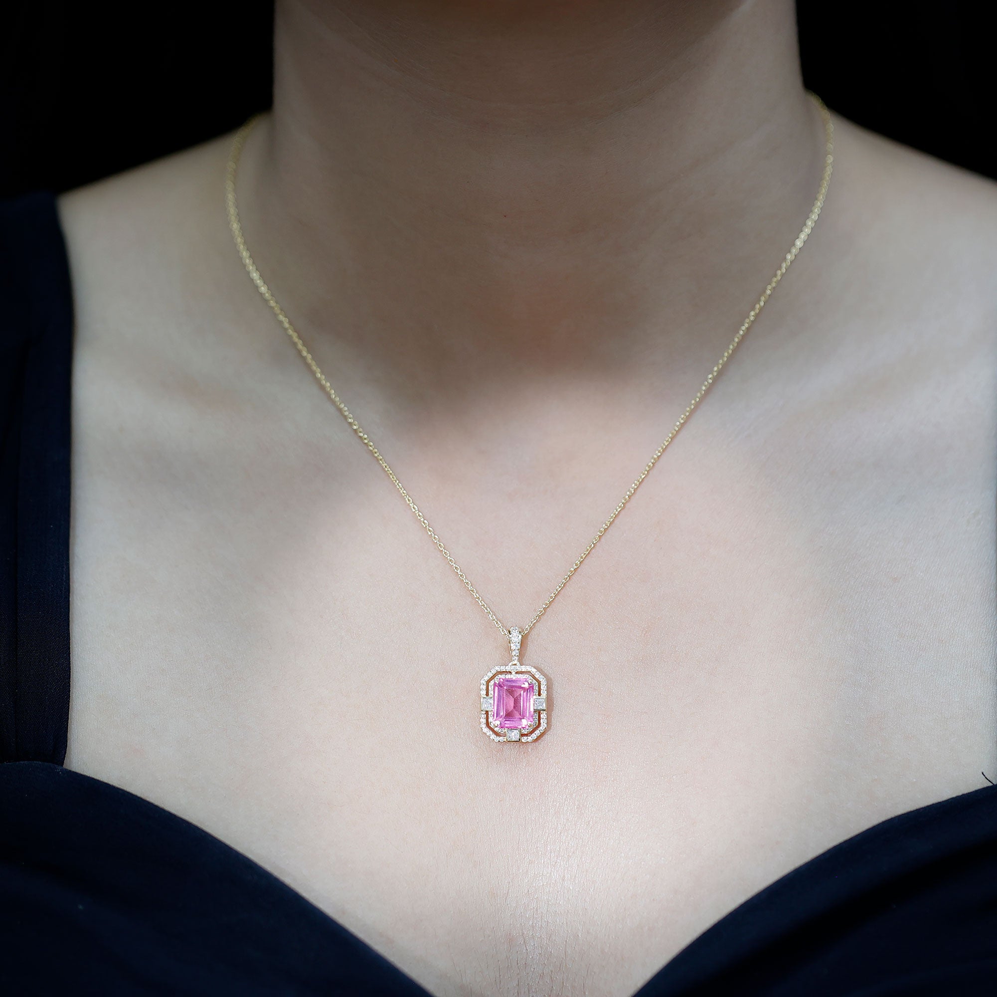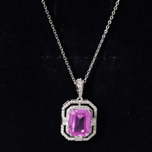 Experience the heightened allure of the captivating Vintage Halo Pendant, designed to beautifully accentuate your neckline. A mesmerizing Octagon Cut Created Pink Sapphire takes center stage, gracefully held in place by a secure Prong Setting. Adding to its enchanting appeal are the shimmering Round and Princess Cut Moissanite stones that evoke a timeless, vintage-inspired charm. Elevate your beauty and exude a sense of sophistication and elegance with this exquisite Pendant Necklace, the perfect accessory to complement any outfit.