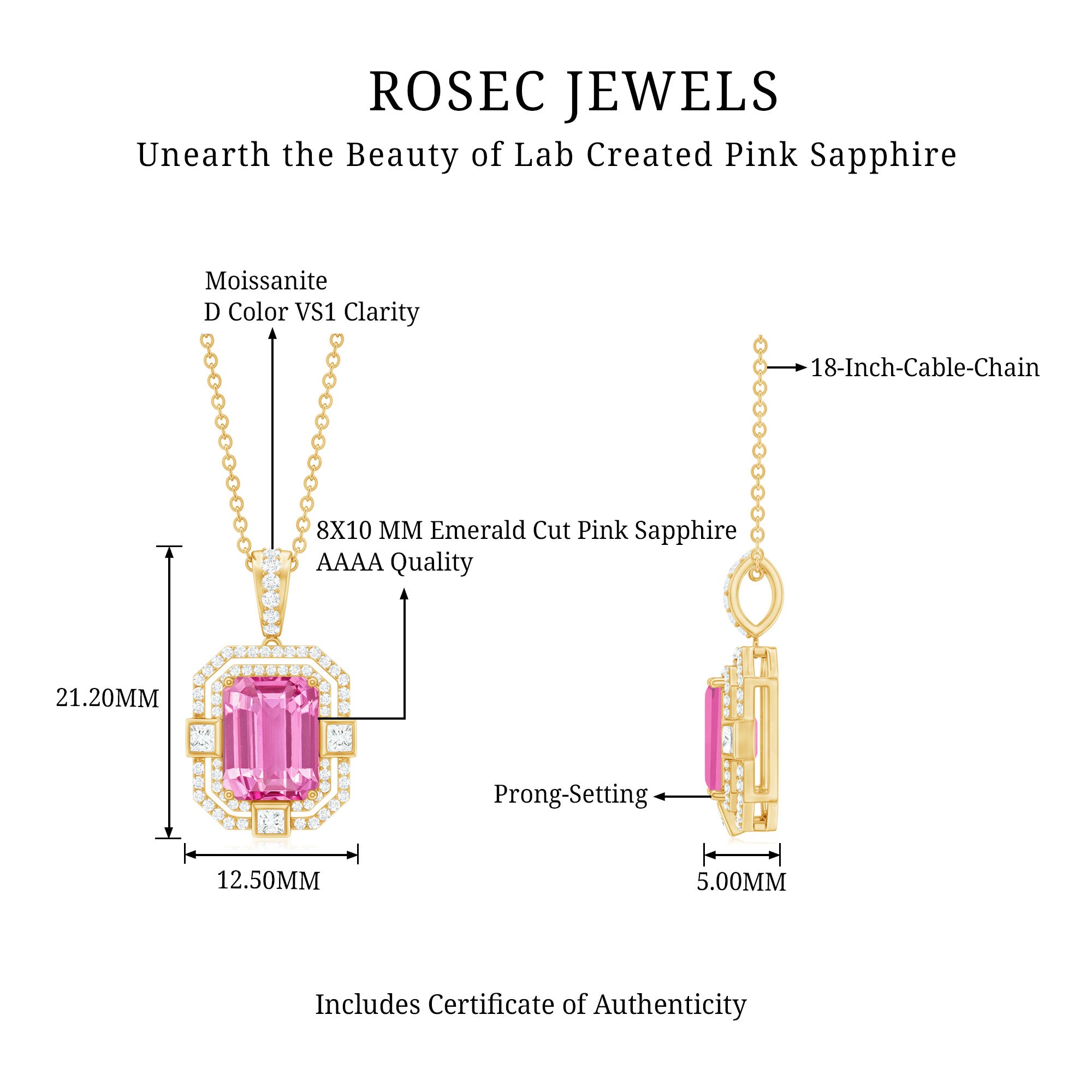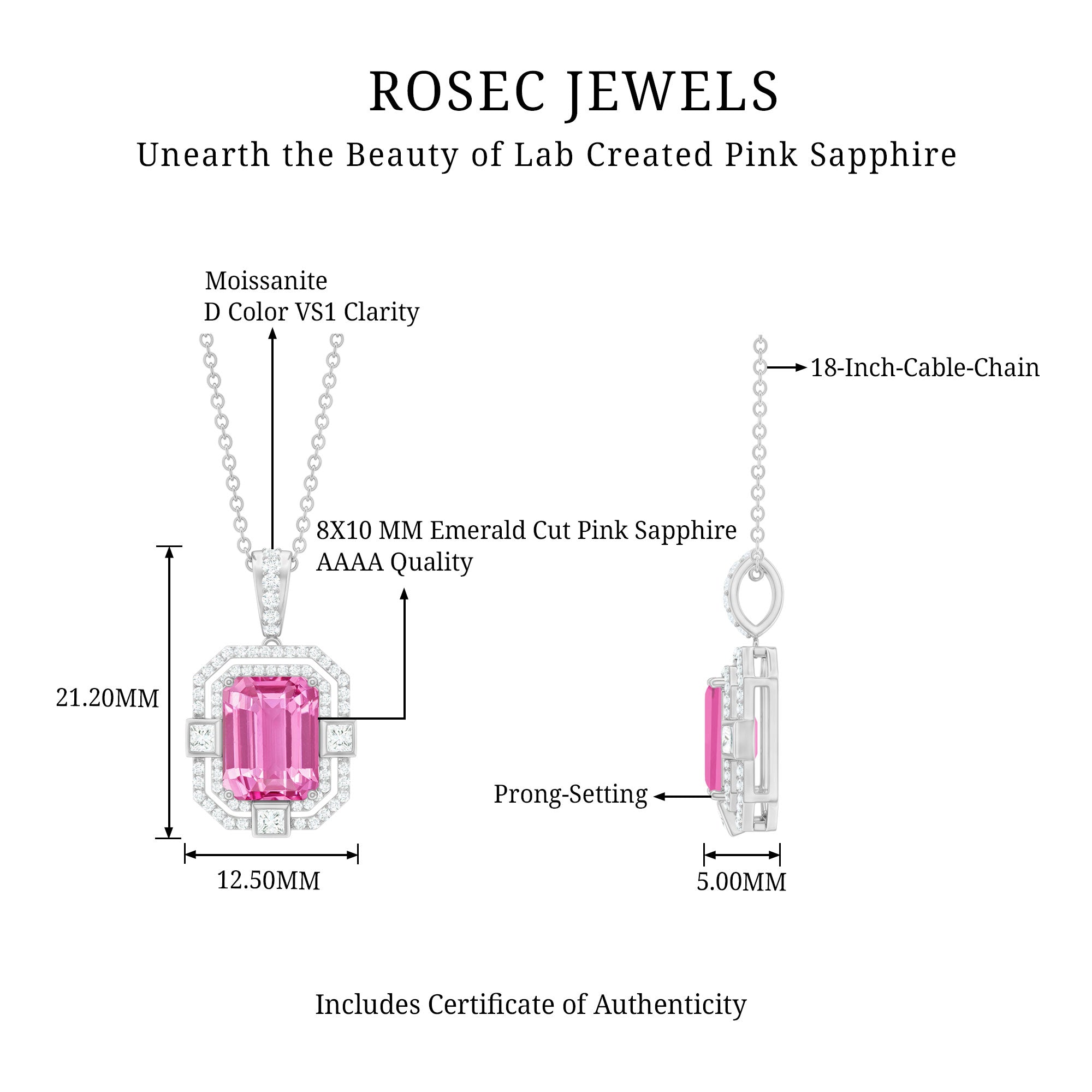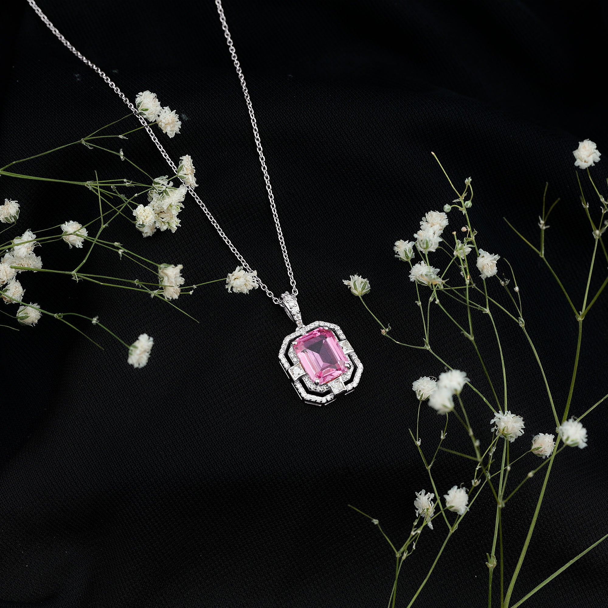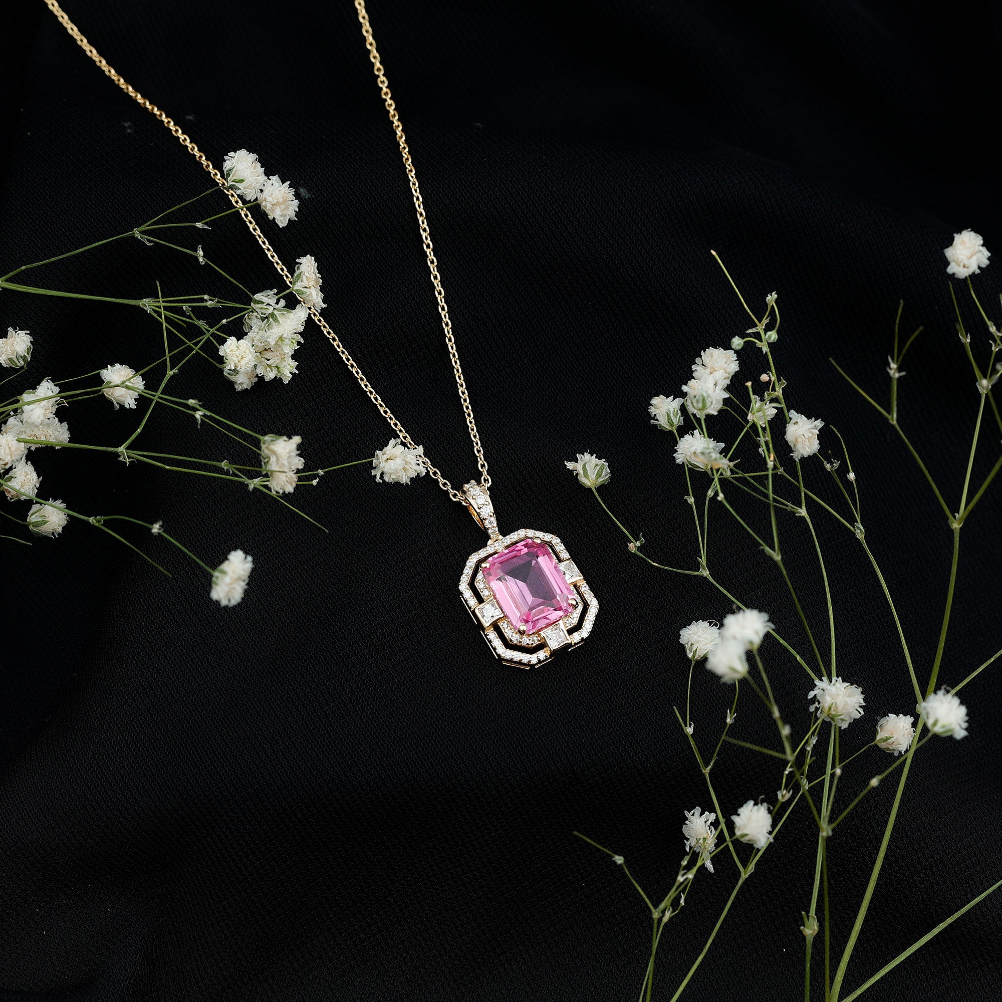 Experience the heightened allure of the captivating Vintage Halo Pendant, designed to beautifully accentuate your neckline. A mesmerizing Octagon Cut Created Pink Sapphire takes center stage, gracefully held in place by a secure Prong Setting. Adding to its enchanting appeal are the shimmering Round and Princess Cut Moissanite stones that evoke a timeless, vintage-inspired charm. Elevate your beauty and exude a sense of sophistication and elegance with this exquisite Pendant Necklace, the perfect accessory to complement any outfit.