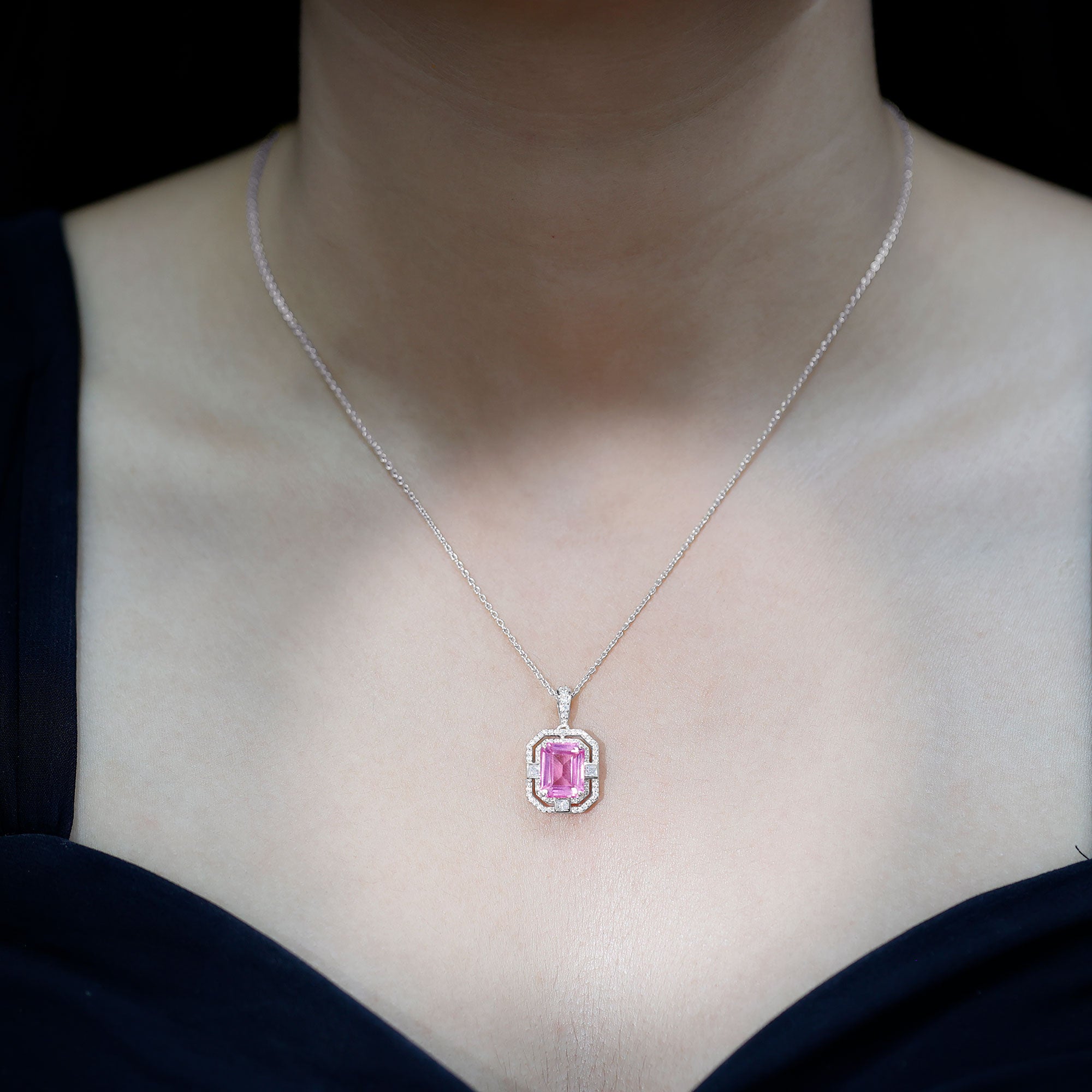 Vintage Emerald Cut Created Pink Sapphire Pendant with Moissanite