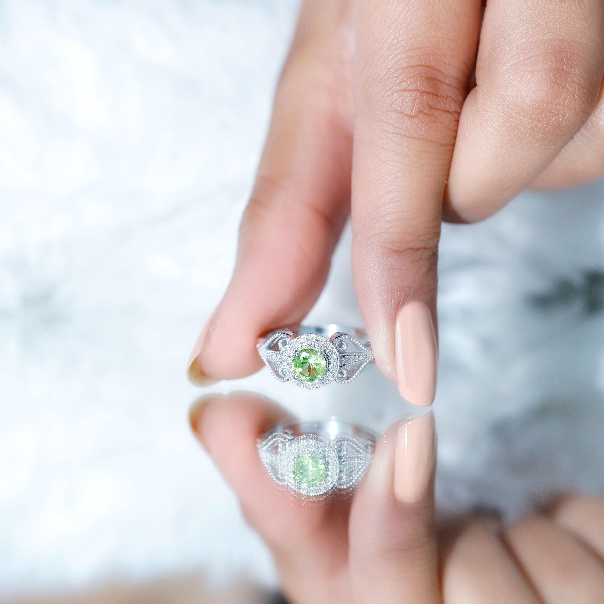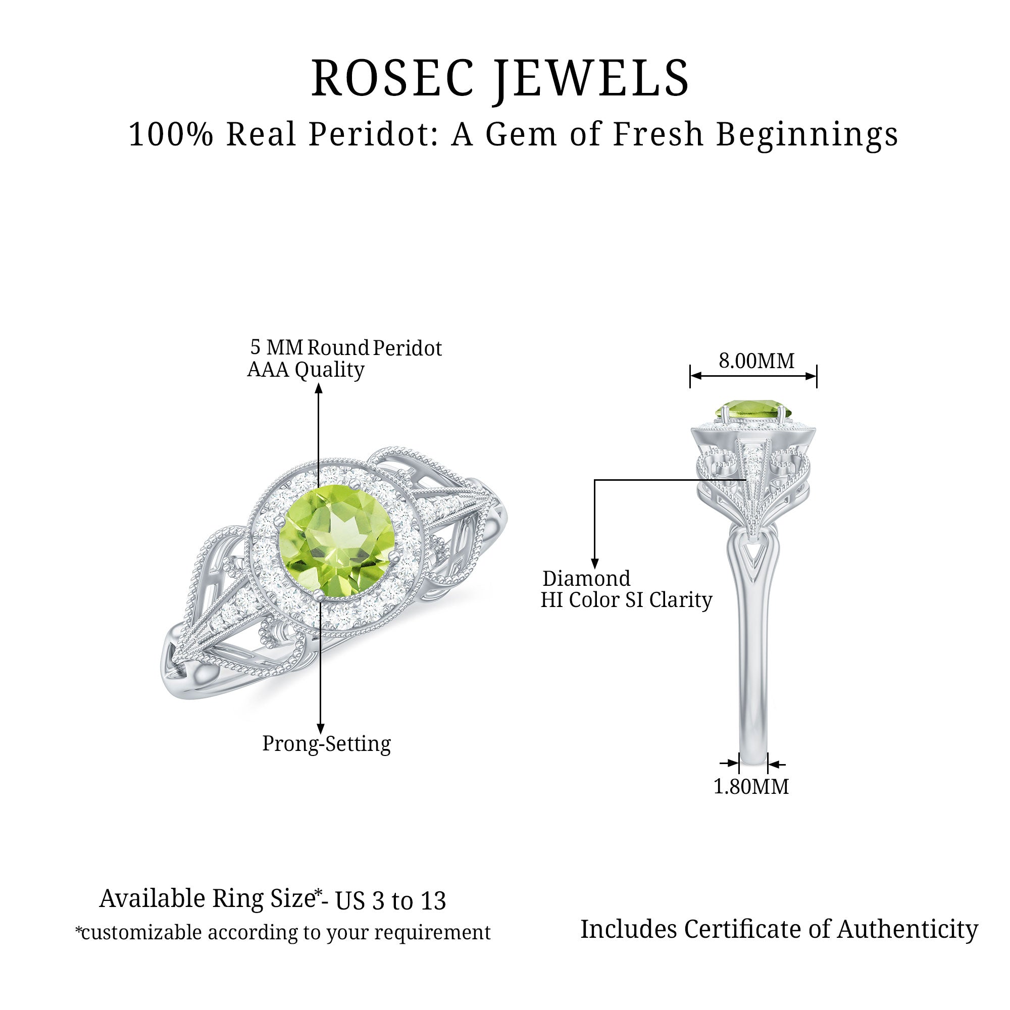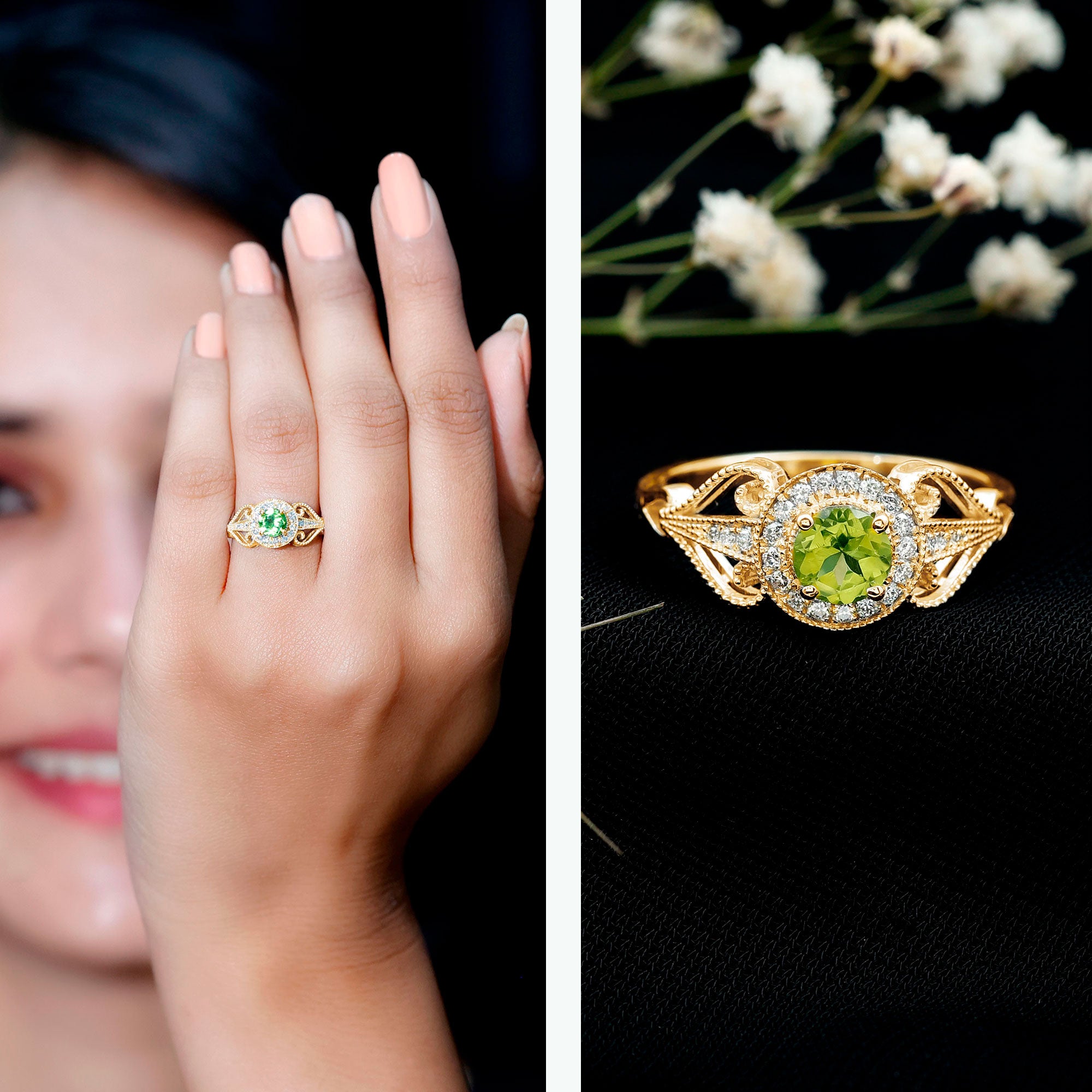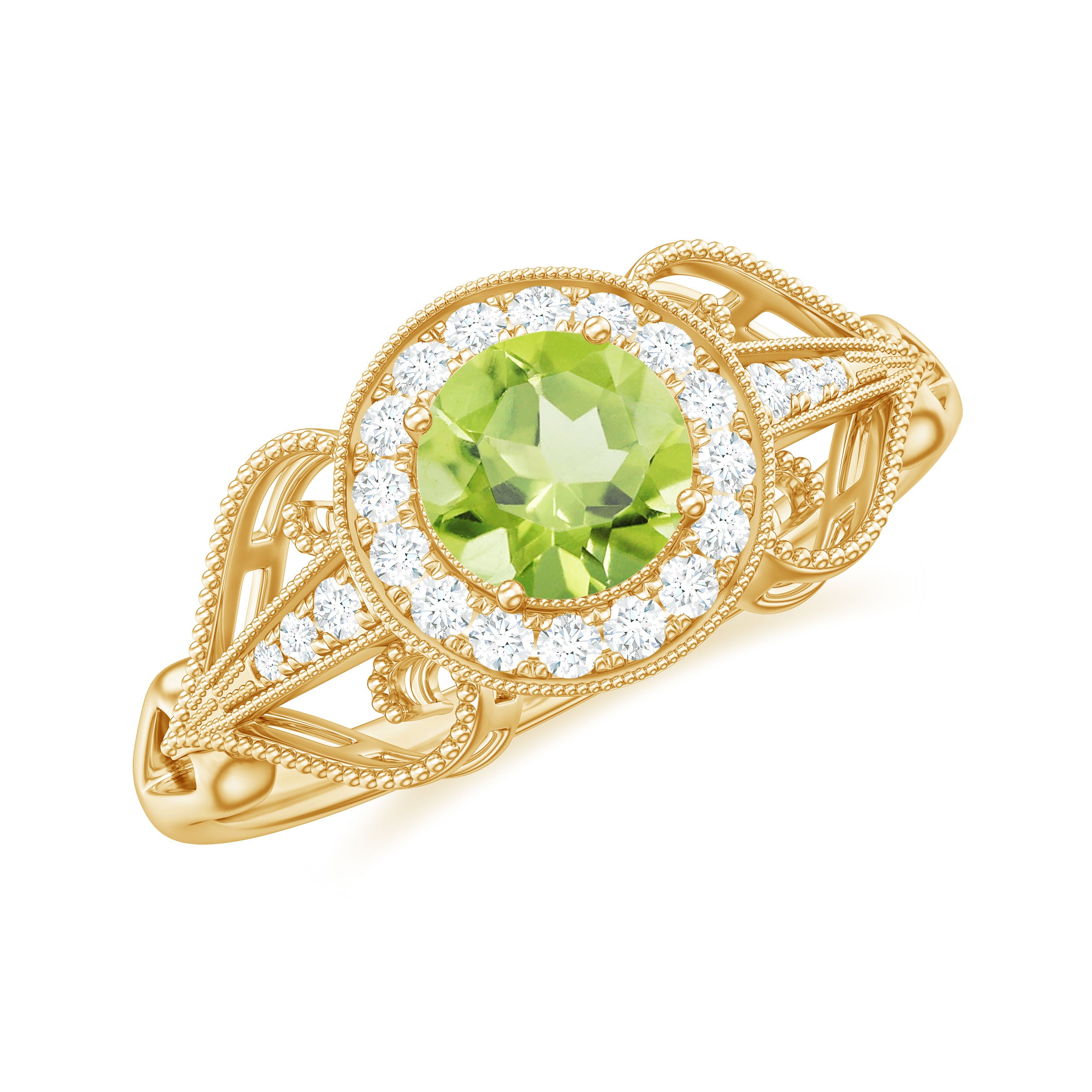 Timeless yet effortlessly romantic, this Vintage Looking Engagement Ring captures the elegance of a love that endures across generations. At its center lies a 5 mm Round Shape Peridot set in Prong Setting, glowing with a fresh green brilliance that symbolizes growth, harmony and the promise of a shared future. Surrounding the center stone, a Halo of sparkling Diamond stones adds a radiant frame, amplifying the natural beauty of AAA Quality Peridot and creating a captivating shimmer from every angle. The band, adorned with delicate Diamond stones and intricate Beaded detailing, reflects vintage charm and craftsmanship, giving the ring an air of old-world sophistication while remaining perfectly modern in style. Available in a variety of ring sizes, this Peridot Engagement Ring can be tailored to celebrate your personal story. Presented in a signature jewelry box, this Halo Engagement Ring with Peridot arrives ready to mark a milestone that deserves to be remembered forever. Whether chosen for an engagement or a cherished gift, this Peridot Diamond Ring tells a tale of devotion, elegance and a romance that shines brilliantly through every moment shared together.