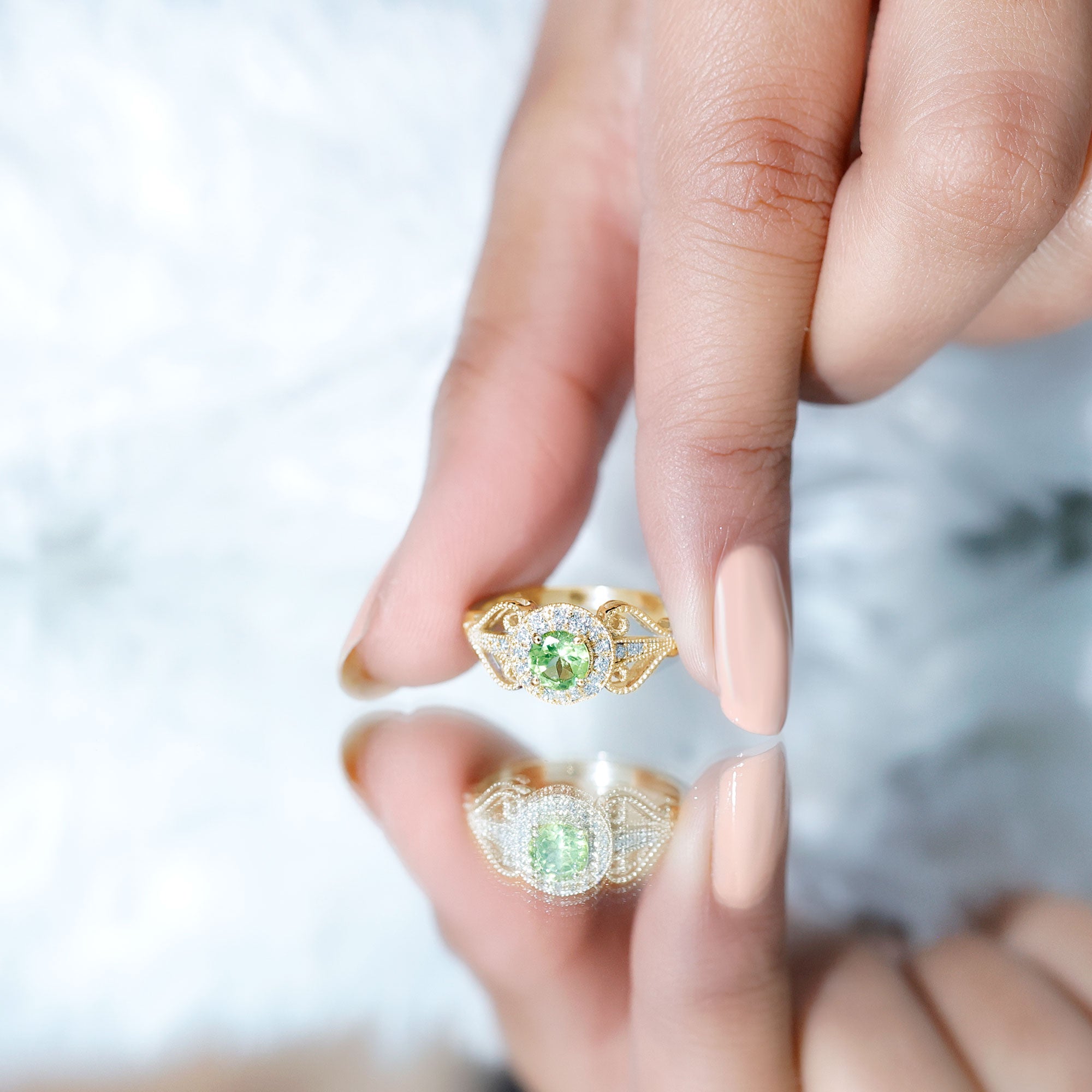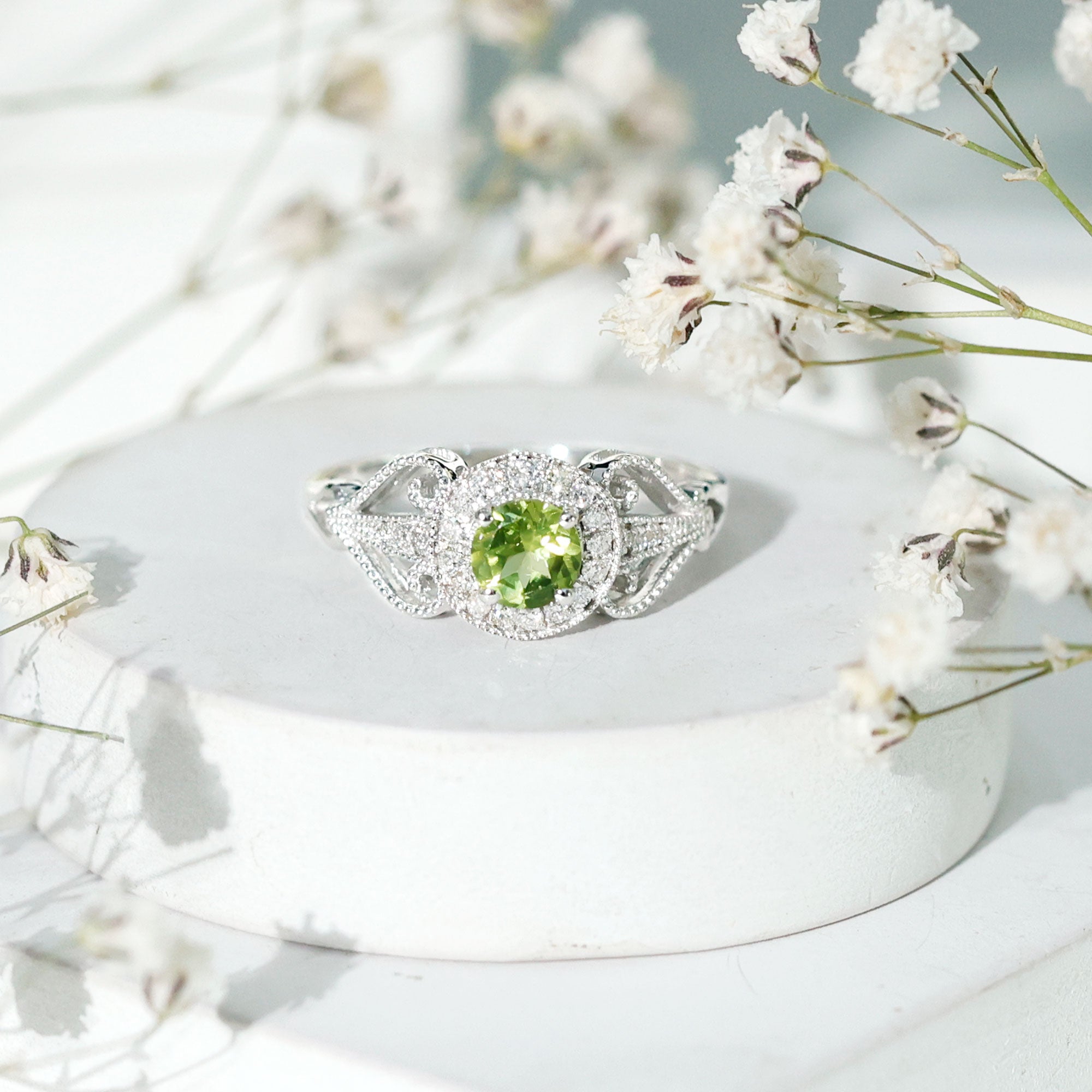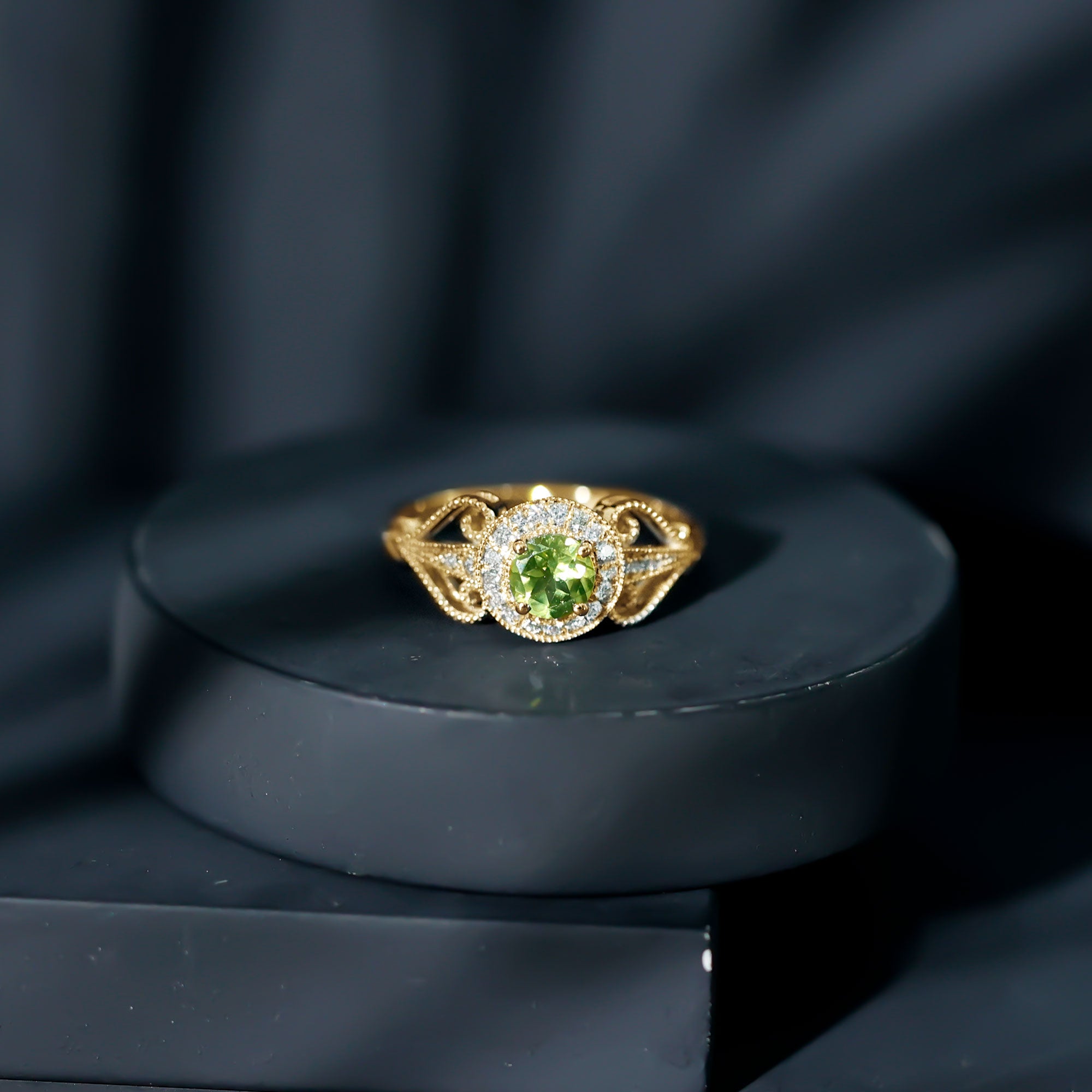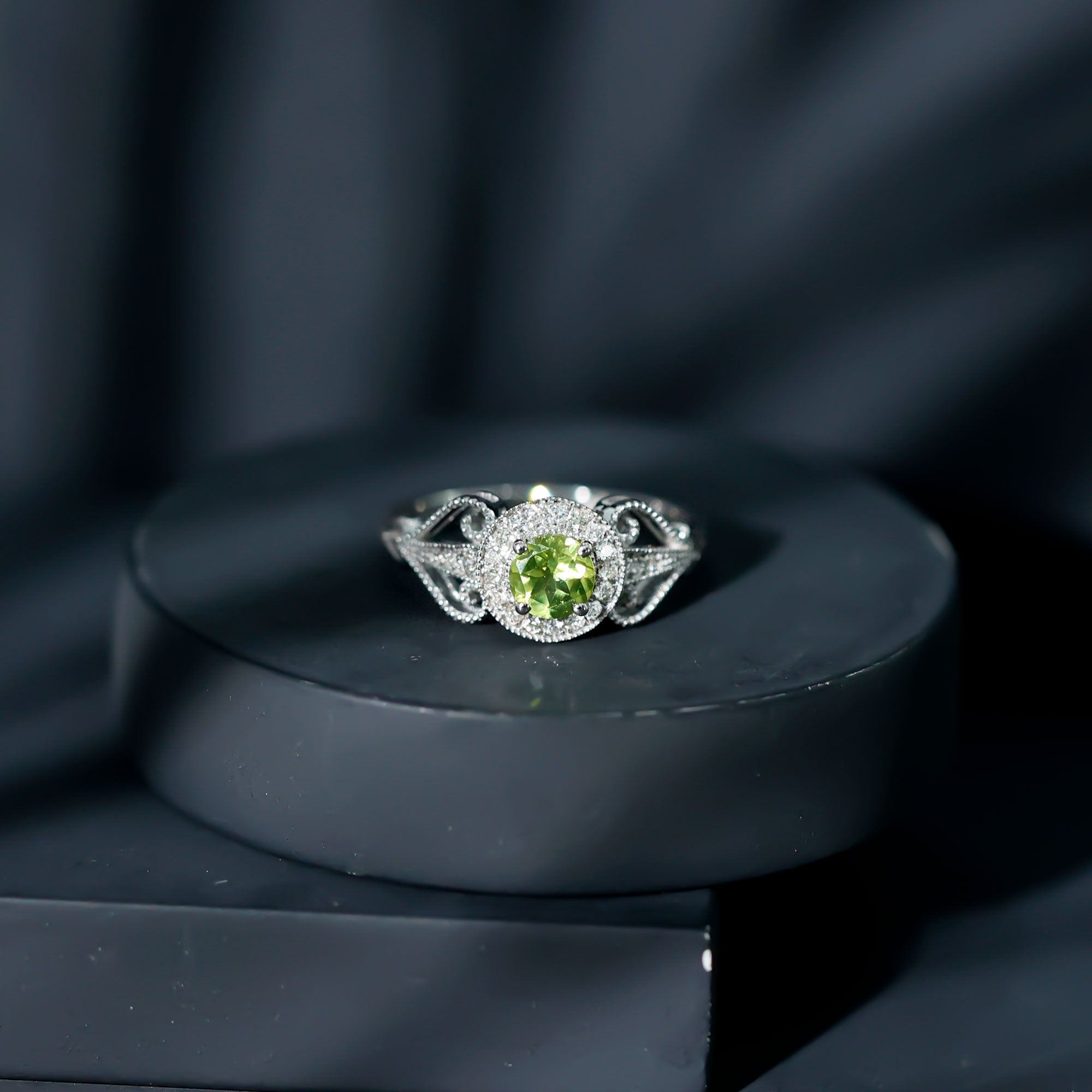 Vintage Inspired 0.5 Carat Peridot Engagement Ring with Diamond Halo