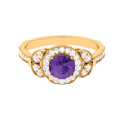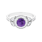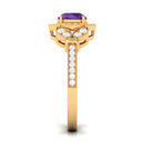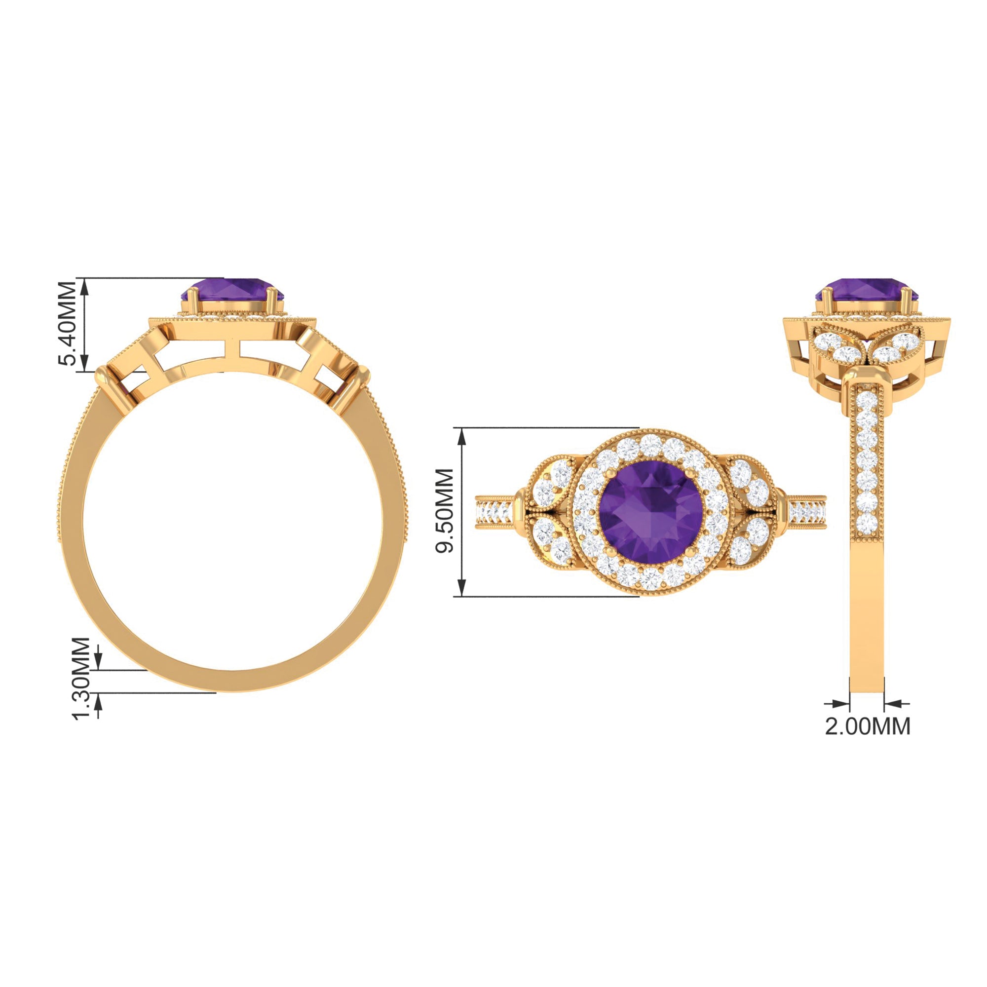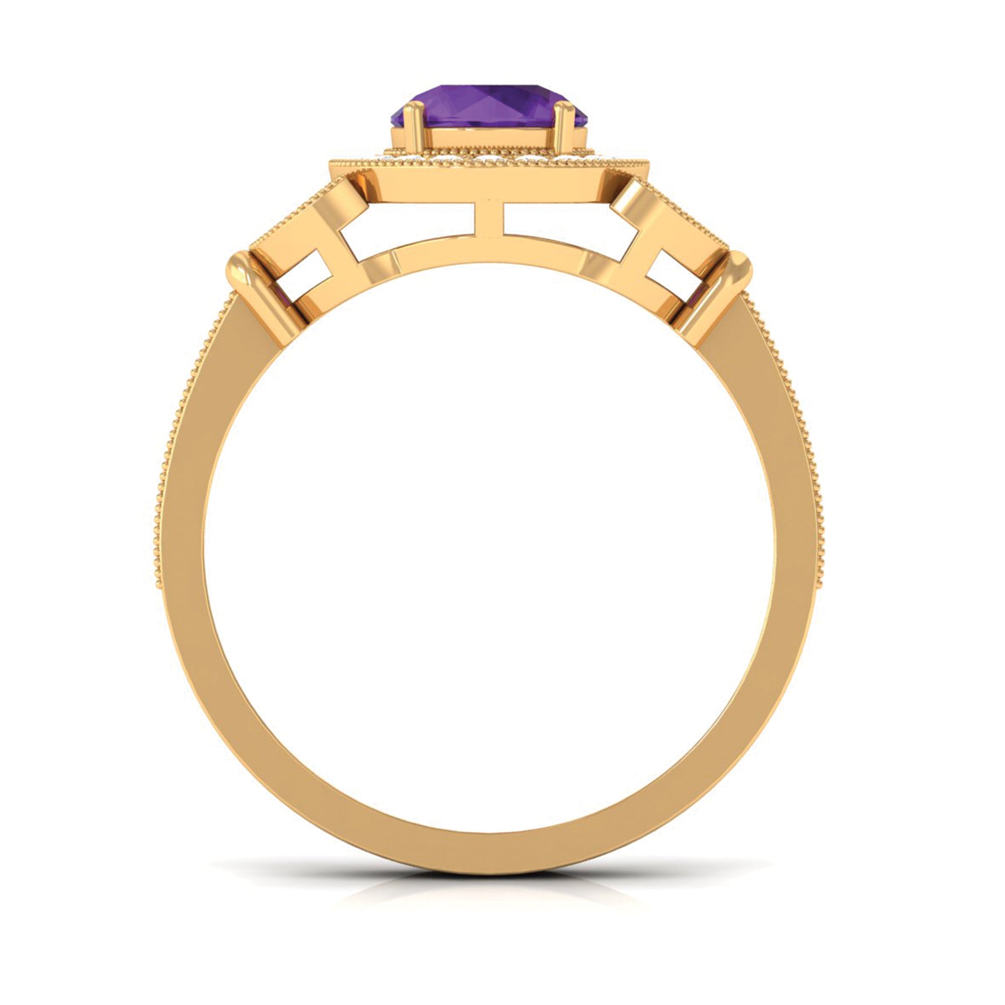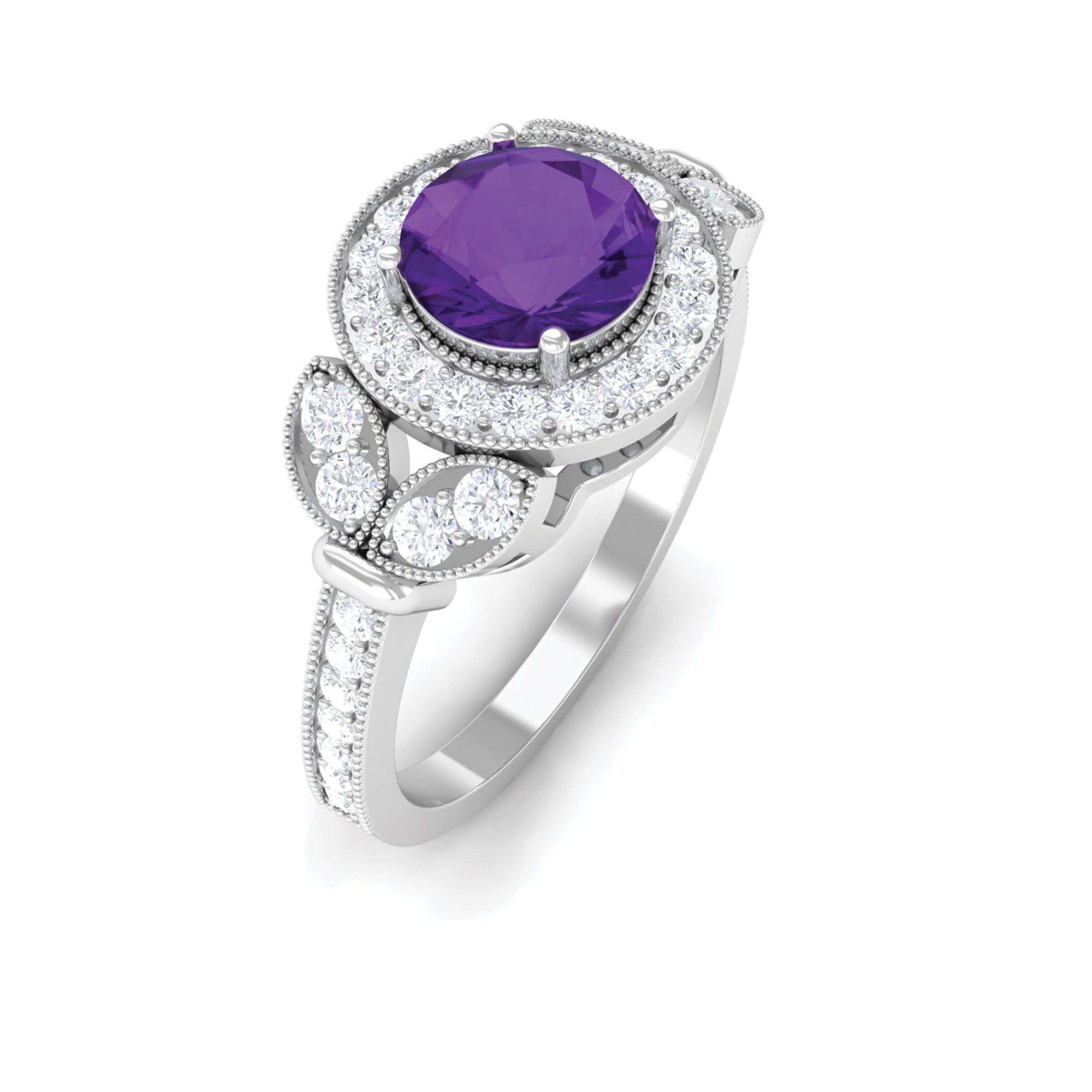 The fire and brilliance of Amethyst Engagement Ring will forever shines through in every way, Our Vintage Engagement Ring gives you extra ordinary feel on your big day. This Amethyst Vintage Engagement Ring is embellished with Round Cut Amethyst in Prong Setting with Moissanite Accent and Gold Beaded Details.