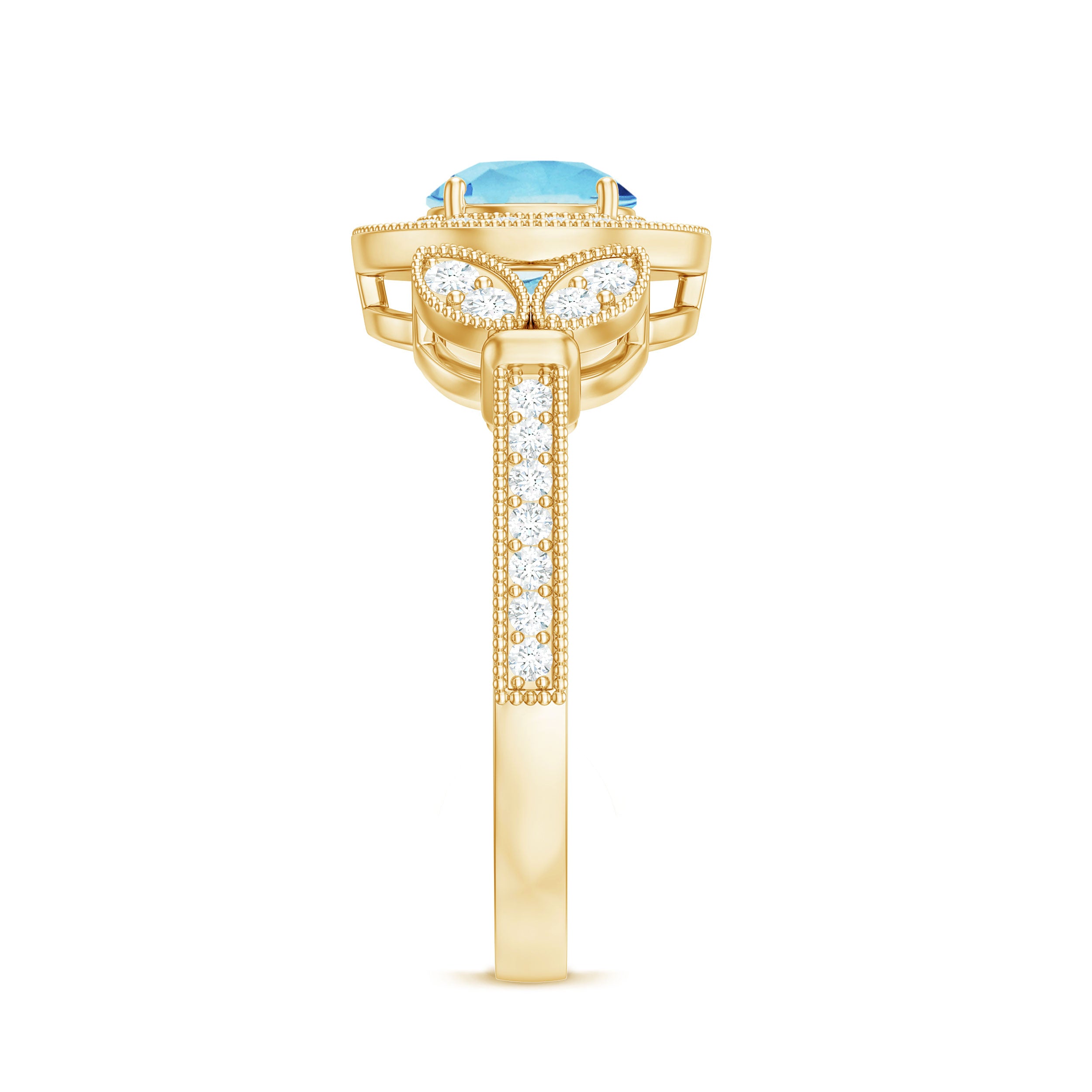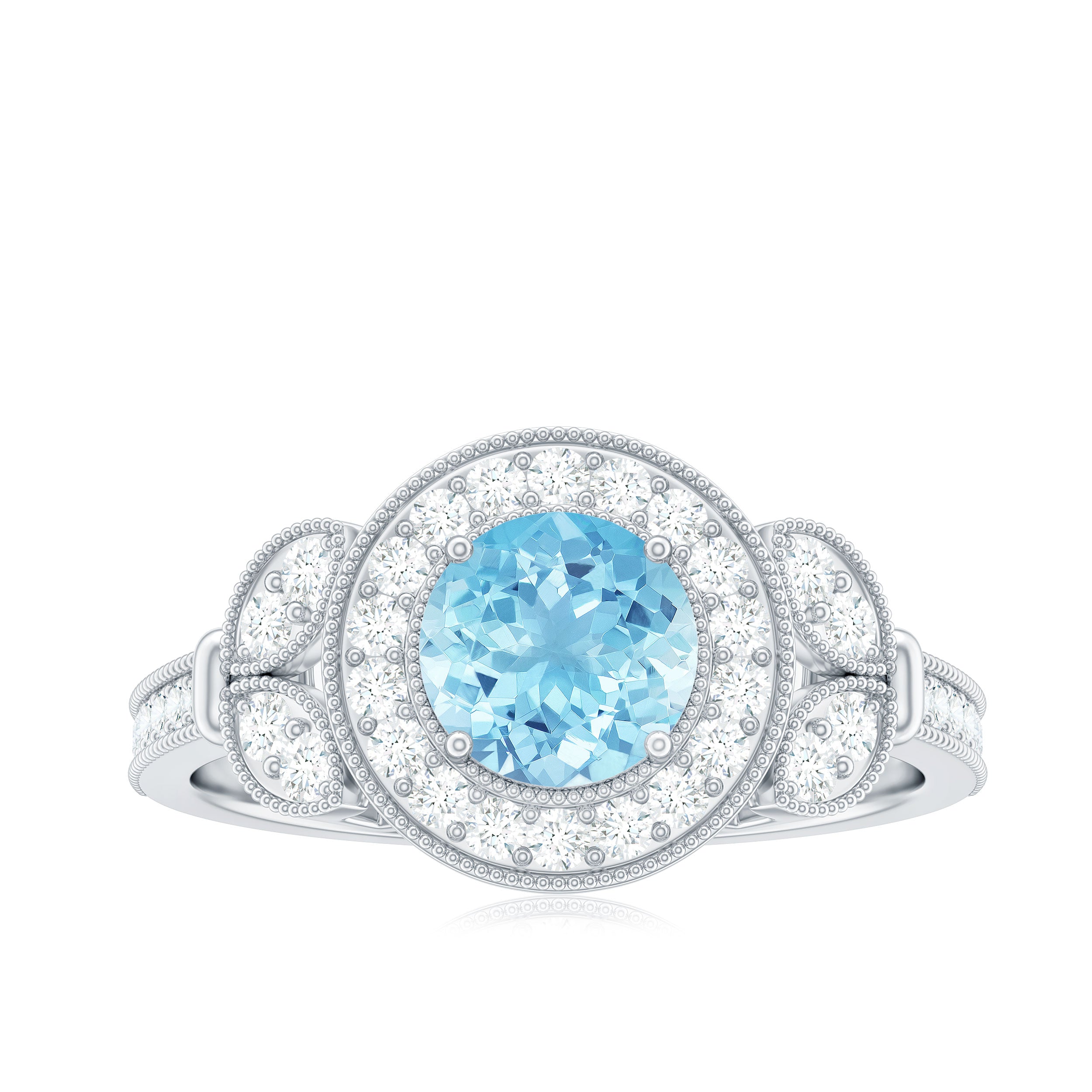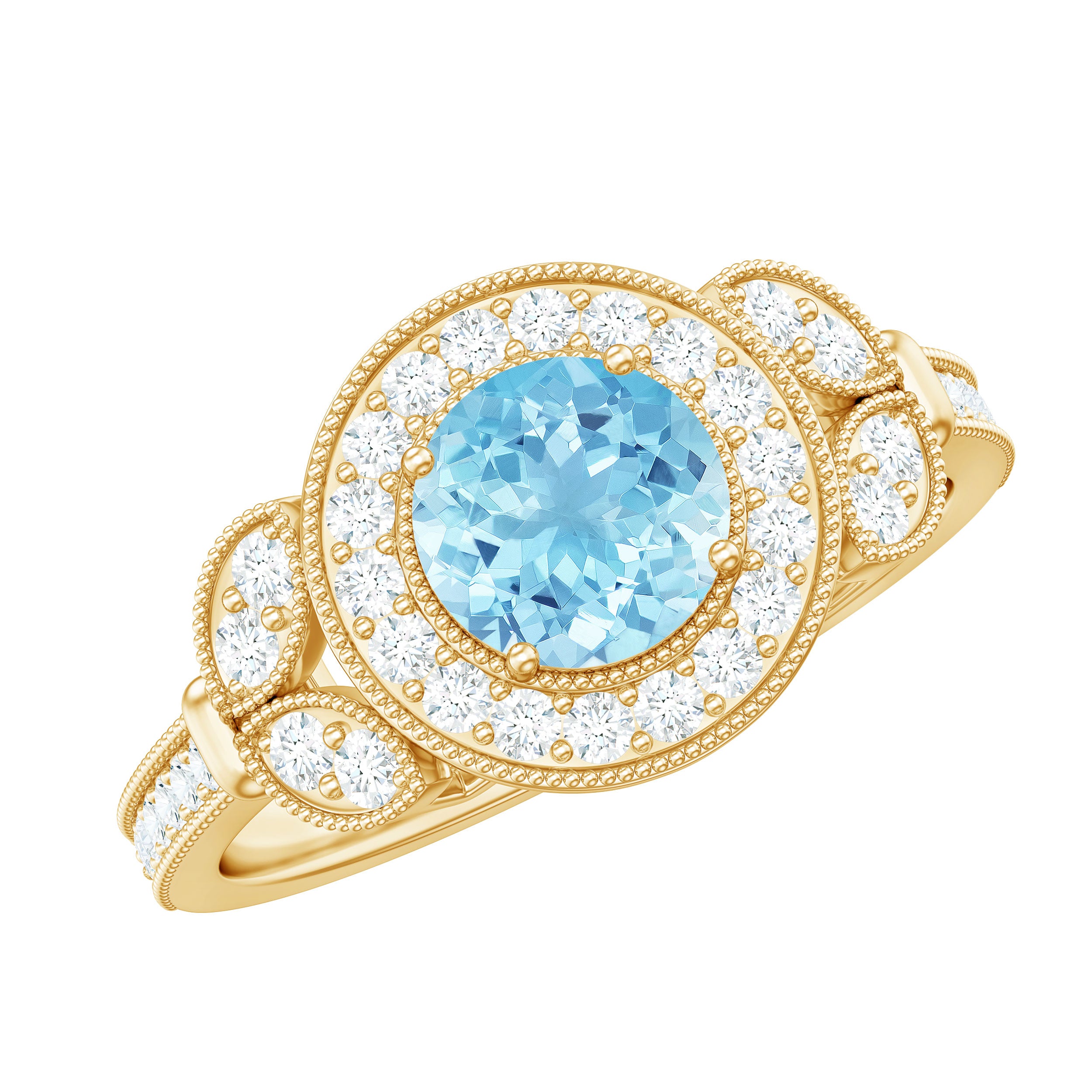 The fire and brilliance of Aquamarine Engagement Ring will forever shines through in every way, Our Vintage Engagement Ring gives you extra ordinary feel on your big day. This Aquamarine Vintage Ring is embellished with Round Shape Aquamarine in Prong Setting with Diamond Accent and Gold Beaded Details.