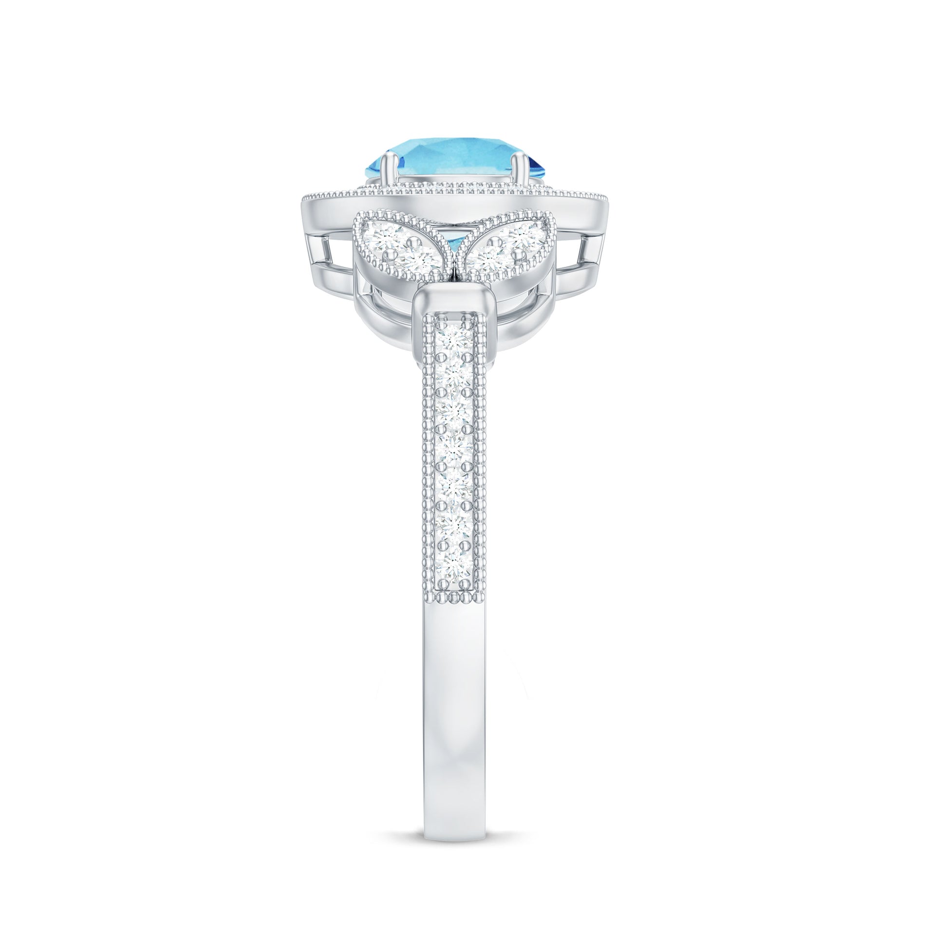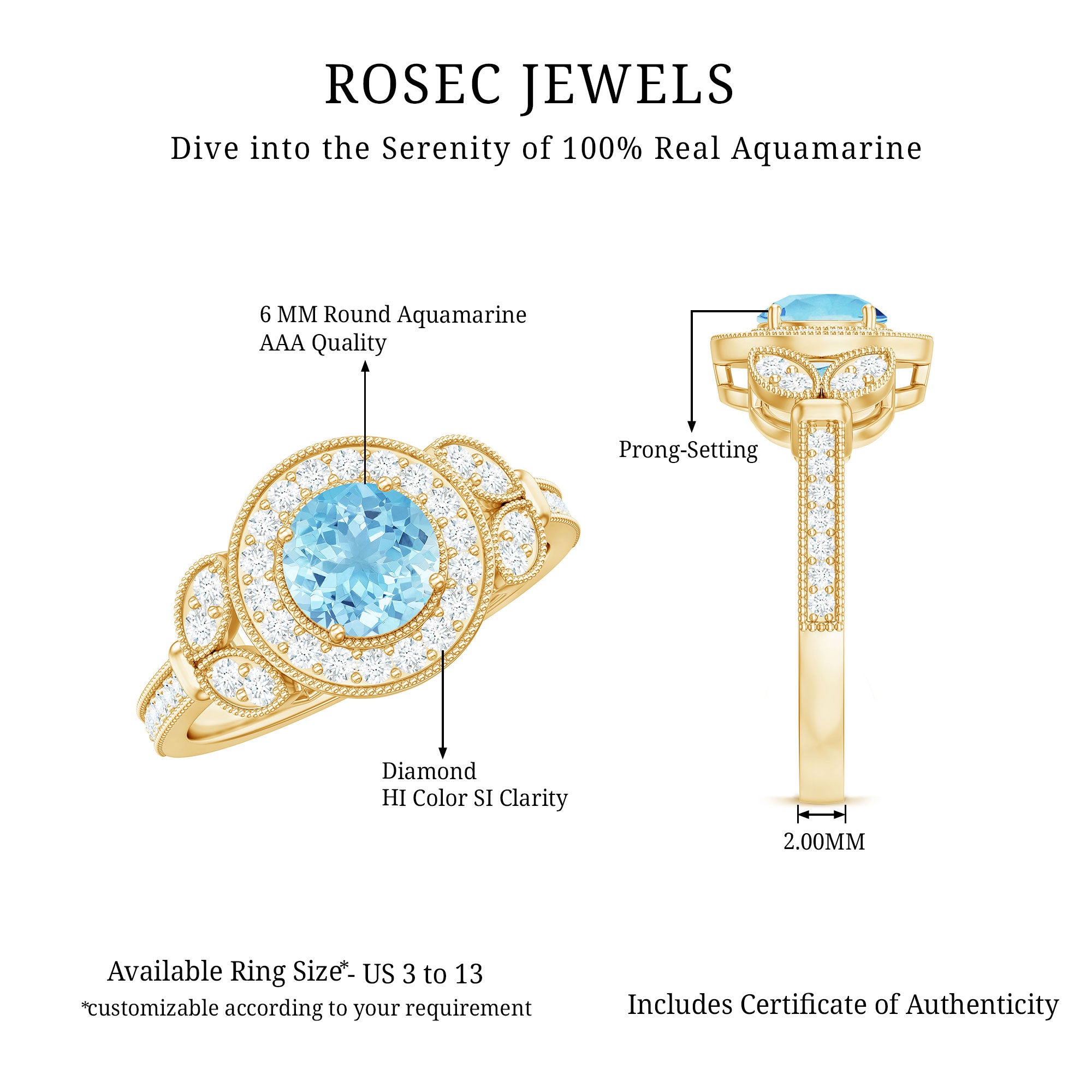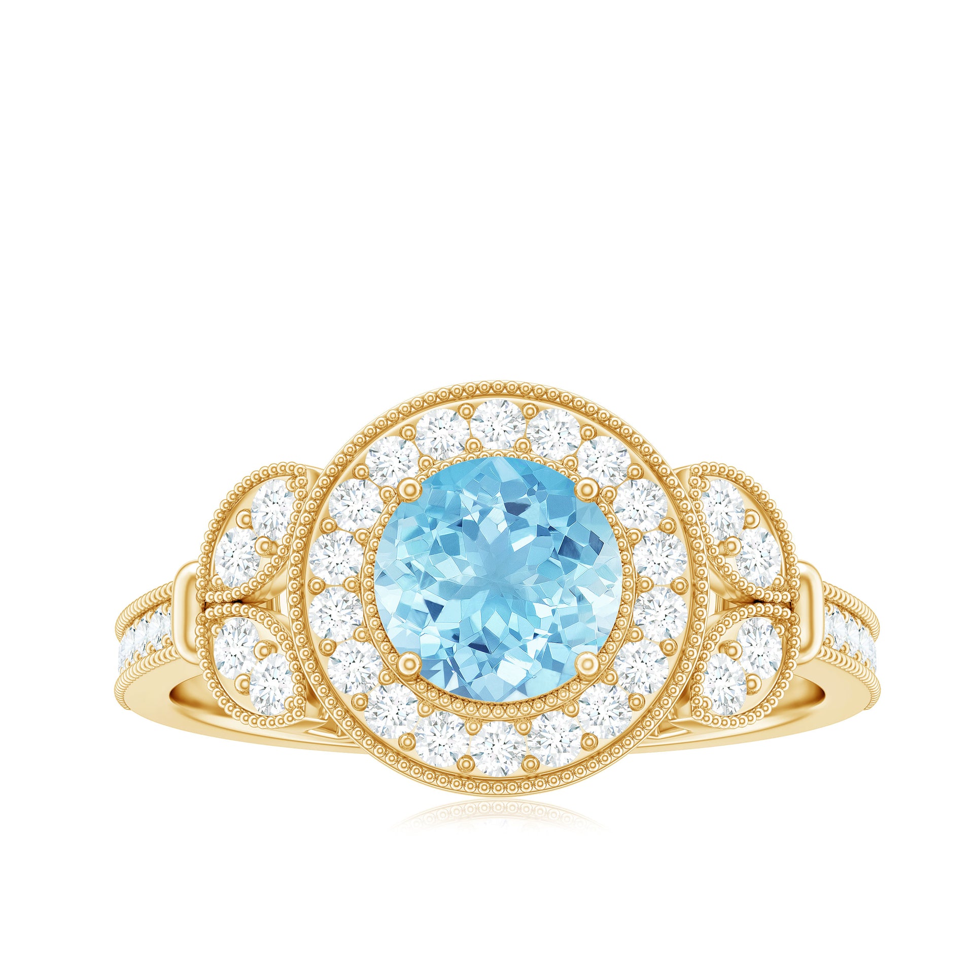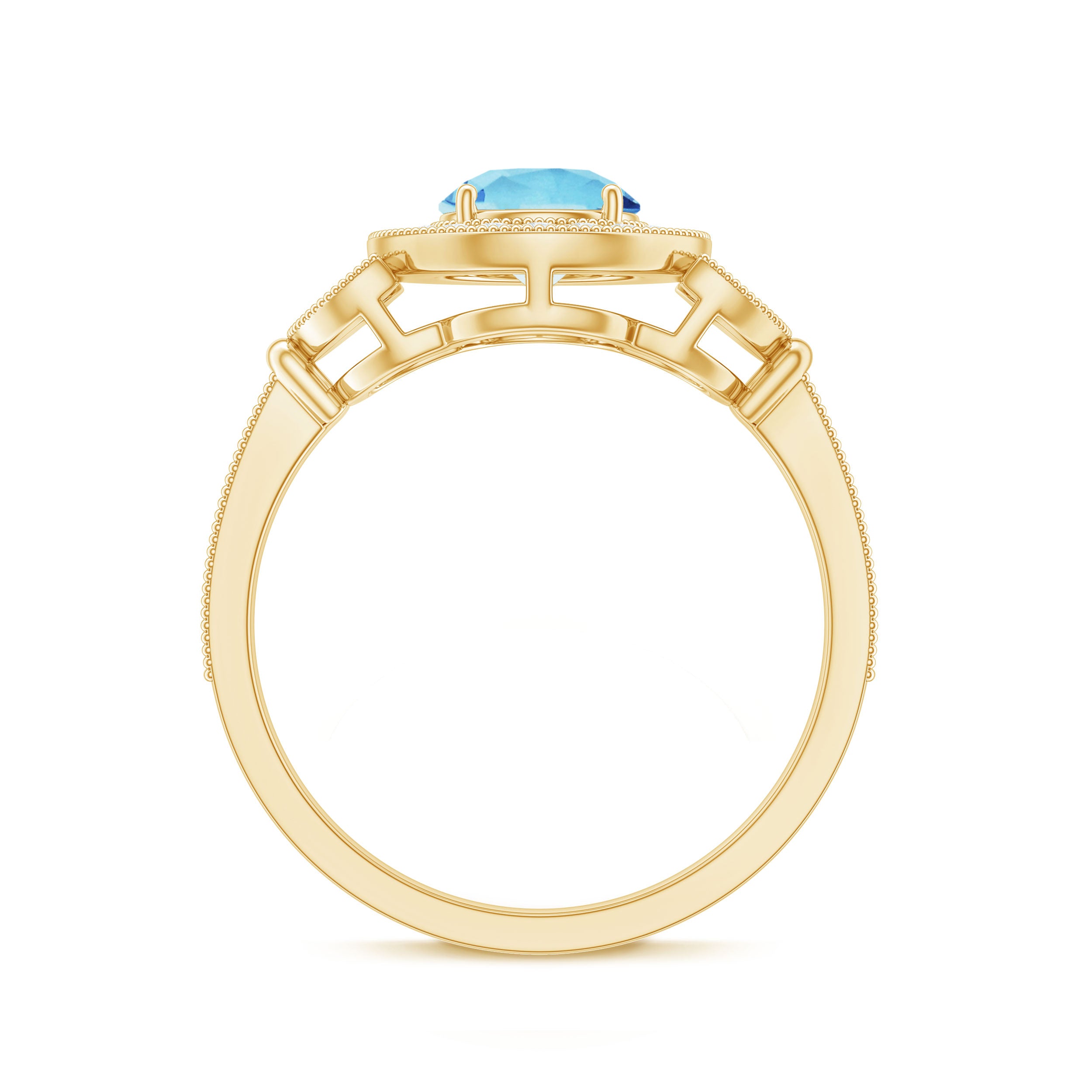 The fire and brilliance of Aquamarine Engagement Ring will forever shines through in every way, Our Vintage Engagement Ring gives you extra ordinary feel on your big day. This Aquamarine Vintage Ring is embellished with Round Shape Aquamarine in Prong Setting with Diamond Accent and Gold Beaded Details.