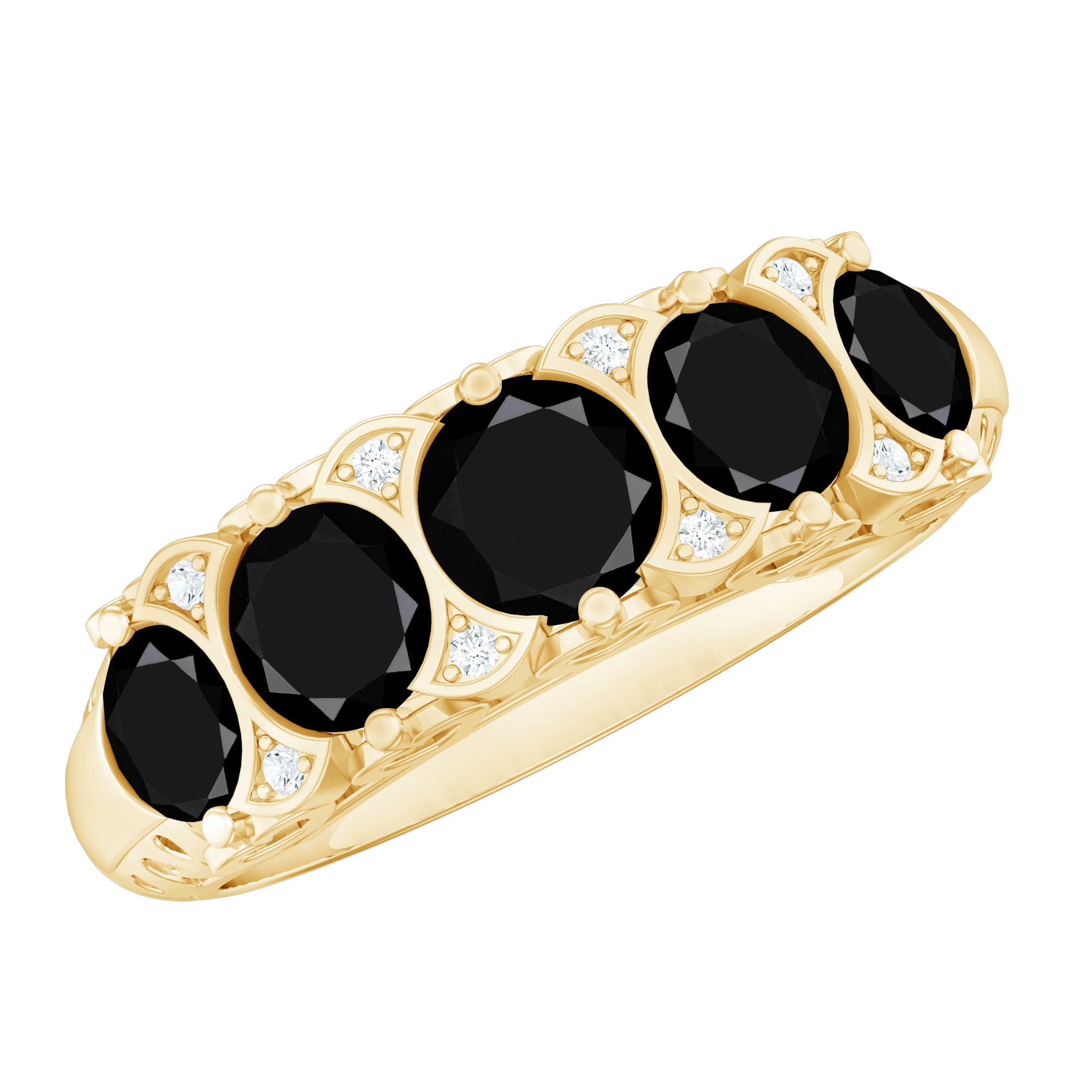 The five-stone layout creates a strong visual rhythm across the band, while vintage-inspired detailing adds depth and character to the setting. Each element is intentionally placed to create continuity, symmetry, and lasting visual appeal.