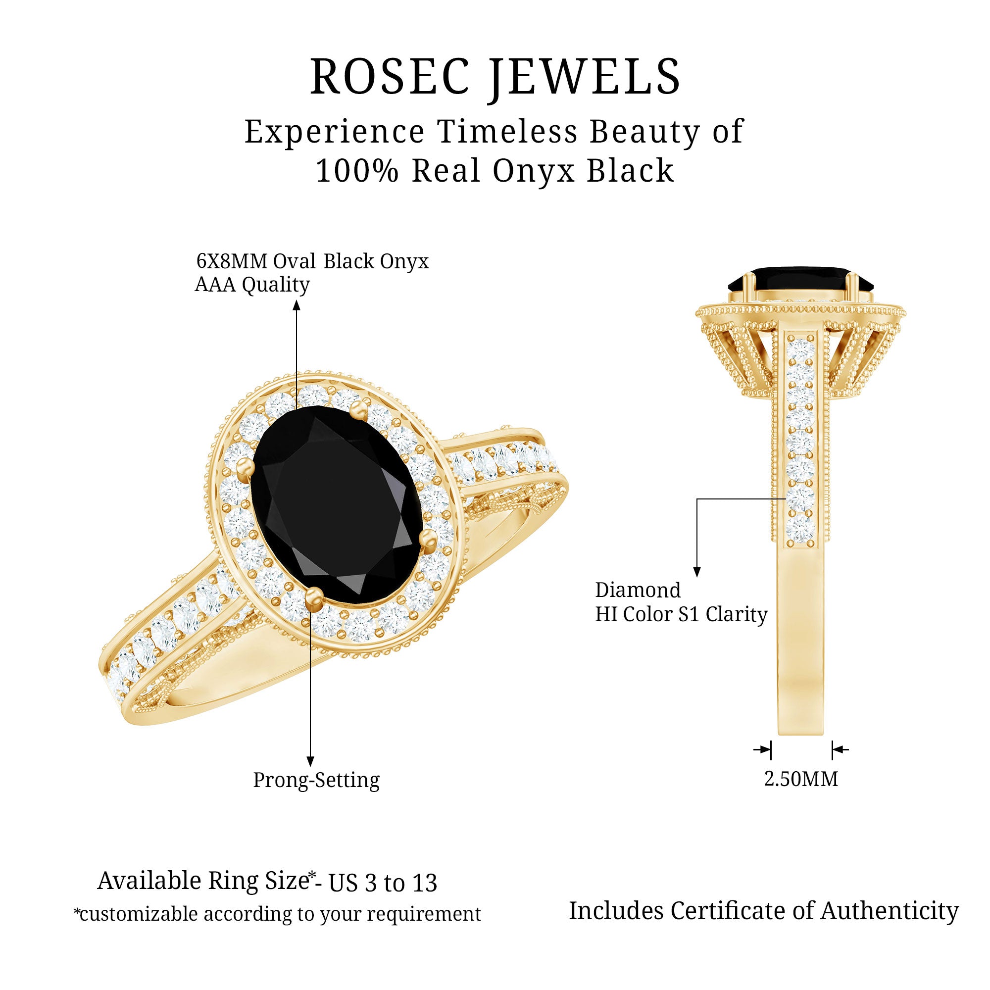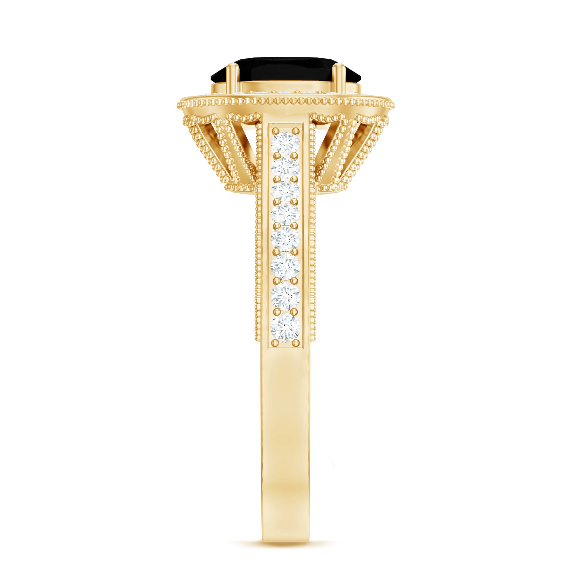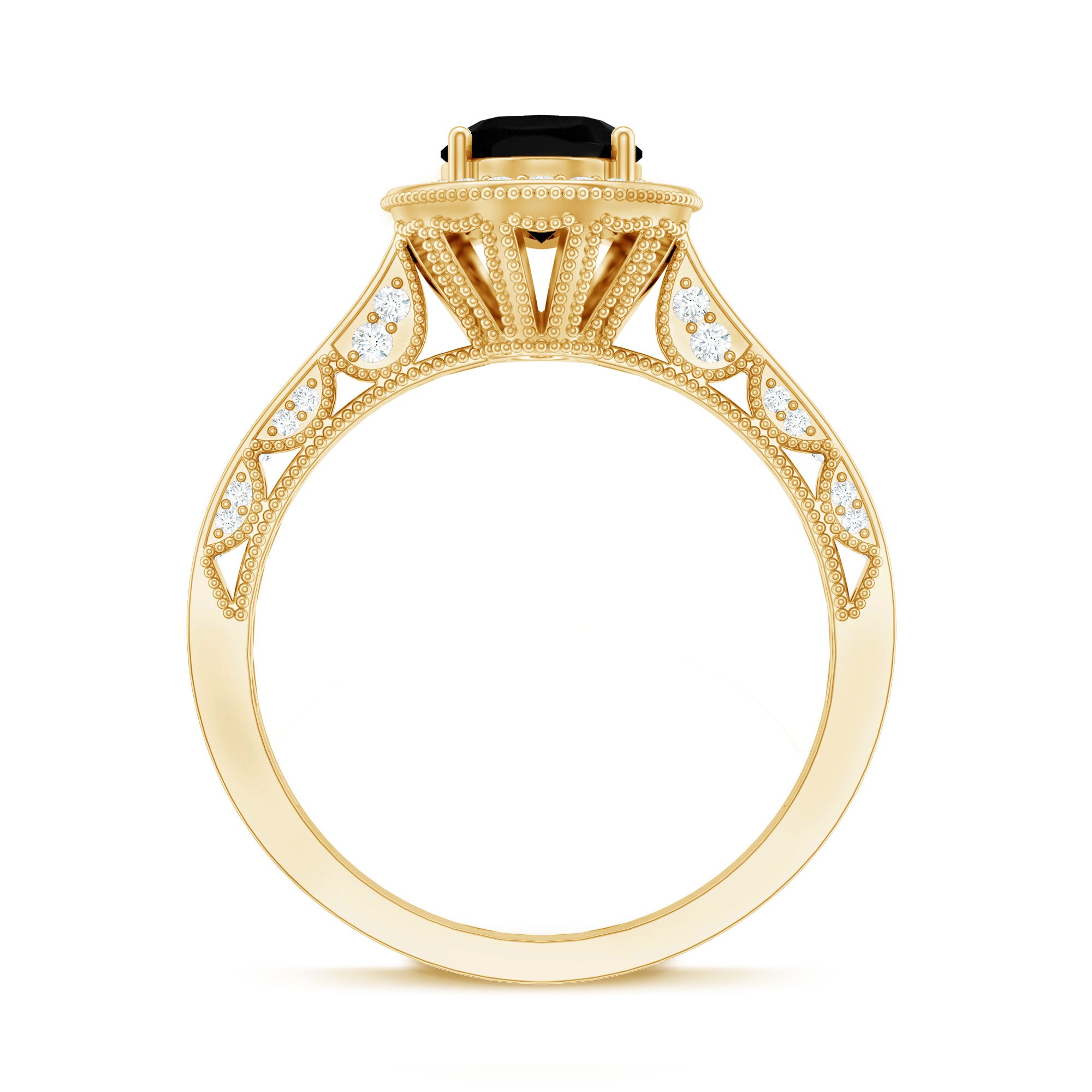 If you love vintage beauty with a modern touch, this Antique Black Onyx Ring was made for you. This Black Onyx Engagement Ring is inspired by old-world charm and timeless elegance. At the center sits a 6X8 MM oval cut black onyx, held securely in prong setting. Its deep tone makes a bold statement, while the sparkling round cut diamond halo around it adds a soft and glowing contrast. The band features delicate side diamonds, detailed beaded edges, and fine craftsmanship that reflects a true vintage feel. Every detail in this Oval Engagement Ring is designed to bring the beauty of the past into a meaningful piece for your future. This Vintage Halo Engagement Ring is perfect for brides who want something a little different, something romantic, elegant, and full of story. The Art Deco style brings in just the right mix of drama and grace, making it a piece you will treasure for years to come. Made with AAA quality black onyx and HI-SI quality diamonds, this Antique Looking Engagement Ring also comes in various choices of metal color, ring size, and purity, so you can personalize it just the way you like. Whether it is for an engagement or a special gift, this Black Onyx and Diamond Ring stands out with timeless sparkle and meaningful design, a perfect way to say YES with style.