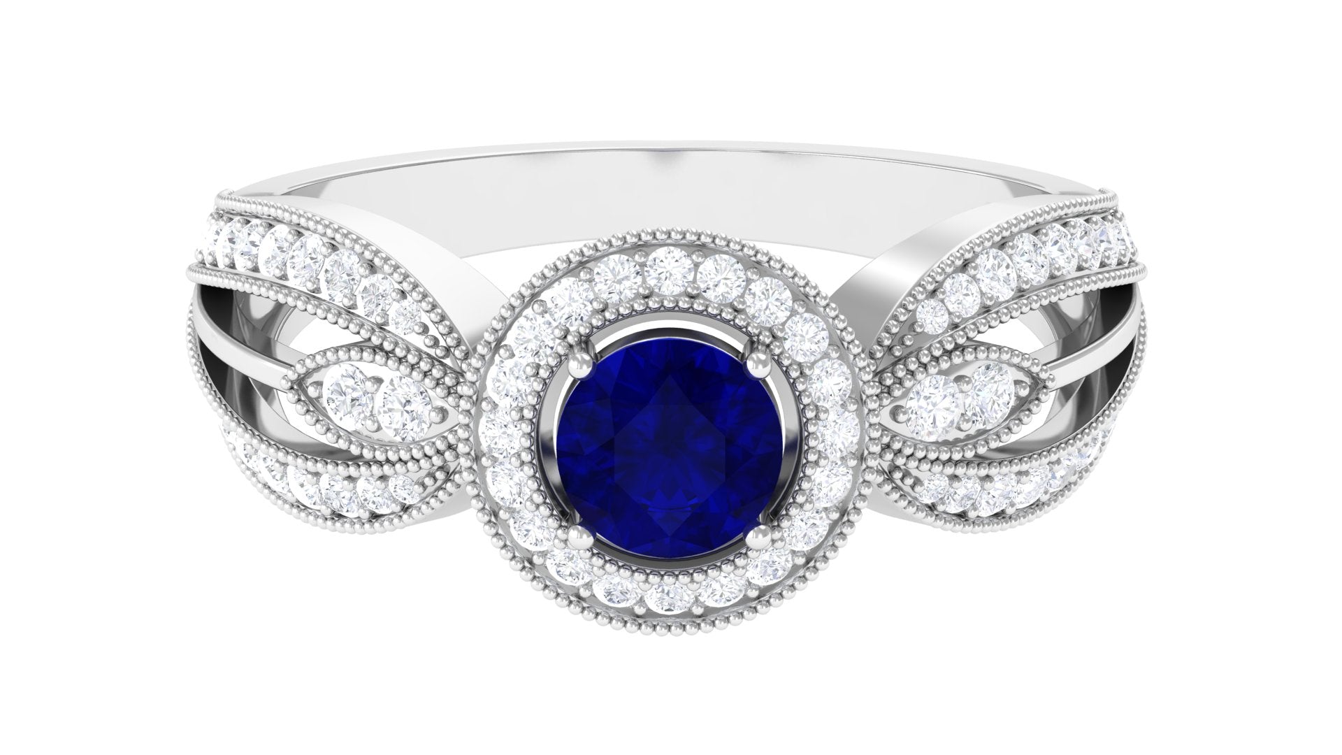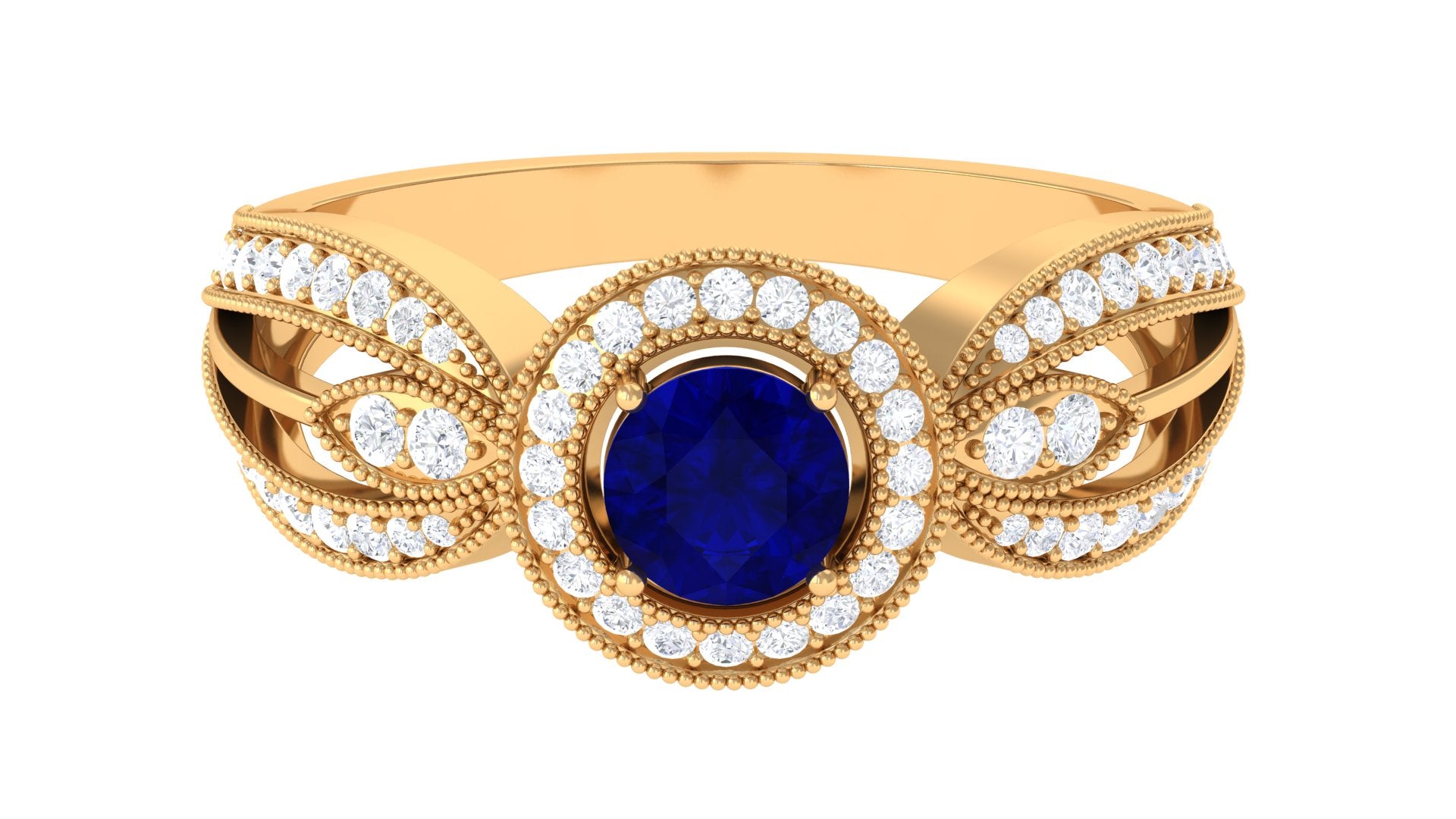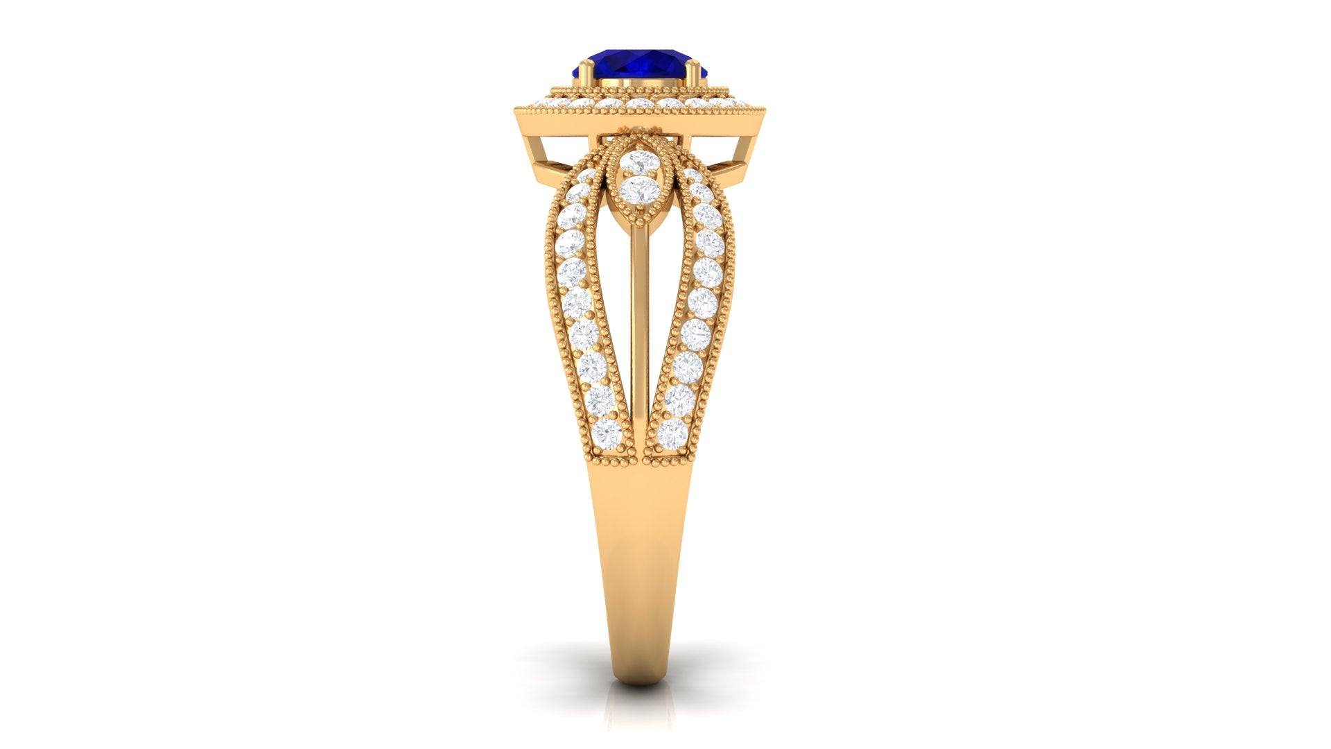 Indulge in the vintage charm of this engagement ring, featuring a captivating blue sapphire center stone on a split shank, elegantly complemented by shimmering Diamond stones and delicate beaded detailing. This intricately designed ring is perfect for brides-to-be who adore timeless and elegant jewelry.