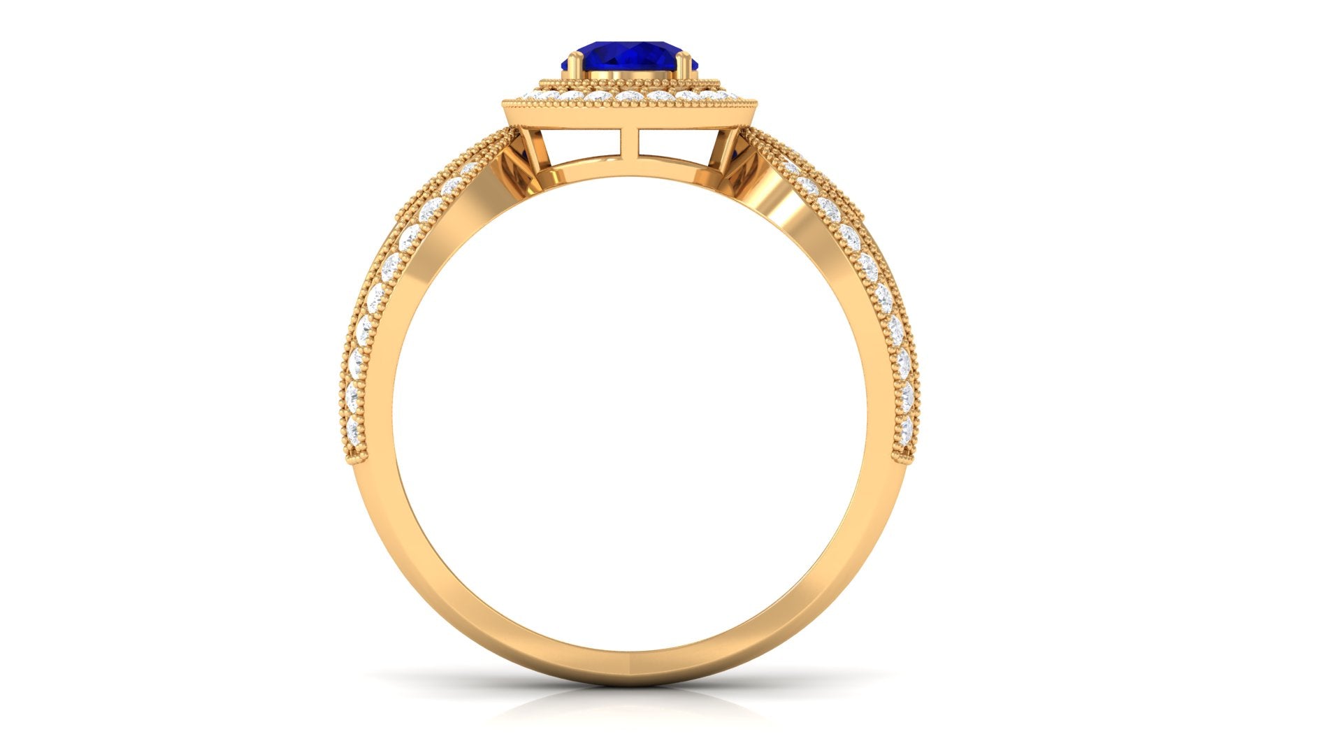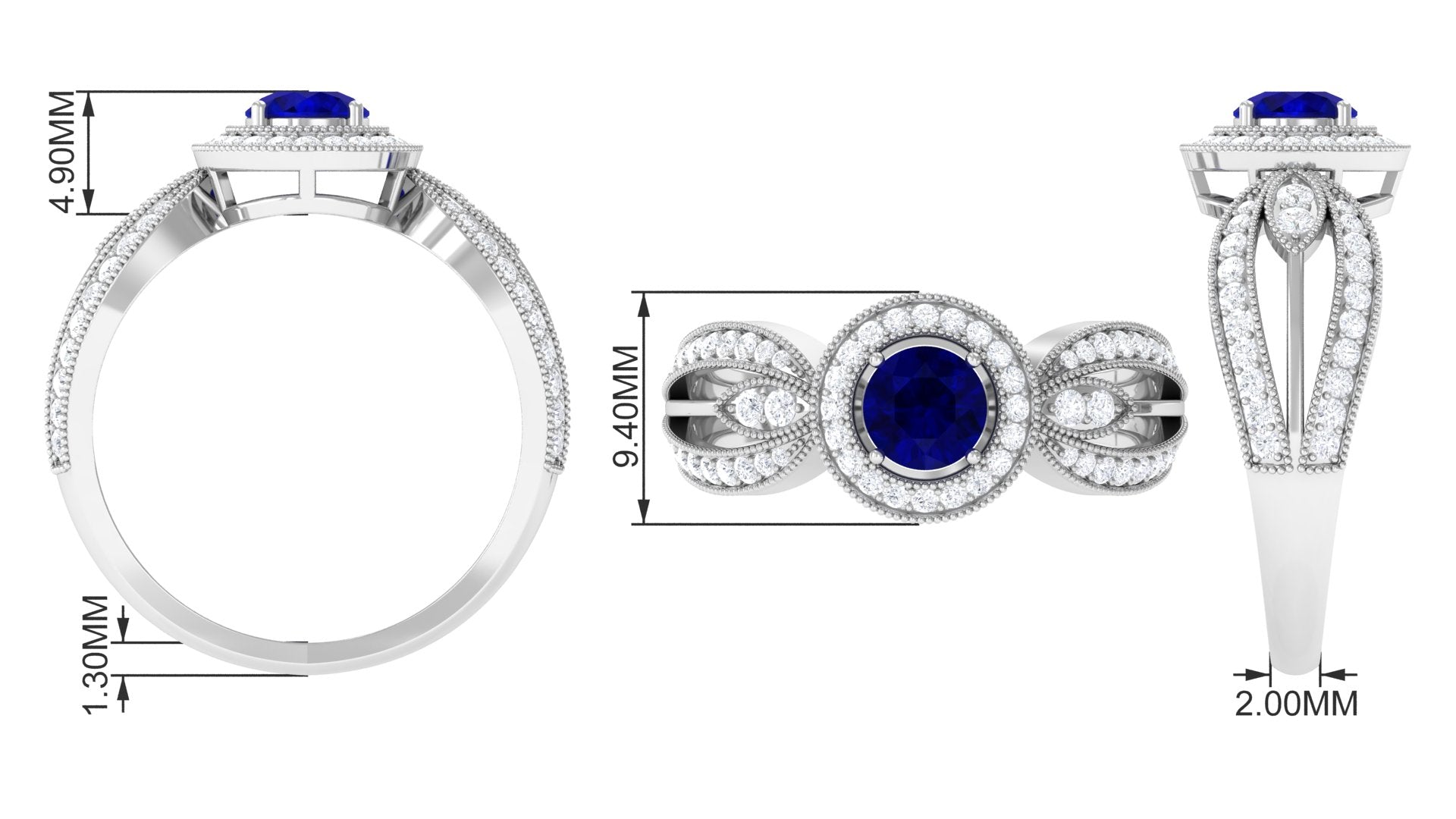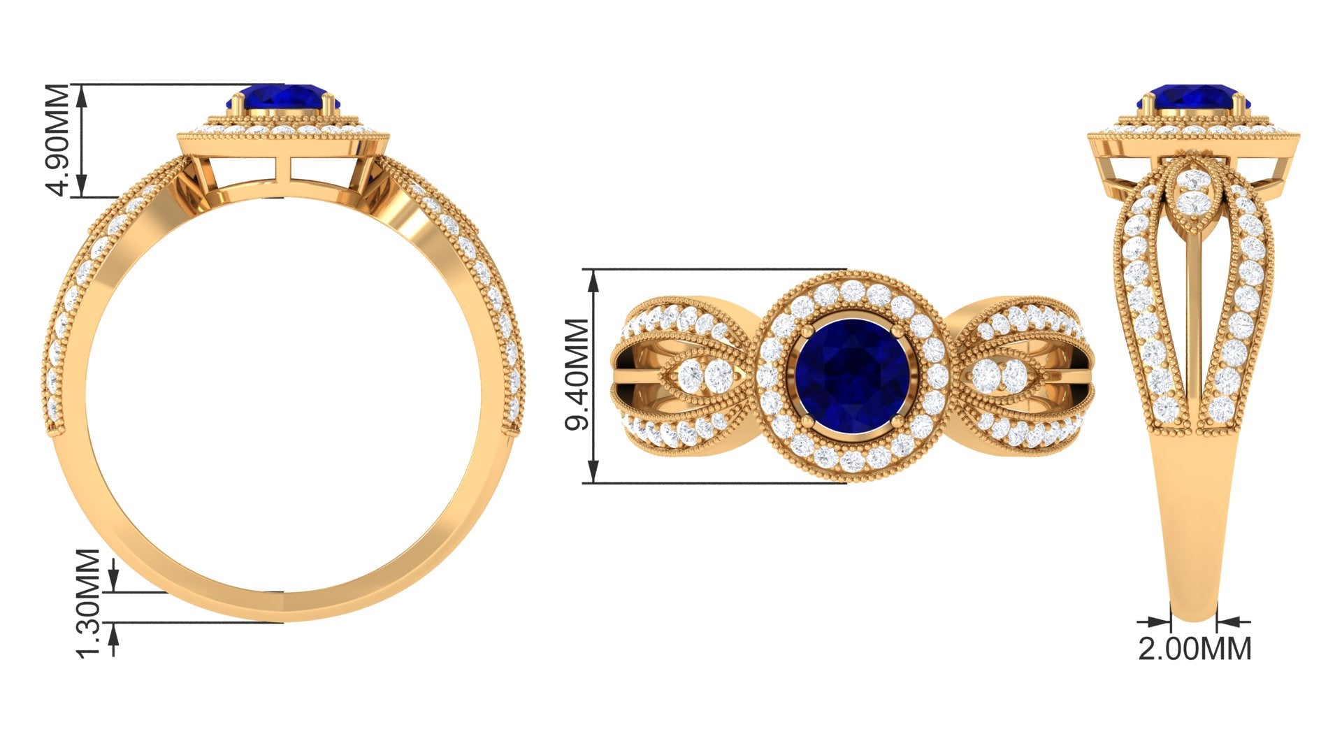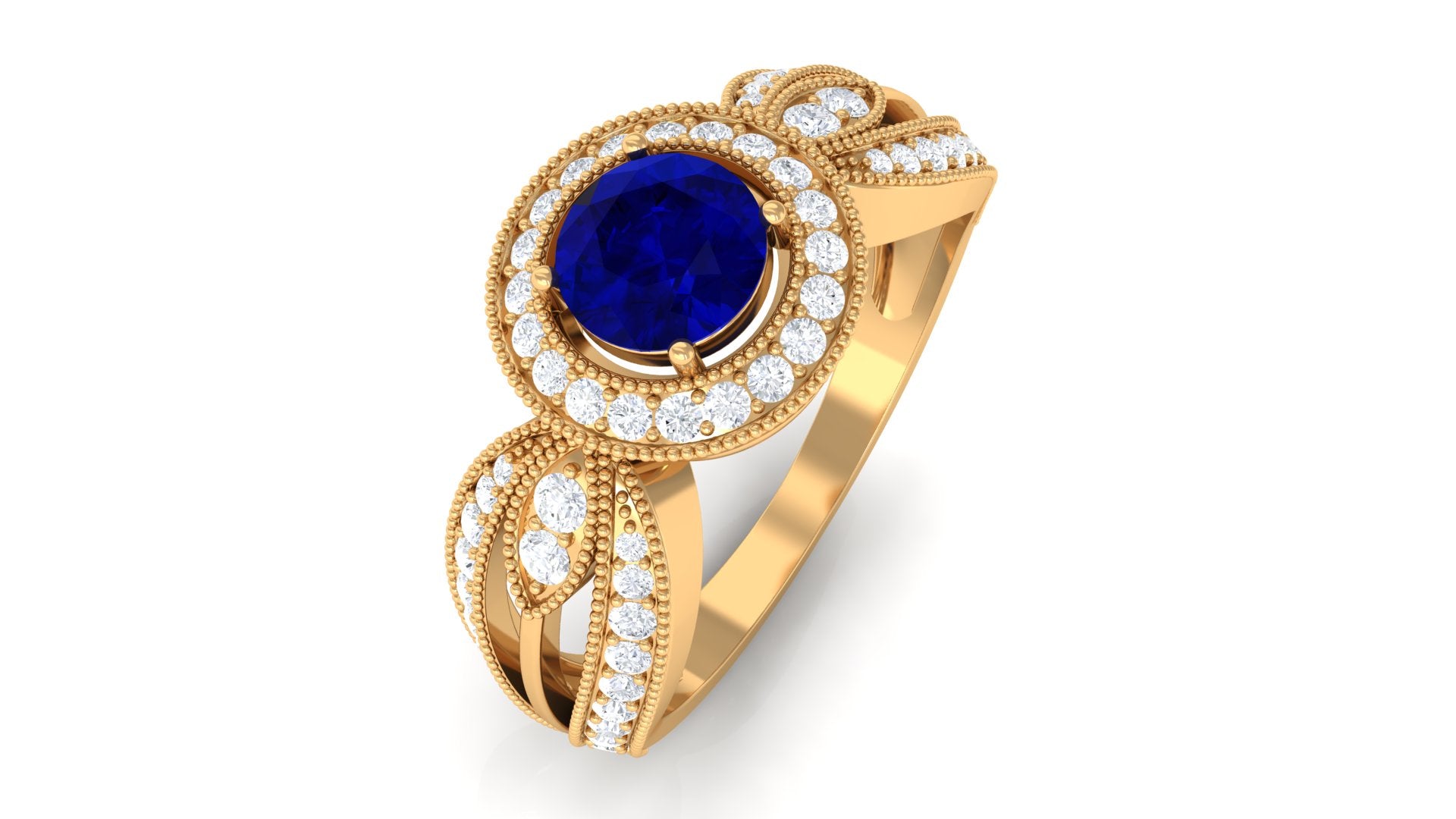 Indulge in the vintage charm of this engagement ring, featuring a captivating blue sapphire center stone on a split shank, elegantly complemented by shimmering Diamond stones and delicate beaded detailing. This intricately designed ring is perfect for brides-to-be who adore timeless and elegant jewelry.