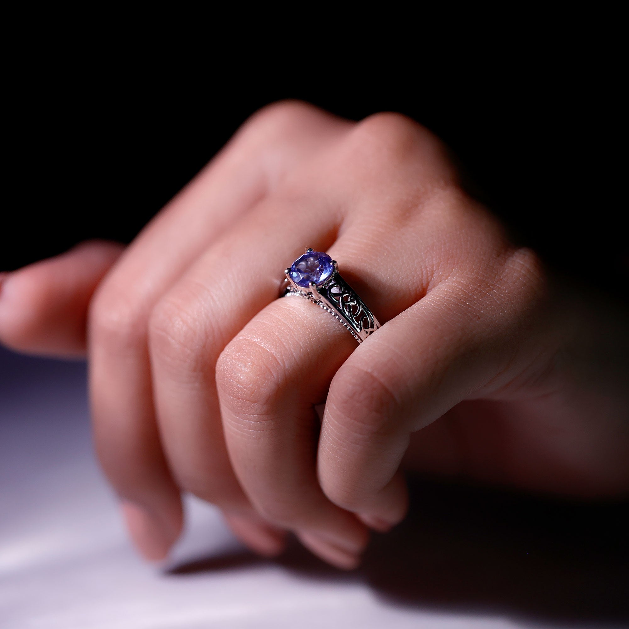 Experience timeless elegance with this exquisite Created Tanzanite Ring, designed to enhance your sophisticated style. The solitaire ring features a 7 MM Round Shape Created Tanzanite gemstone, perfectly complemented by sparkling Diamond and delicate Celtic Knot details. Prepare to be captivated by its beauty, as this ring becomes a cherished piece youll adore endlessly.